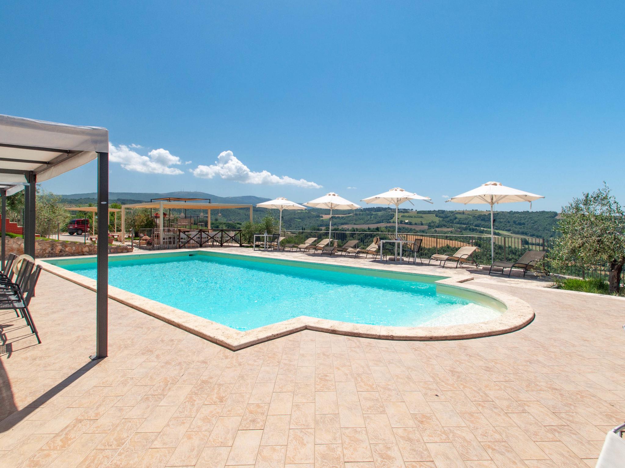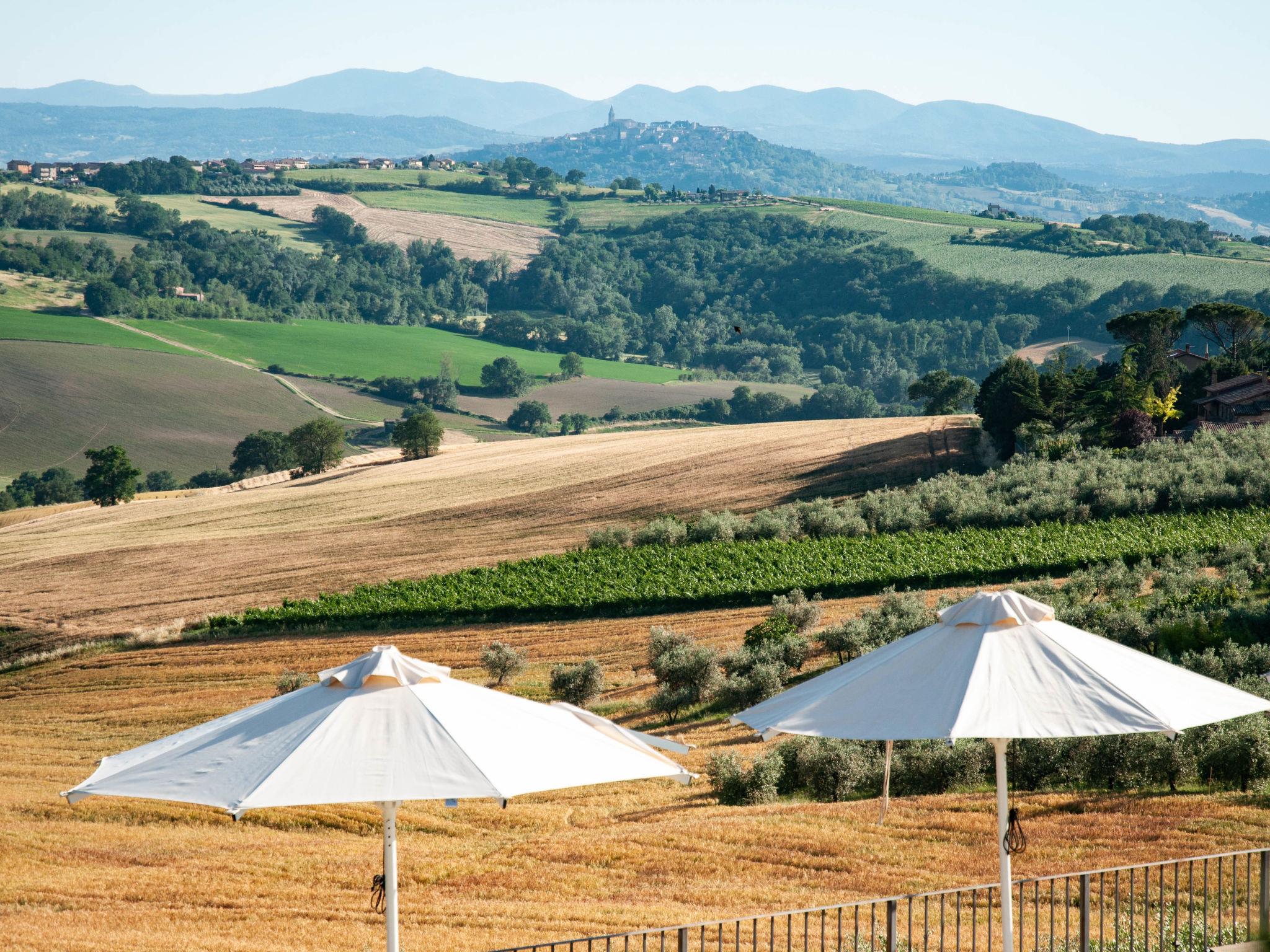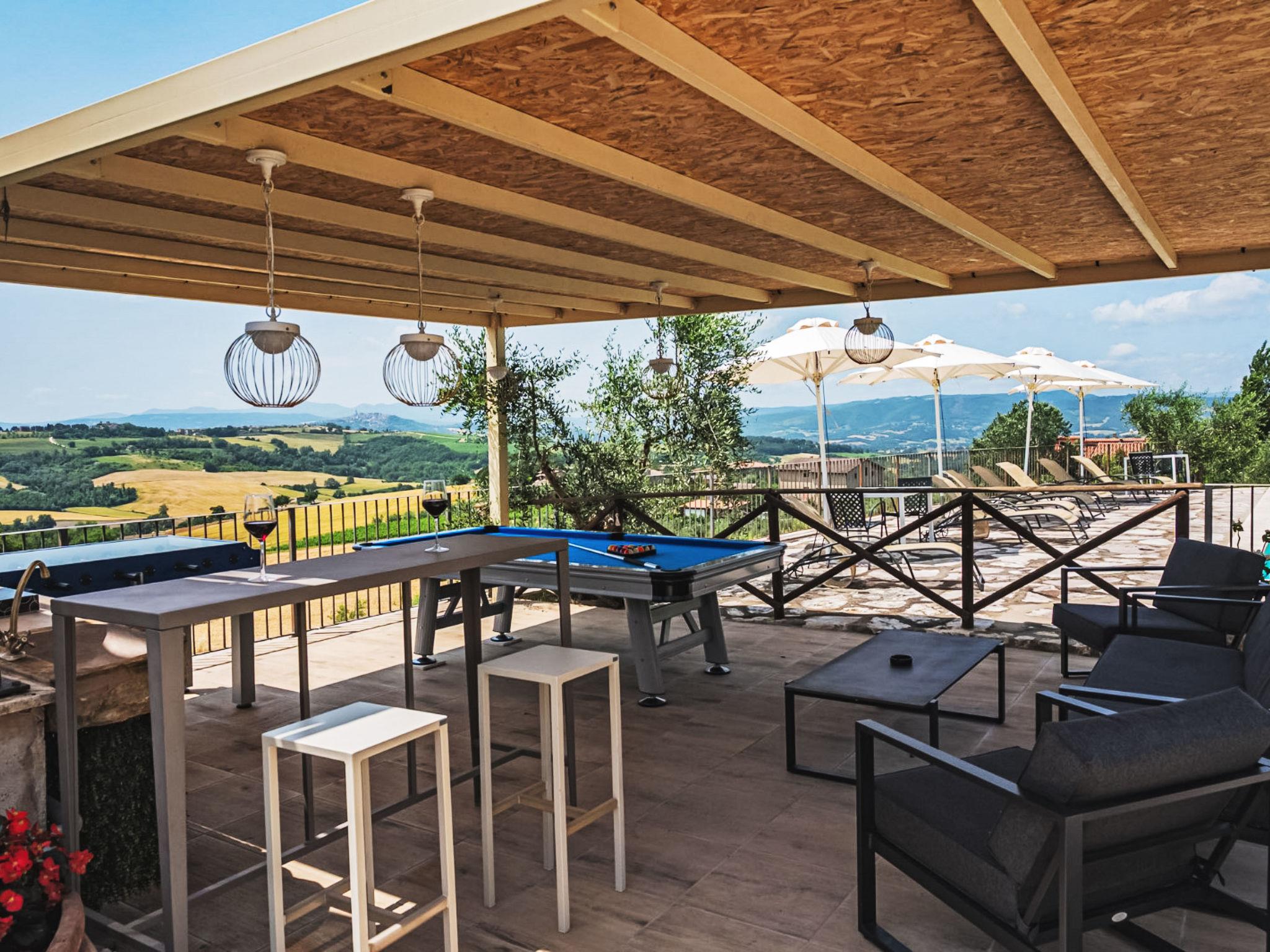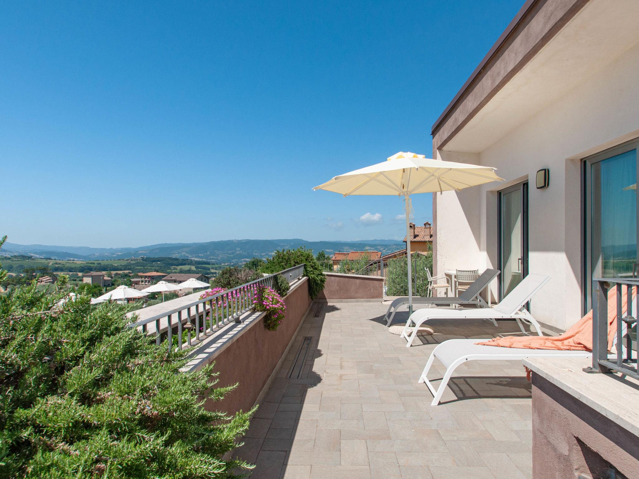 Perfectly integrated in the countryside, this modern, bright and comfortable Villa is ideal for those who want spend a holiday immersed in nature without giving up on comforts. modern, comfortable villa "Futura", 350 m a.s.l., detached, built in 2015, surrounded by fields. 9 km from the centre of Todi, in a sunny position on top of a hill. Private: garden 1'000 m2, swimming pool (6 x 12 m, depth 145 cm, seasonal availability: 07.Apr. - 30.Sep.) with internal staircase. Outdoor shower, patio, garden furniture, barbecue, children's playground. In the house: bicycles available (extra). Available: bicycles (5). Room cleaning daily on request (extra). House maid daily on request (extra). Motor access (100 m via unmade road). Roofed, parking (for 4 cars) at the house. Grocery 3 km, supermarket 6 km, restaurant 3 km, bar 3 km, railway station "Todi (Ponte Rio)" 8 km, bathing lake "Trasimeno" 53 km. Nearby attractions: Bevagna 26 km, Spoleto 37 km, Foligno 30 km, Orvieto 41 km, Perugia 45 km. Please note: car recommended. Baby equipment. Groups of teenagers on request only. Suitable for events.