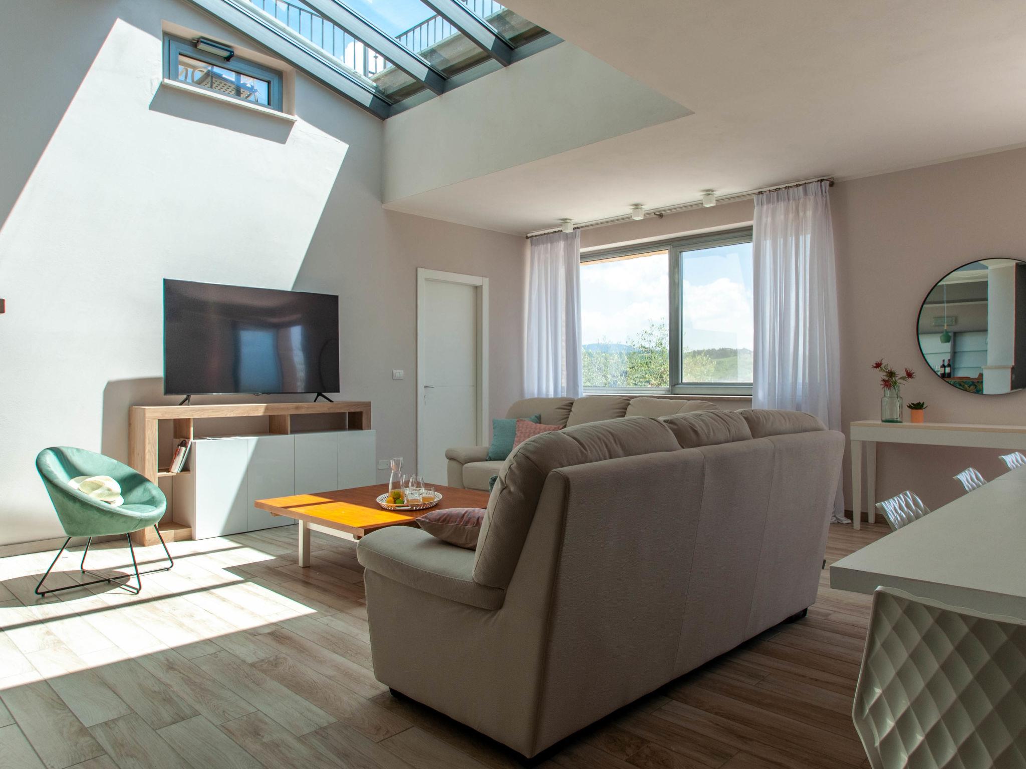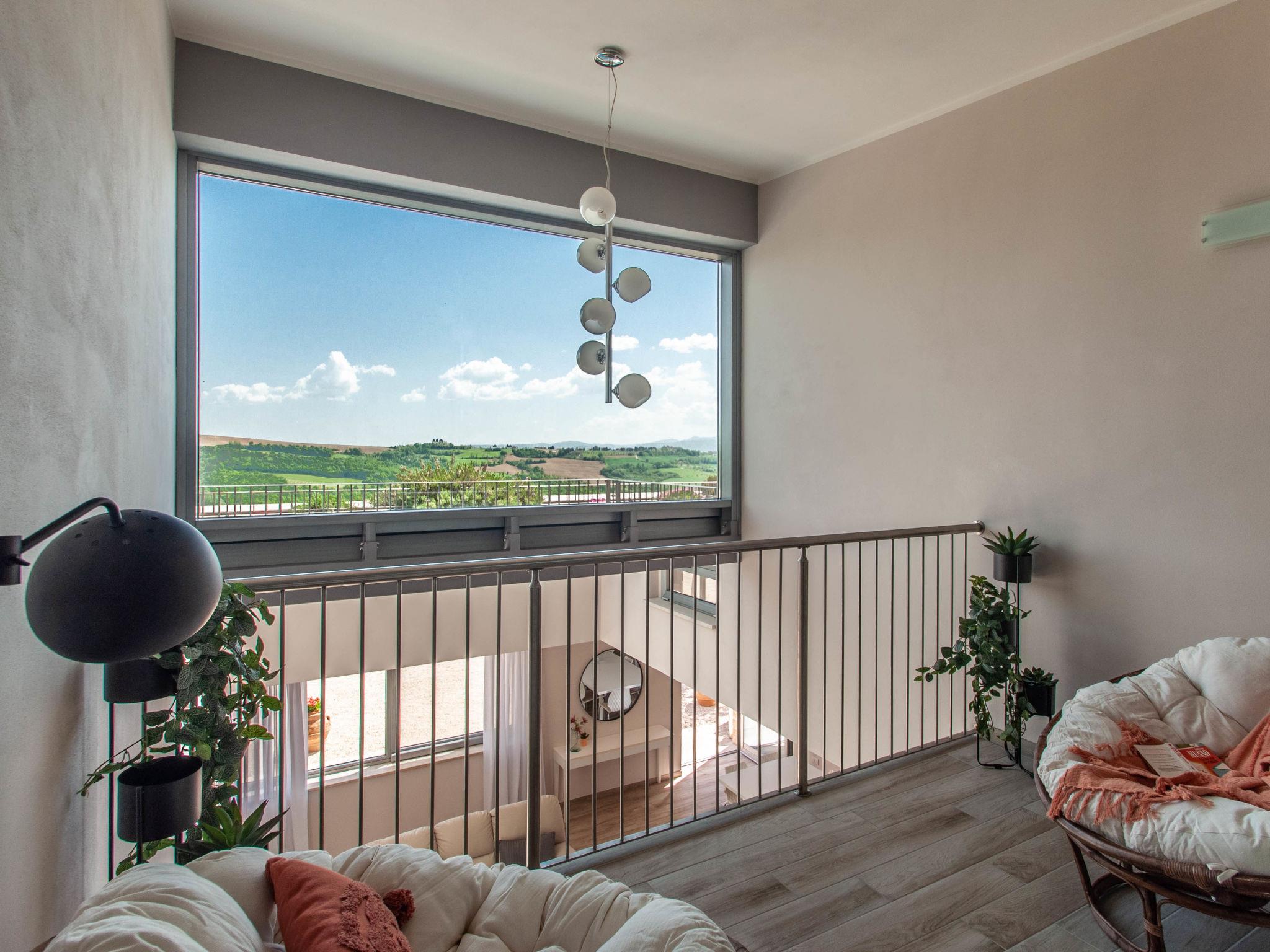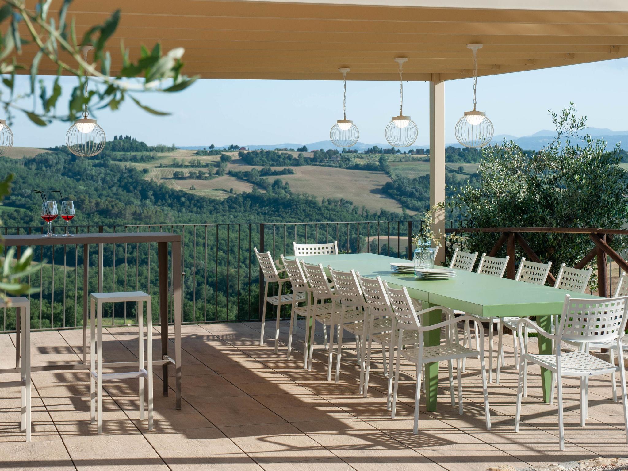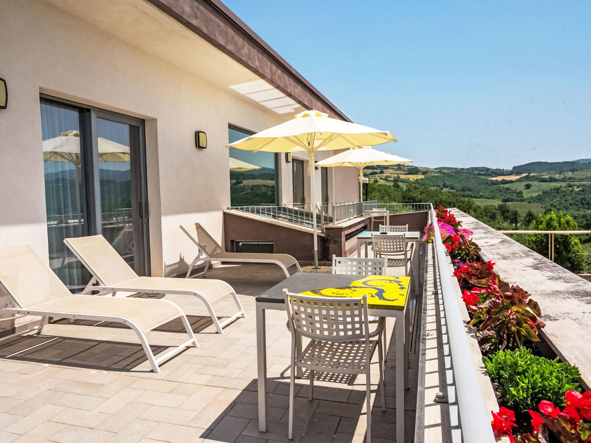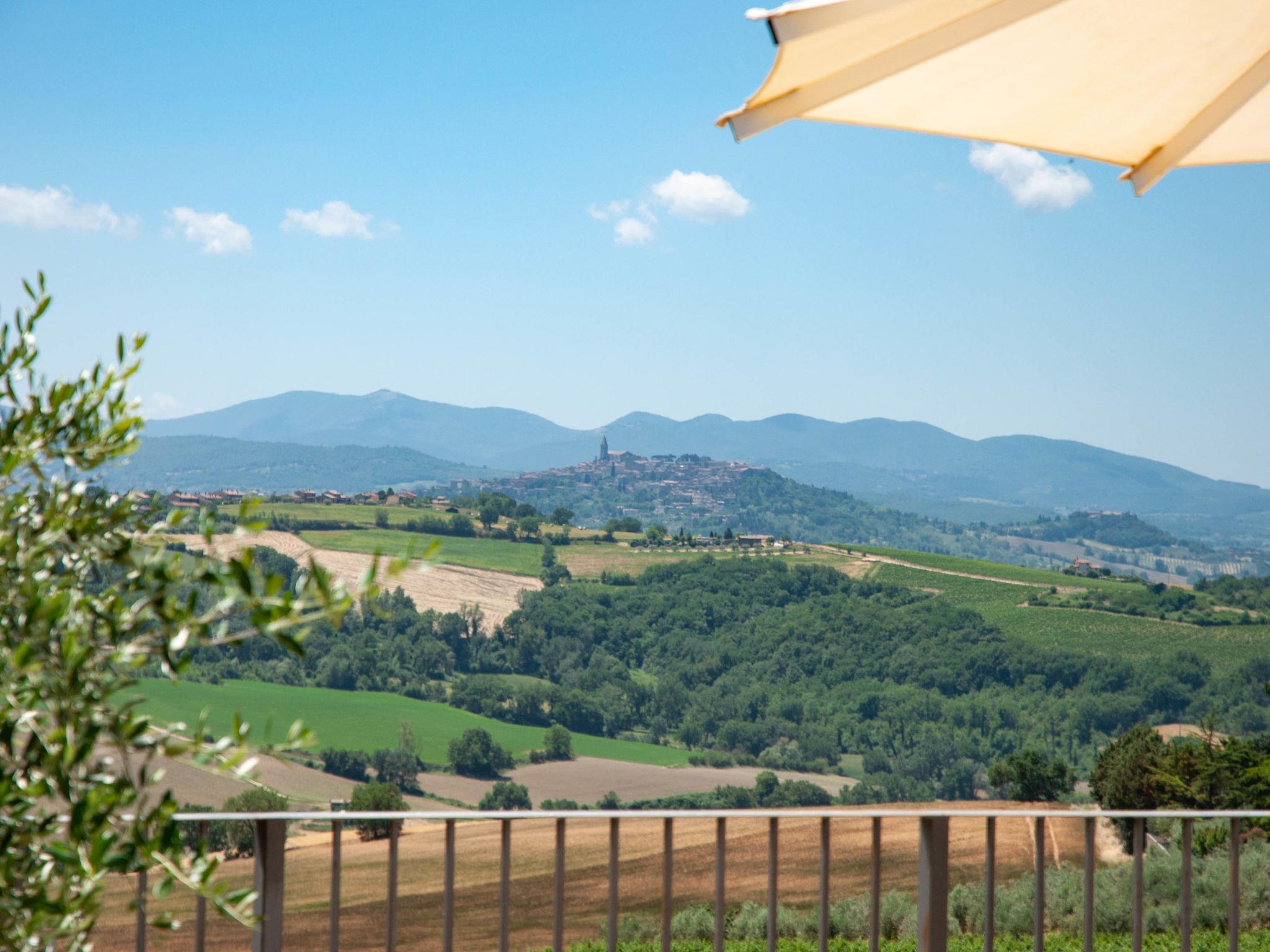 Perfectly integrated in the countryside, this modern, bright and comfortable Villa is ideal for those who want spend a holiday immersed in nature without giving up on comforts. modern, comfortable villa "Futura", 350 m a.s.l., detached, built in 2015, surrounded by fields. 9 km from the centre of Todi, in a sunny position on top of a hill. Private: garden 1'000 m2, swimming pool (6 x 12 m, depth 145 cm, seasonal availability: 07.Apr. - 30.Sep.) with internal staircase. Outdoor shower, patio, garden furniture, barbecue, children's playground. In the house: bicycles available (extra). Available: bicycles (5). Room cleaning daily on request (extra). House maid daily on request (extra). Motor access (100 m via unmade road). Roofed, parking (for 4 cars) at the house. Grocery 3 km, supermarket 6 km, restaurant 3 km, bar 3 km, railway station "Todi (Ponte Rio)" 8 km, bathing lake "Trasimeno" 53 km. Nearby attractions: Bevagna 26 km, Spoleto 37 km, Foligno 30 km, Orvieto 41 km, Perugia 45 km. Please note: car recommended. Baby equipment. Groups of teenagers on request only. Suitable for events.