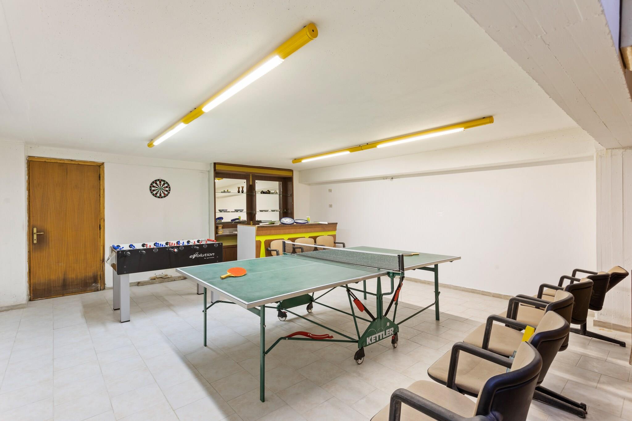 I 3. etasje: (Kjøkken(komfyr med kokeplater, vannkoker, kaffetrakter, stekovn, kjøleskap med fryser), Stue/spisestue(1 persons sammenleggbar seng, TV, spisebord), soveværelse(dobbeltseng), soveværelse(enkeltseng, enkeltseng), bad(dusj, håndvask, toalett, bidet), klimaanlegg) vaskerom(håndvask, toalett, vaskemaskin), treningsrom(Fitness utstyr), oppholdsrom(bordtennis, bordfotball), terrasse, hage(deles med andre gjester), hagemøbler, svømmebasseng(deles med andre gjester, 15 x 7 m., opened from Jun upto and including 1/2 Sep)