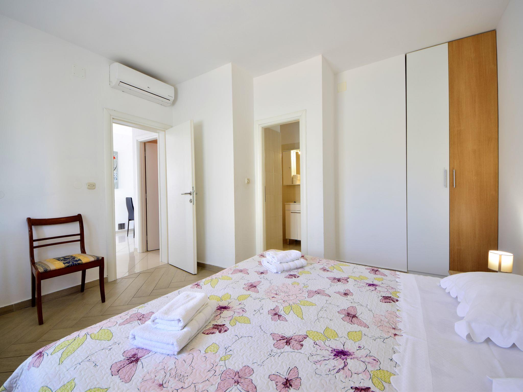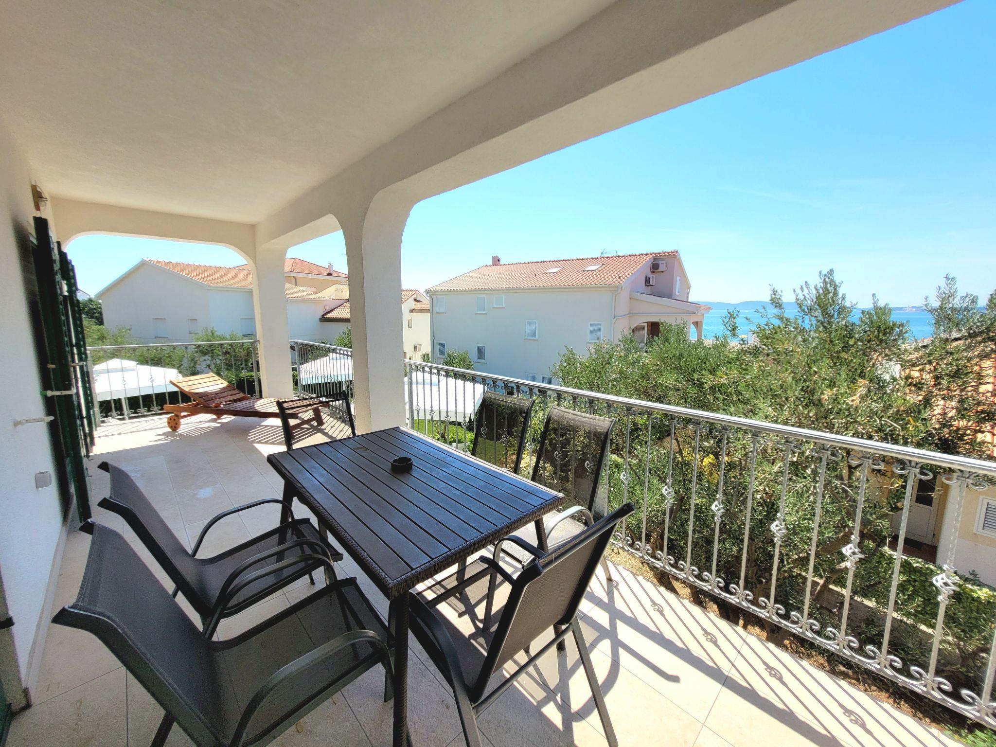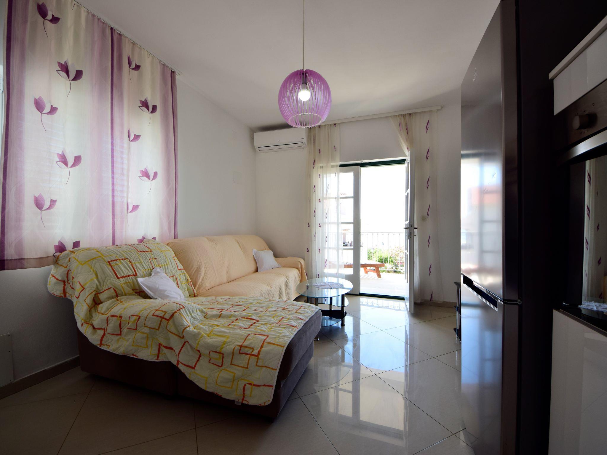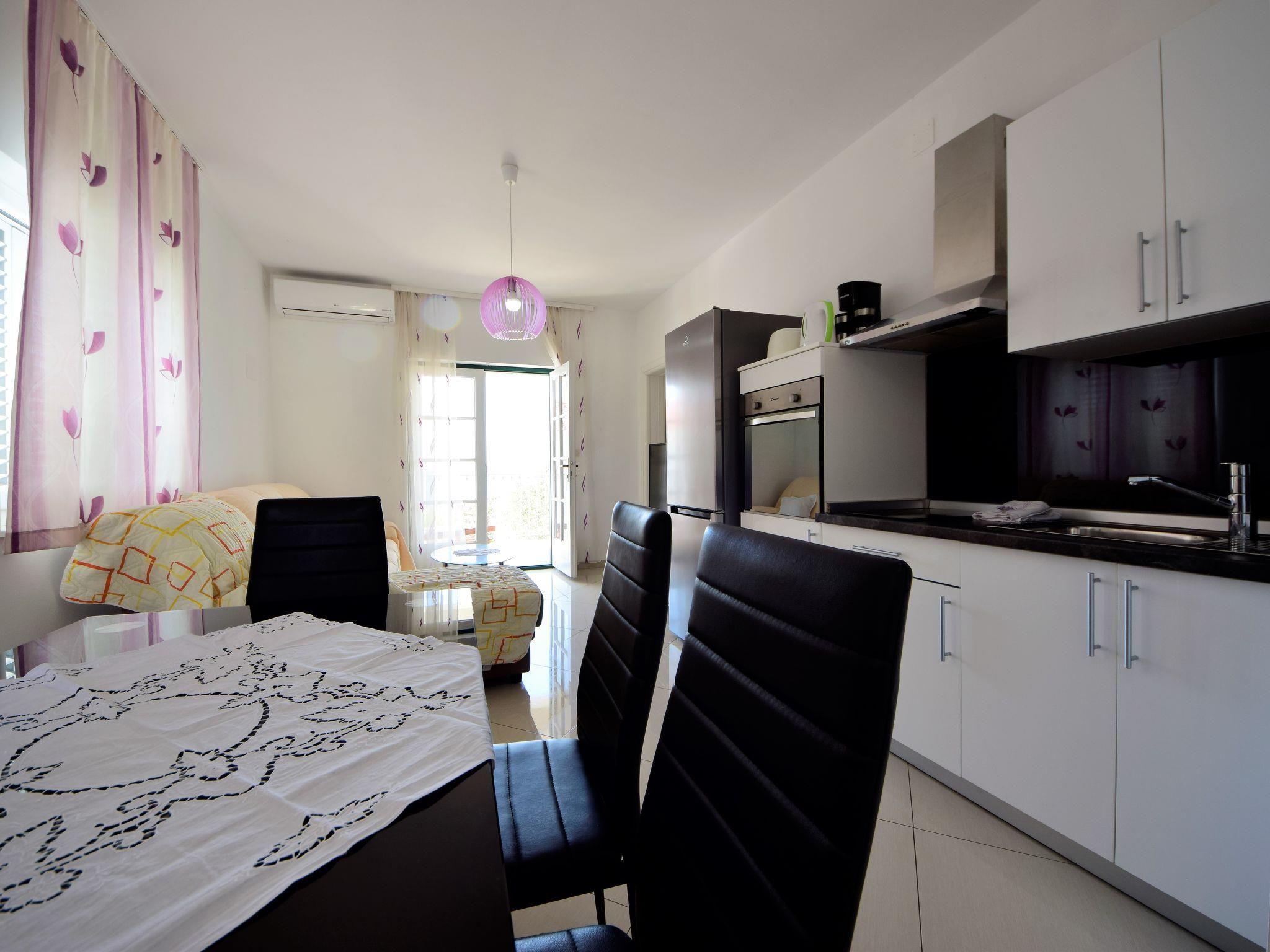 "Katarina 5", 4-room apartment 80 m2 on 1st floor. Living/dining room with satellite TV (flat screen), air conditioning. Exit to the balcony. 1 room with 1 double bed (180 cm, length 200 cm), shower/WC. Exit to the balcony. 1 room with 1 double bed (180 cm, length 200 cm), shower/WC. 1 room with 1 x 2 bunk beds. Open kitchen (oven, dishwasher, 2 ceramic glass hob hotplates, toaster, kettle, microwave, freezer, electric coffee machine). Sep. WC. No heating option. Balcony. Balcony furniture, deck chairs (2). View of the sea. Facilities: Internet (WiFi, free). Parking (2 cars).