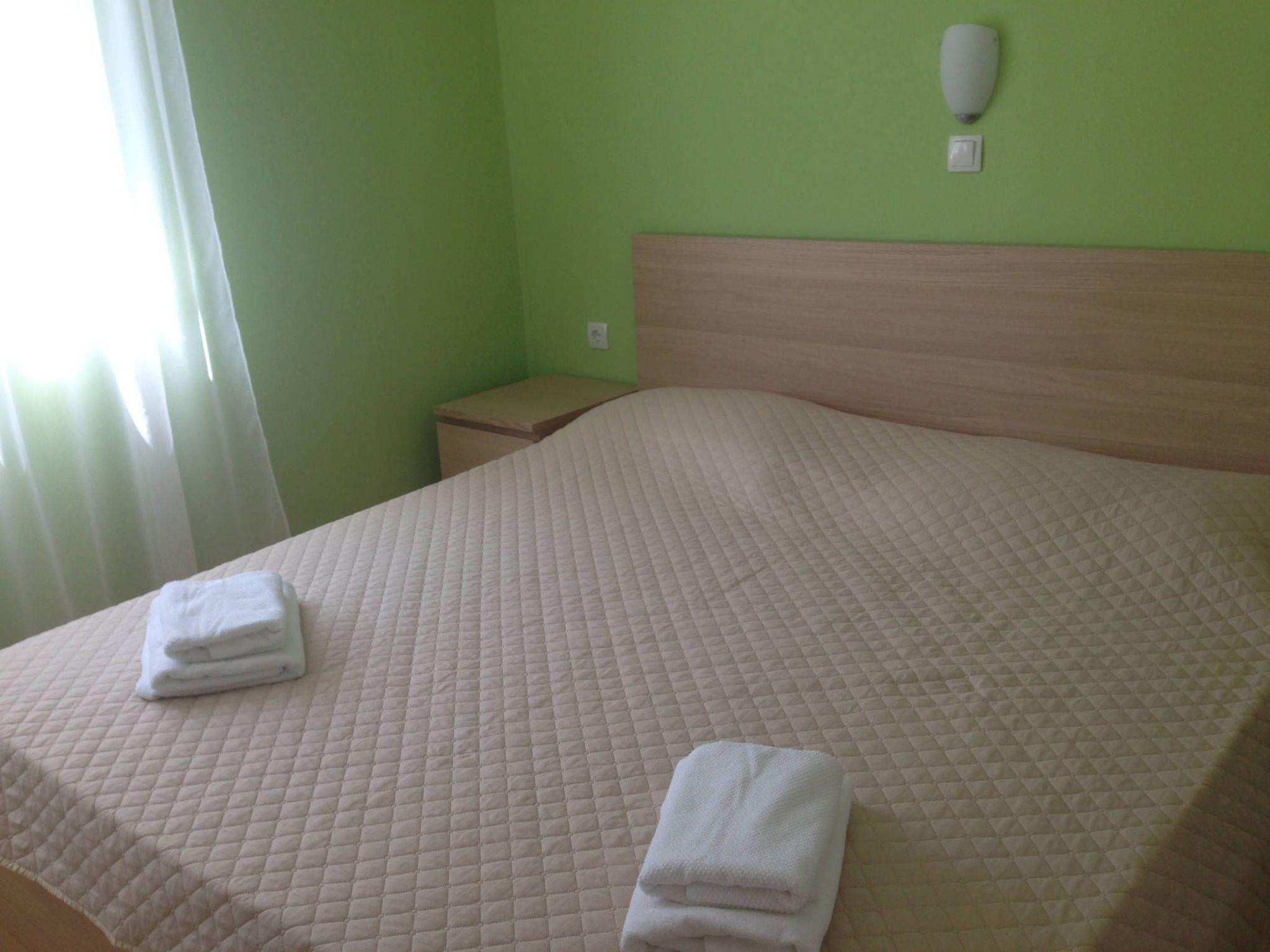 Apartment "Green" consists of two double bedrooms, a living room and a kitchen, two bathrooms with a shower and a toilet and a balcony. The apartment has free wireless internet access, satellite TV and air conditioning. The accommodation is located in a house with several apartments on a plot of 1500 m2, surrounded by a garden full of greenery and flowers, an outdoor swimming pool measuring 9m x 4m with a depth of 1.20m - 1.60m, sun loungers and a loggia. If you want to prepare a meal at home, you can do so in the kitchen equipped with an electric stove, refrigerator, microwave, kettle, coffee maker and dishes. You can also prepare food in the loggia on the outdoor grill which is equipped with dishes, a gas stove and a dishwasher. Both bedrooms are double and can accommodate four adults. You have a reserved parking space in front of the house.