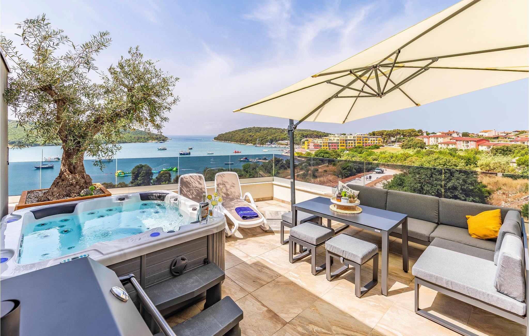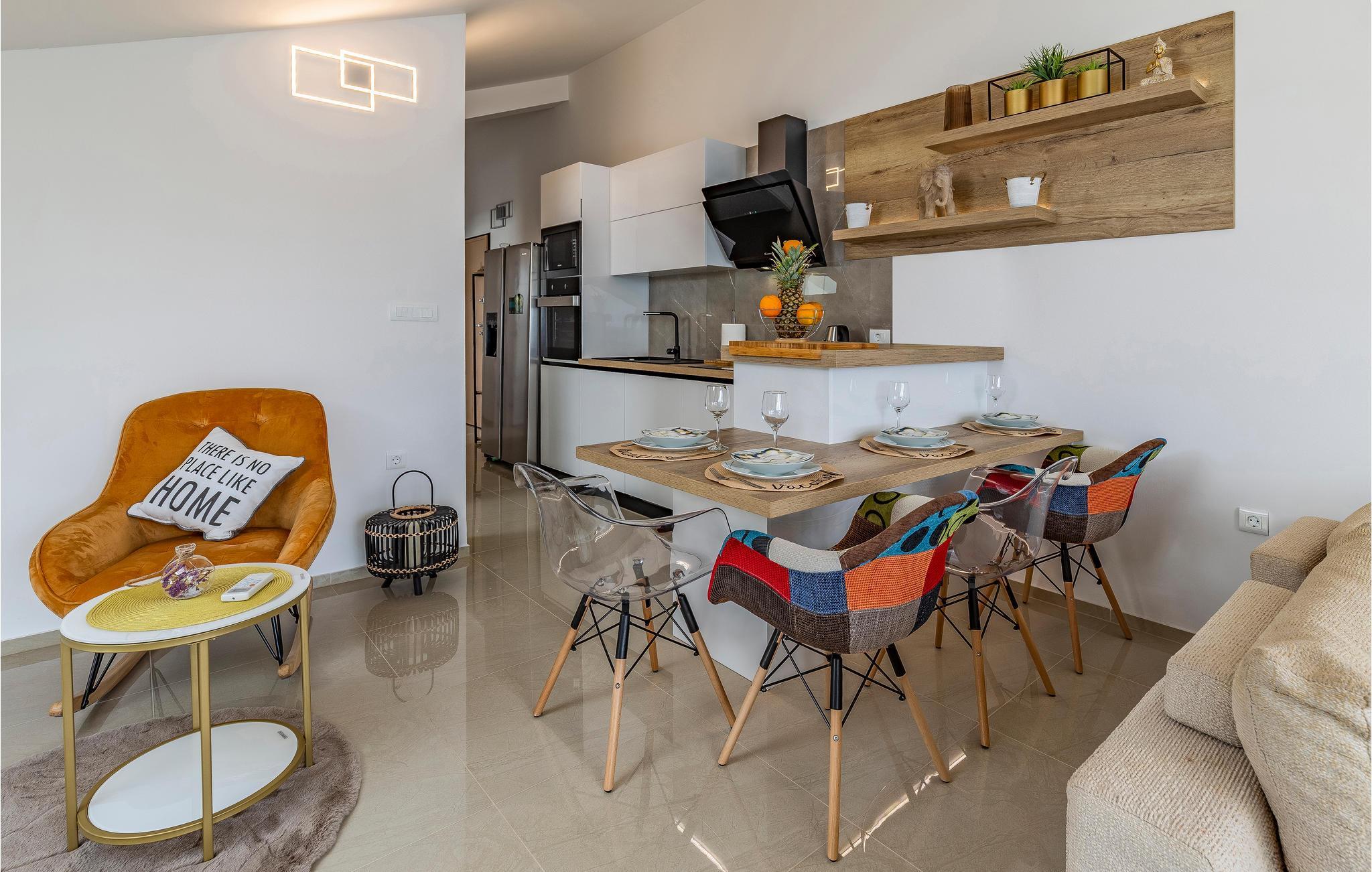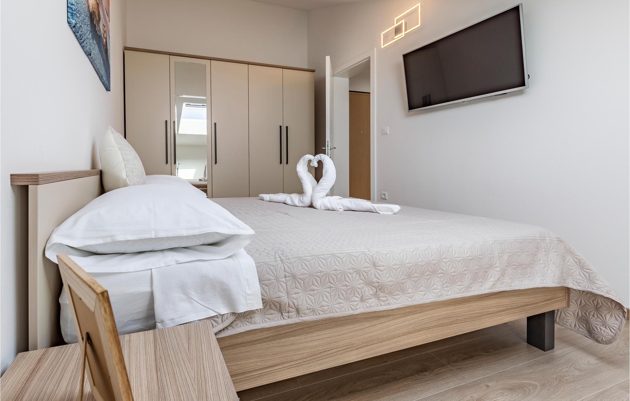 Panoramautsikten over havet, kombinert med et boblebad på terrassen - her finner du ideelle forhold for lange sommerkvelder ute. Leiligheten tilbyr plass i to soverom, et bad og en stue med kjøkken. Det er også et stort felles svømmebasseng i første etasje, slik at du kan kjøle deg ned på varme sommerdager.