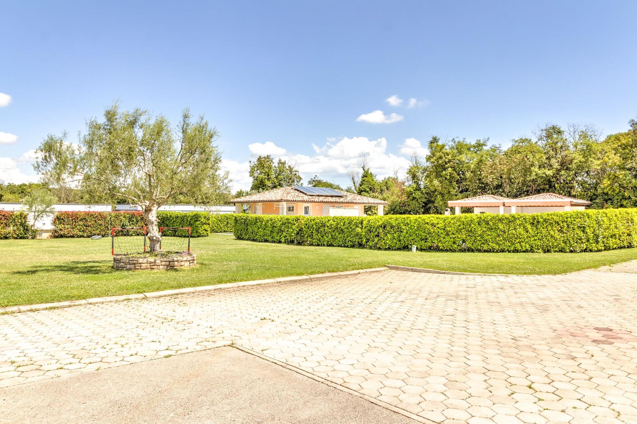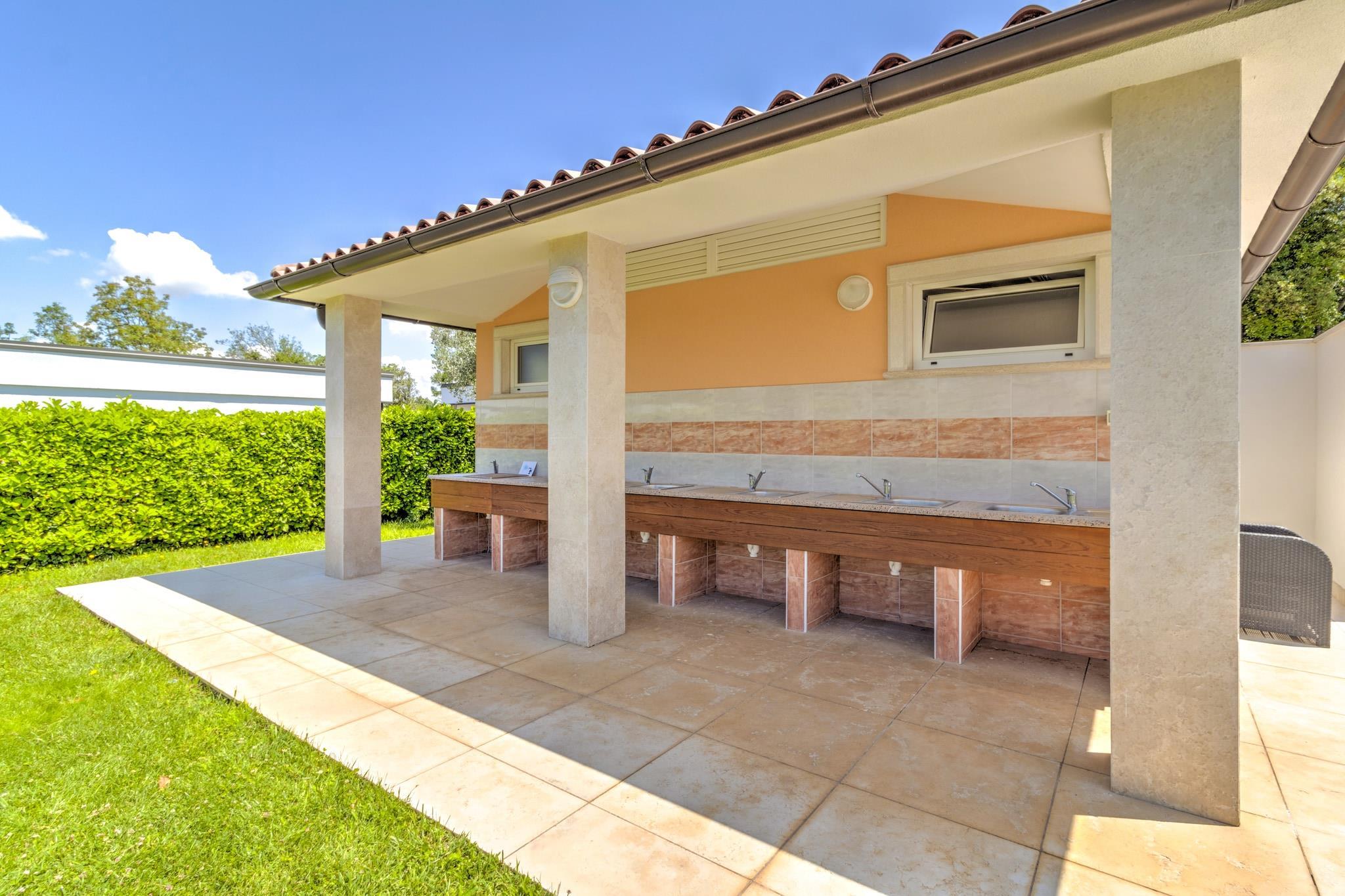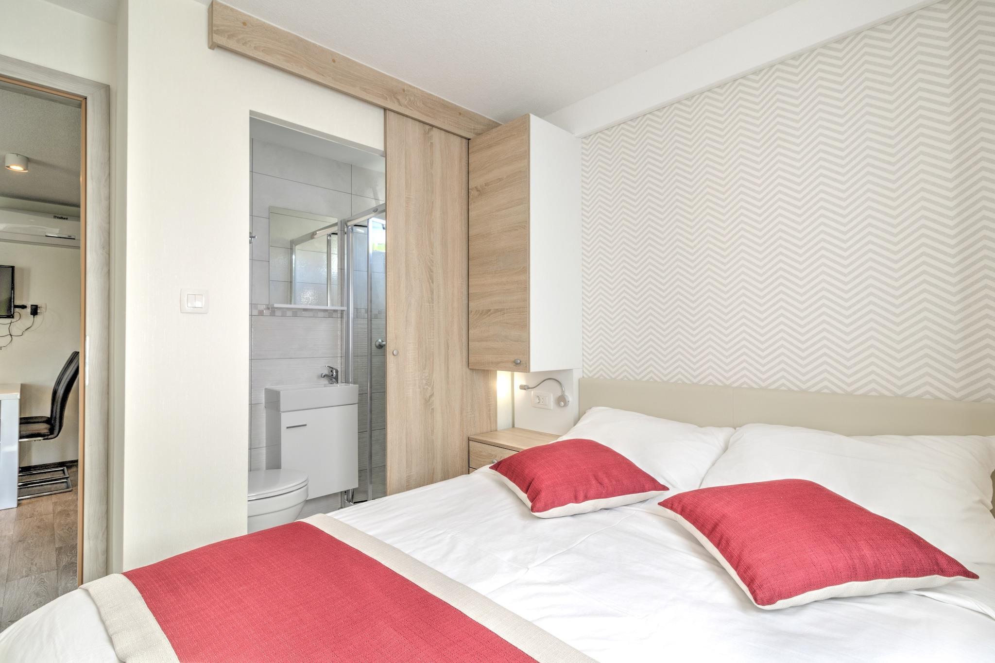 Våkn opp til den milde havbrisen og de beroligende naturens lyder i dette kjæledyrvennlige mobile hjemmet for seks gjester. Dette tilfluktsstedet ligger i Banjole, bare 1 km fra stranden og 2 km fra Pula, og tilbyr en perfekt blanding av avslapning og eventyr. Enten du slapper av på den solfylte terrassen, utforsker historiske landemerker eller unner deg fersk sjømat, er dette kystparadiset designet for uforglemmelige øyeblikk. Innvendig har hjemmet en romslig stue og soverom med en sammenleggbar dobbelseng, TV og klimaanlegg, en velutstyrt kjøkkenkrok med vannkoker, kokende vannkran, kaffemaskin, mikrobølgeovn, oppvaskmaskin og kjøleskap, og et soverom med køyesenger eller to enkeltsenger. Hovedsoverommet har en king-size-seng og et eget bad med badekar eller dusj og toalett, supplert av et ekstra bad for enkelhets skyld. Utendørs kan gjestene slappe av på terrassen med hagemøbler, solsenger og grill, eller nyte trampoline, tennisbane, fotballmål og lekeutstyr. I nærheten viser Augustus-tempelet utsøkt romersk arkitektur, mens Brijuni-øyene tilbyr uberørt natur og historiske skatter. Vandre gjennom Sergii-buen, en praktfull triumfbue fra antikken. For å spise kan du kose deg på Konoba Batelina, kjent for fersk sjømat, eller nyte lokale delikatesser på Barka Bistro. Enten du utforsker historie eller slapper av ... Ved kysten er dette mobile hjemmet det ultimate tilfluktsstedet ved Adriaterhavet.