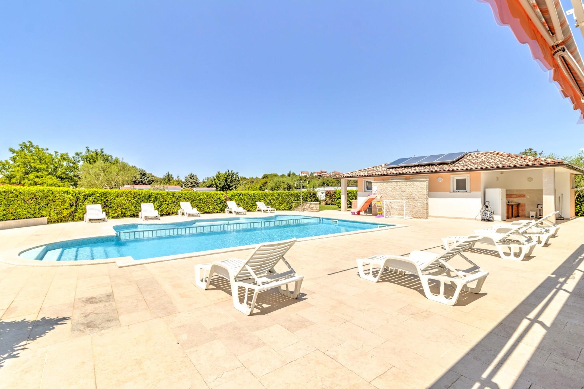 Første etasje: (Åpent kjøkke(vannkoker, vannkran med kokende vann, kaffetrakter, mikrobølgeovn, oppvaskmaskin, kjøleskap), Stue/soverom(2 personers sammenleggbar seng, TV, klimaanlegg), soveværelse(bunk bed or 2 single beds), Sovrum med badrum(king size dobbeltseng, badekar eller dusj, toalett), bad(badekar eller dusj)) terrasse, hage, hagemøbler, solsenge, grill, parkering, trampoline, svømmebasseng(deles med andre gjester), tennisbane, lekeområde, fotballmål