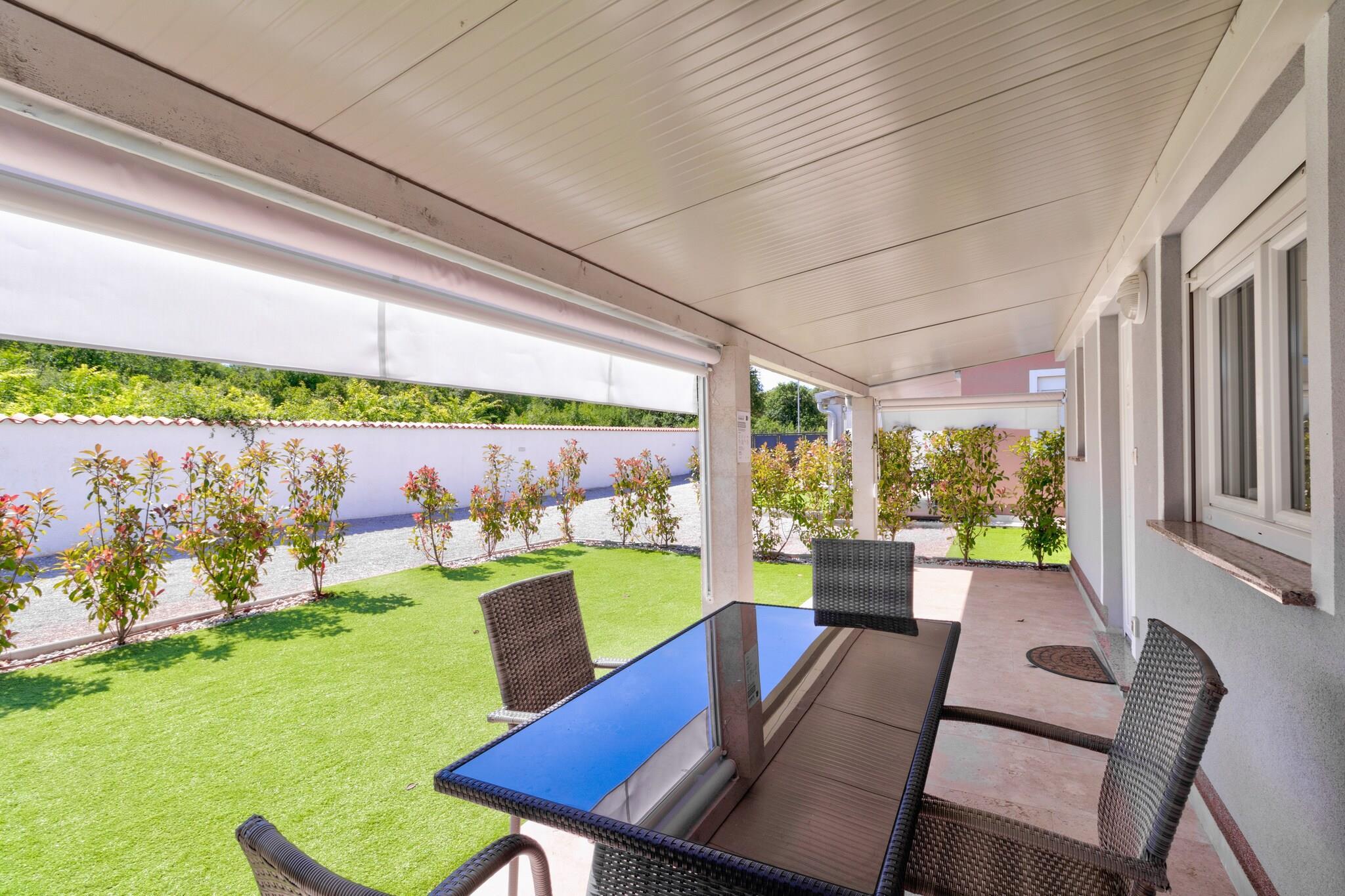 Første etasje: (Kjøkken(vannkoker, vannkran med kokende vann, kaffetrakter, stekovn, mikrobølgeovn, oppvaskmaskin, kjøleskap), Stue/soverom(2 personers sammenleggbar seng, TV, klimaanlegg), soveværelse(bunk bed or 2 single beds), Sovrum med badrum(king size dobbeltseng, badekar eller dusj, toalett), bad(badekar eller dusj)) terrasse, hage, hagemøbler, solsenge, grill, parkering, trampoline, svømmebasseng(deles med andre gjester), tennisbane, lekeområde, fotballmål