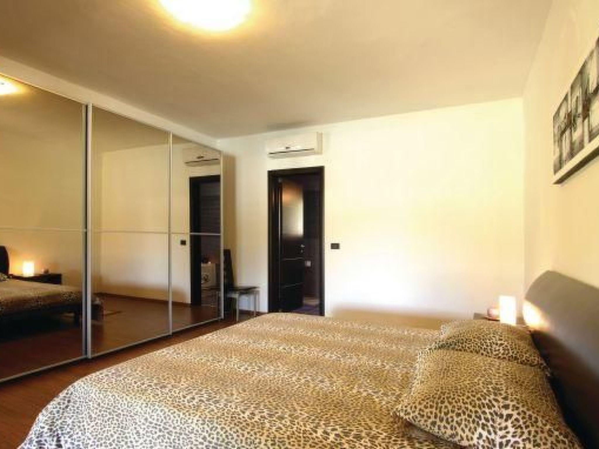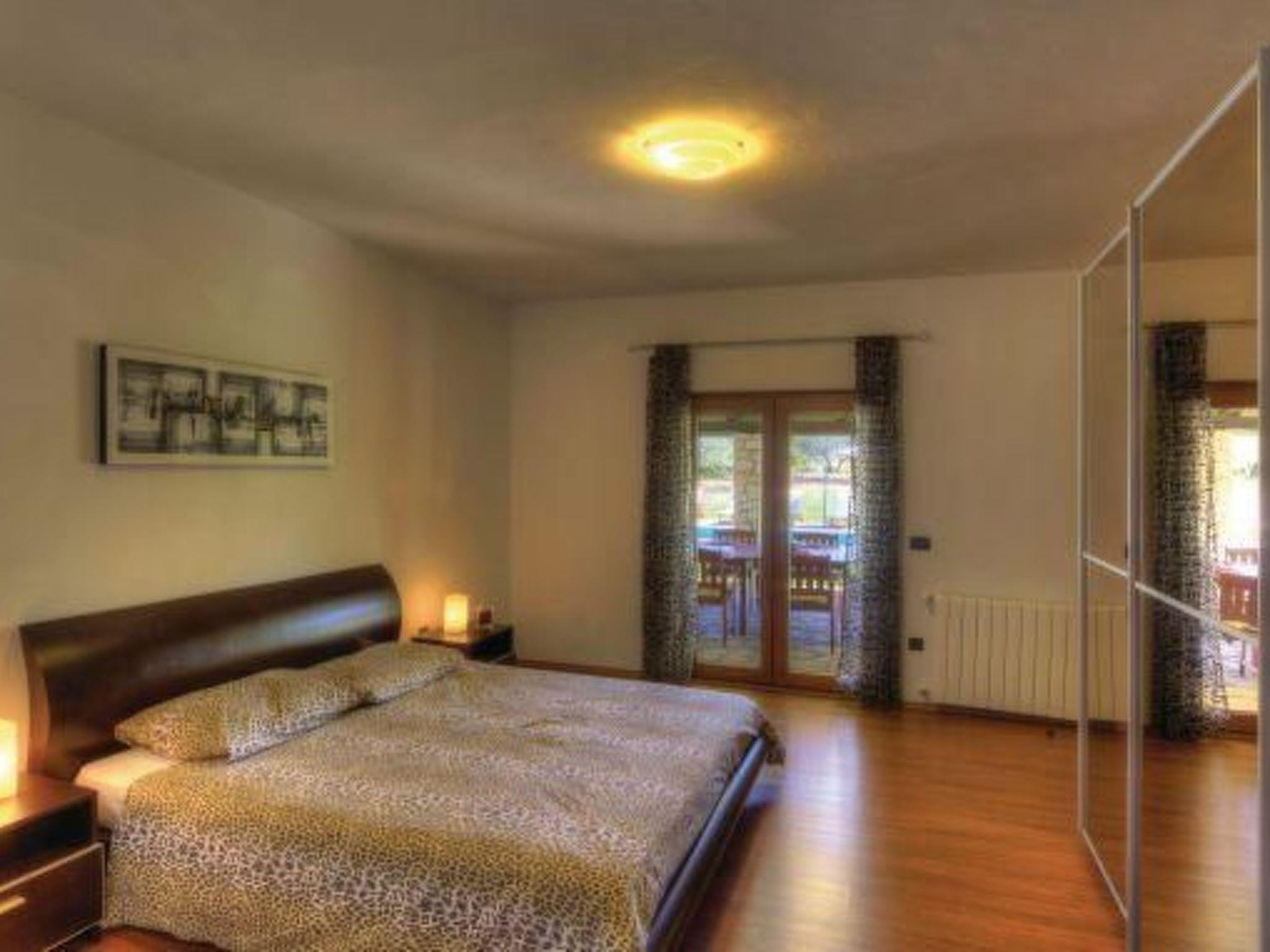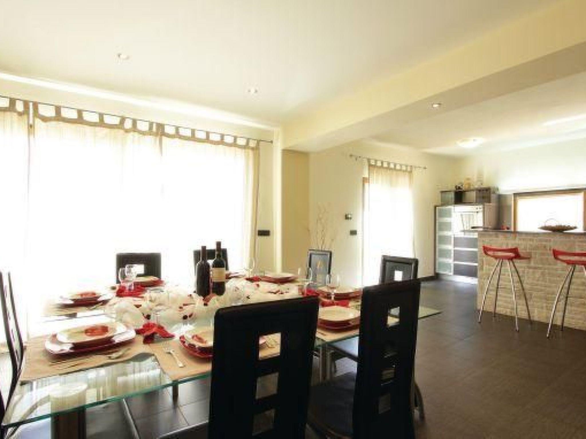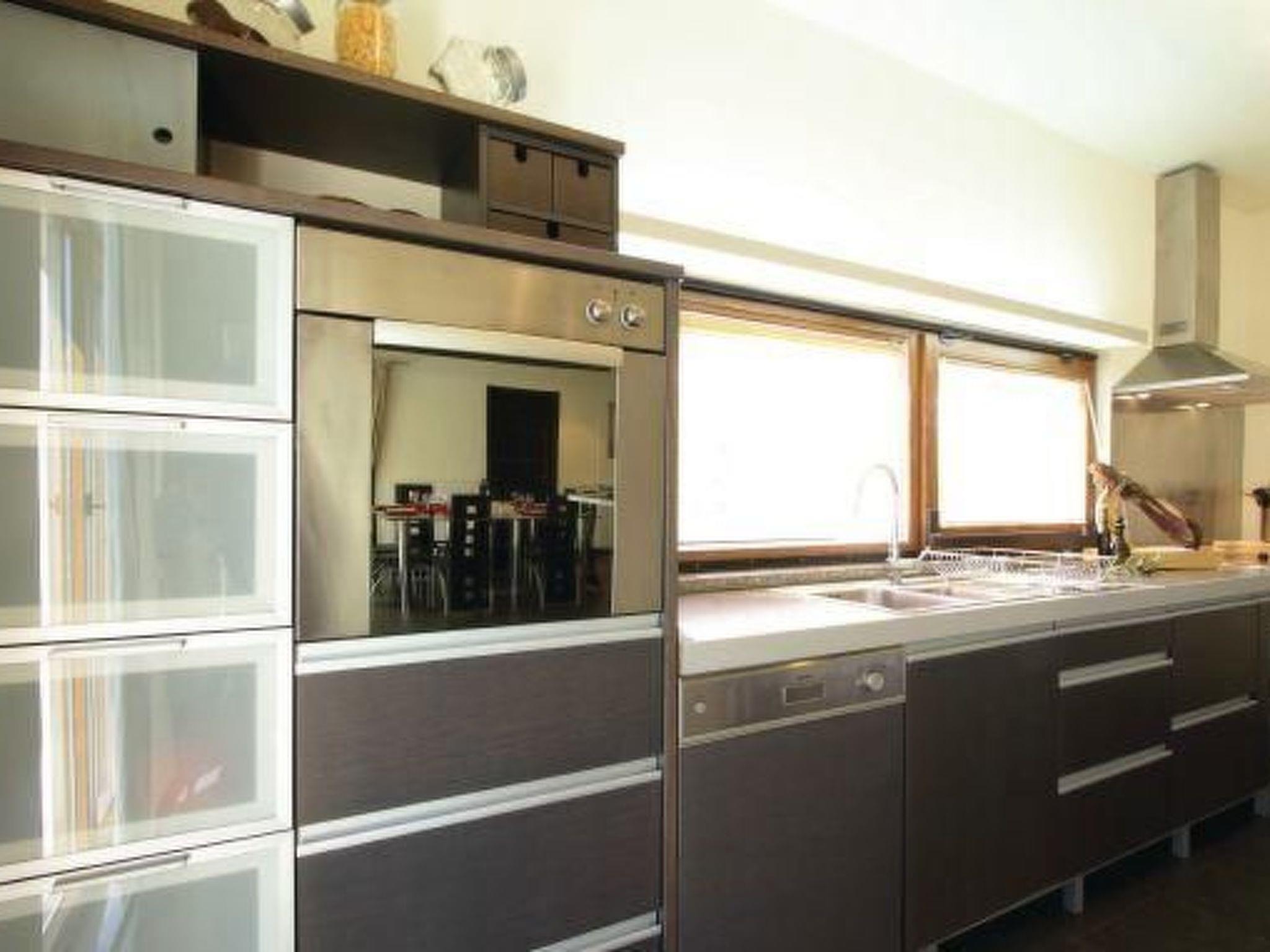 The villa combines modern architecture with traditional Istrian style, which gives the interior a unique charm. There are four bedrooms, of which three have a double bed (180 x 200cm) and one has two single beds (90 x 200cm). Two further supplementary beds (80 x 190cm) and two cots can also be set up if required. All the bedrooms have central air conditioning and heating. Each bedroom has its own bathroom with a shower. The fifth bathroom even has a bath with a whirlpool function. The generous, light living room is furnished with a comfortable, white corner sofa. You can enjoy relaxing hours here in front of the fireplace or watch TV on the flatscreen TV with digital and satellite TV and a DVD player. There is an adjoining dining space with a big glass table and matching, modern chairs for eight people. From here you can see the kitchen counter, where two people can sit on bar stools. The kitchen in a contemporary and modern mocha colour tone is equipped with everything you need, such as a dishwasher, high oven, microwave, kettle and coffee machine. The whole house has wireless Internet access.