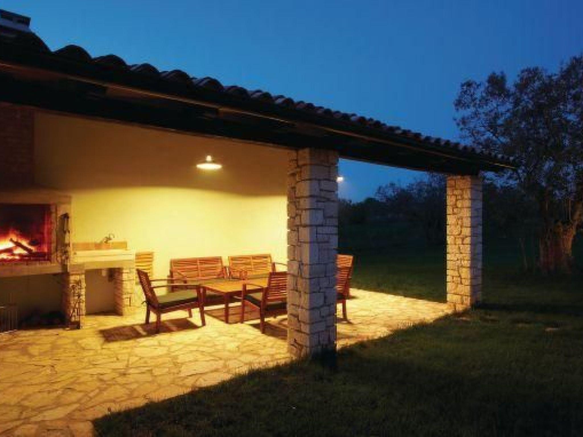 The big glass sliding door opens onto the enormous garden planted with olive trees. There is a roofed terrace furnished with a table and chairs. Above it there is a big balcony, accessed from one of the bedrooms. There is a second, roofed terrace next to the house, which also has a built-in stone grill, which you can use not only for preparing meals, but also as a fireplace in the evening. There is also an outdoor toilet that can be used during the day when spending time by the pool. The terraces look out at the 40m² pool, which is illuminated in the evening. The pool, the sun loungers and parasol are the centrepiece of the outdoor area. Children will enjoy the trampoline and a lawn for playing football or badminton. There are three parking spaces in front of the house. The owner allows pets on the fenced site on request.