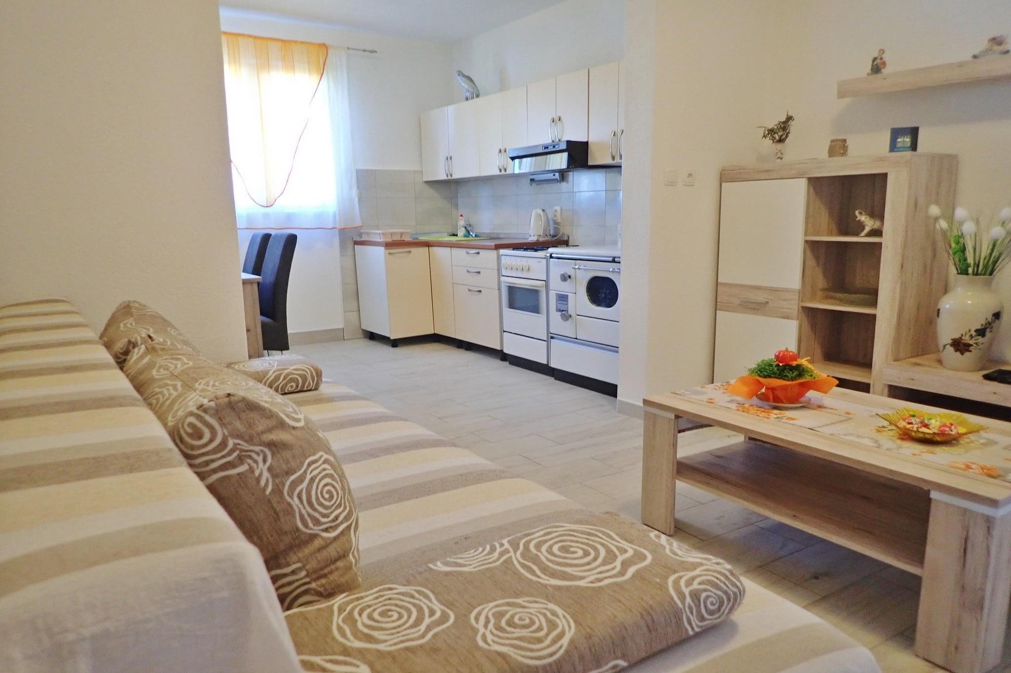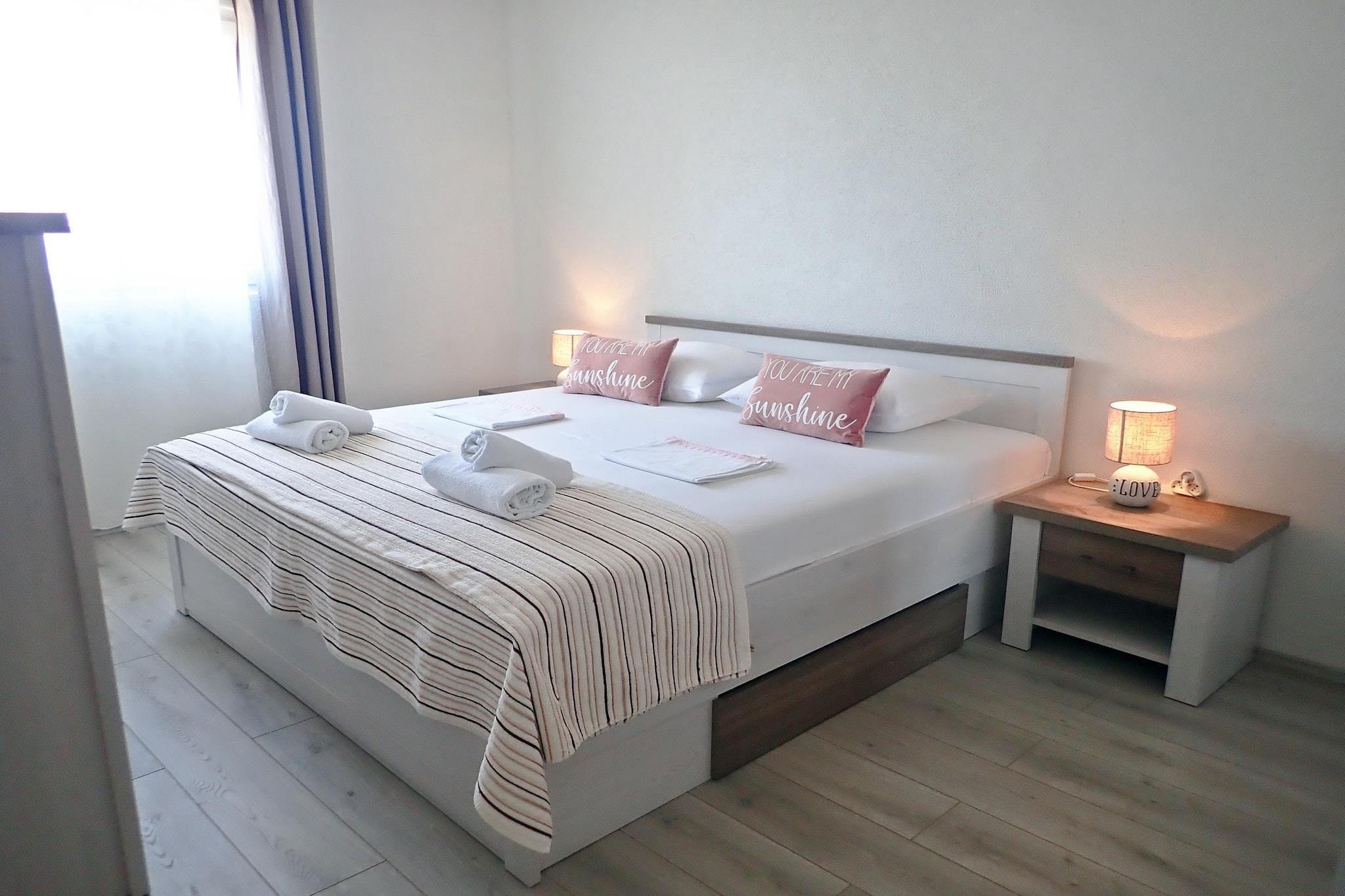 Denne leiligheten ved sjøen ligger i det rolige kystområdet Sveta Marija Magdalena nær Karlobag, og tilbyr uforstyrret havutsikt og et fredelig tilfluktssted langs Kroatias Adriaterhavskyst. Beliggenheten er ideell for familier eller små grupper, og preges av de uberørte naturomgivelsene, der fjellene møter havet og livet går i et roligere tempo. Leiligheten har to soverom med dobbeltsenger, samt en separat sovesofa i stuen, og har komfortabel plass til opptil 6 gjester. Leiligheten har klimaanlegg, TV, spiseplass og eget bad med dusj. Det fullt utstyrte kjøkkenet har ovn, komfyr, kjøleskap, vannkoker og nødvendig kjøkkenutstyr, slik at du enkelt kan lage mat selv. Gratis Wi-Fi er tilgjengelig overalt på eiendommen, og sengetøy og håndklær er inkludert for et problemfritt opphold. Utenfor kan gjestene nyte en møblert terrasse eller balkong med vidstrakt havutsikt, noe som skaper perfekte rammer for avslappede morgener eller kvelder. Eiendommen har også et hageområde og uteservering, med grillfasiliteter tilgjengelig for uformelle måltider. Parkering er tilgjengelig i nærheten, og beliggenheten ved vannkanten plasserer deg bare noen skritt fra havet, ideelt for svømming, fiske eller bare for å slappe av ved kysten. Leiligheten ligger i kjøreavstand fra Paklenica nasjonalpark, et populært reisemål for fotturer og naturutforsking. Området rundt er stort sett uberørt, noe som gir en mer tilbaketrukket opplevelse med få mennesker, mens du finner det du trenger av dagligvarer og lokale spisesteder i den større Karlobag-regionen. Med direkte tilgang til sjøen og den naturskjønne beliggenheten er dette oppholdet godt egnet for reisende som søker et rolig tilfluktssted ved kysten.