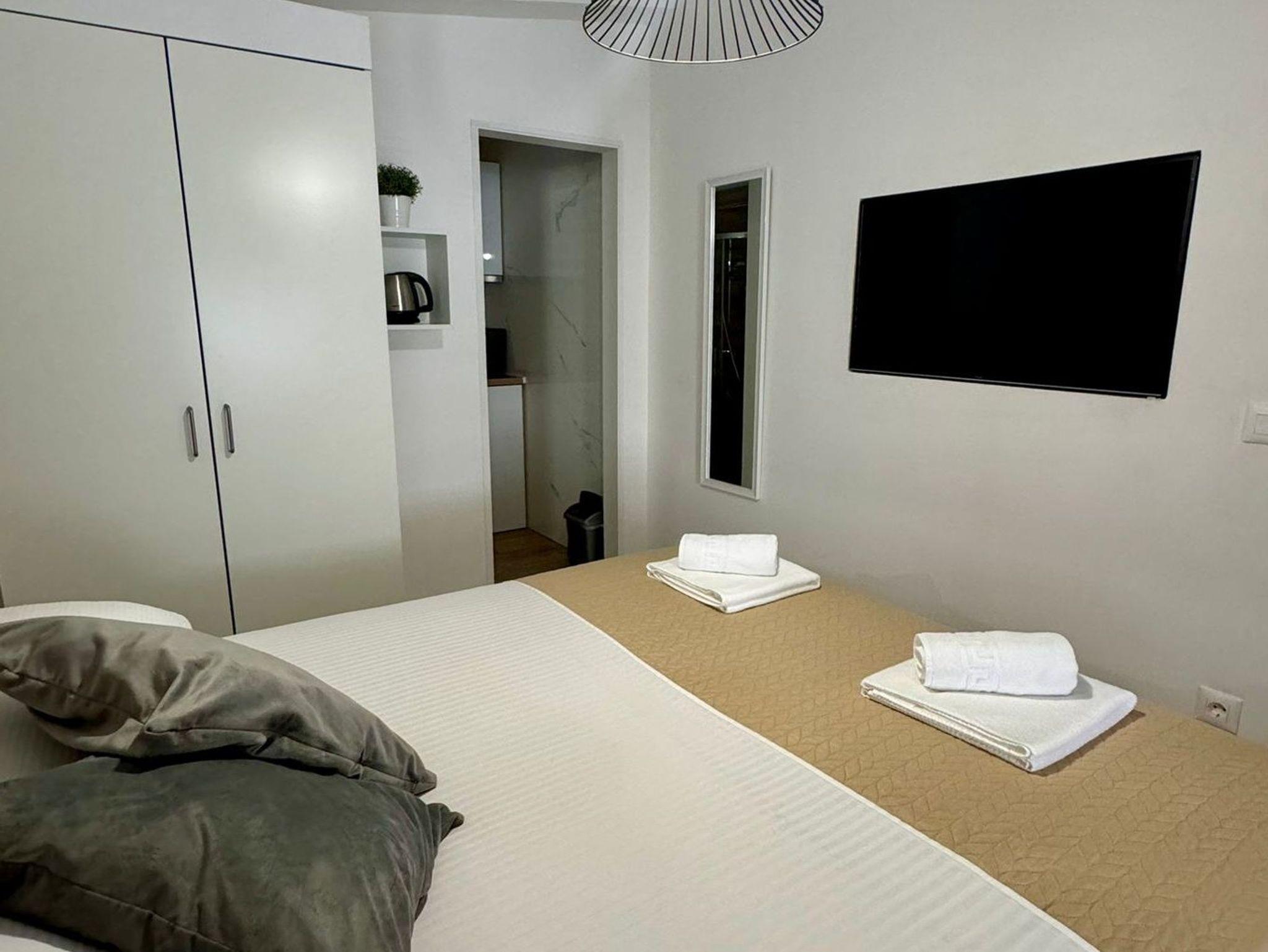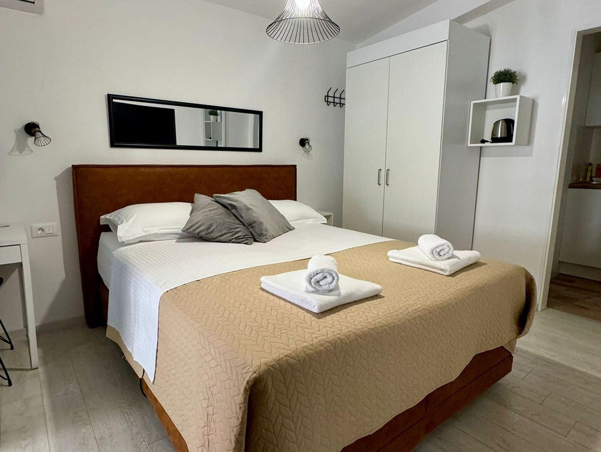 Studio bietet Platz für 2 Gäste. Die Betten sind in Schlafzimmern, die es 1 gibt, innerhalb einer Gesamtfläche von 13m2, angeordnet. Die Gäste haben eine eigene Terrasse zur Verfügung, auf der sie in warmen Sommernächten genießen können. Das Studio-Apartment bietet Meerblick. Es ist erlaubt, Speisen auf dem Gemeinschafts-Grill vorzubereiten. IM PREIS INBEGRIFFEN: Kurtaxe, Endreinigung, Klimatisierung, Parkplatz, Internet, Wäschewaschen, Kinderbett, Bügeleisen, Bügelbrett, Föhn. Die Verfügbarkeit zusätzlicher Dienstleistungen in Ihrem reservierten Termin und die Preise derselben (falls nicht aufgeführt) müssen im Voraus überprüft werden. Zusätzliche Dienstleistungen die in der Zahlungsaufforderung nicht aufgeführt sind werden direkt beim Vermieter bezahlt, angenommen der Gast nutzt auch diese.