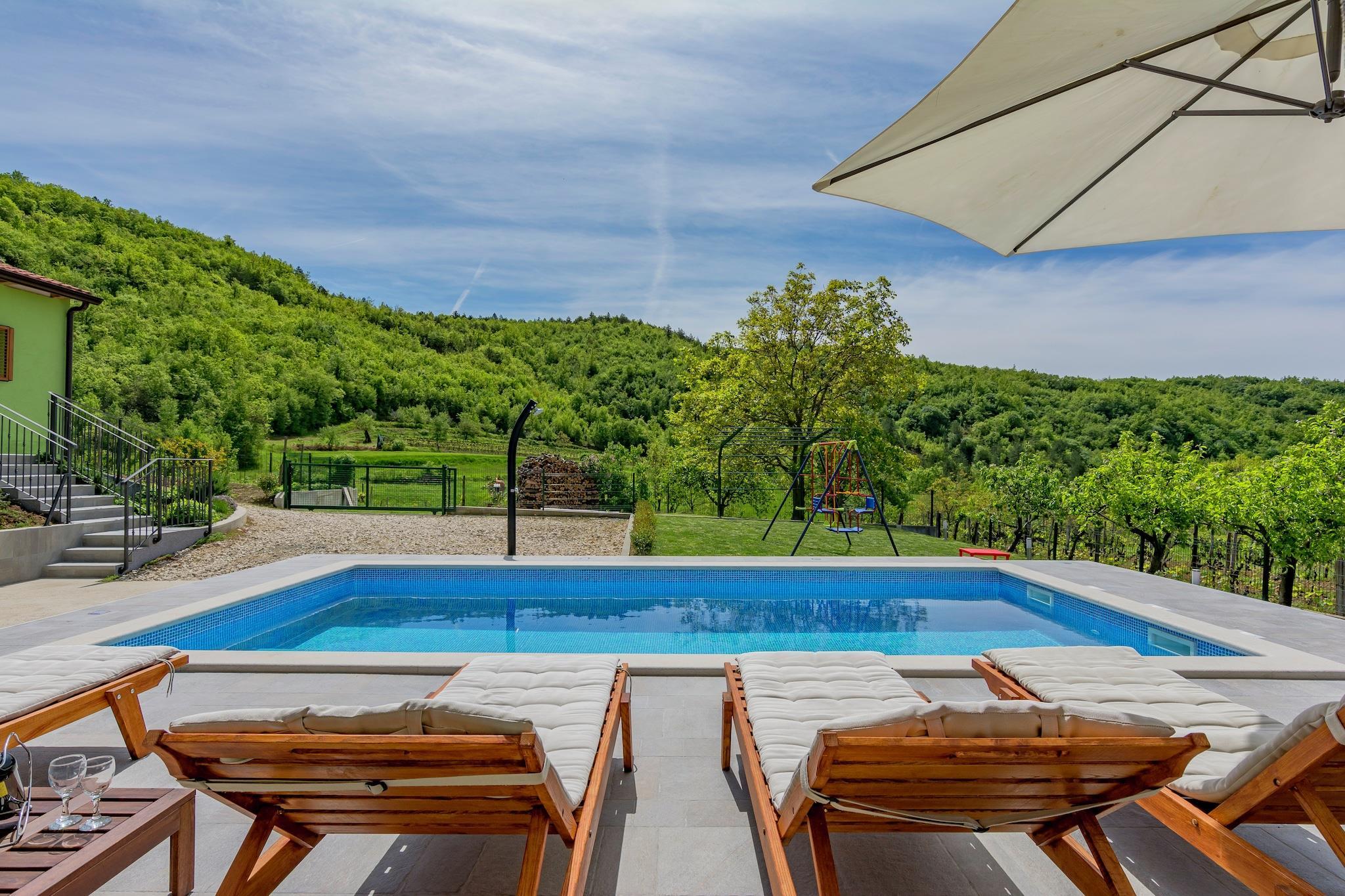 Denne vakre møblert, åpen leilighet med mange detaljer ligger i en liten idyllisk landsby, og ligger ved siden av et familiehus. Eiendommen er delvis inngjerdet (80%) og spenner over 2000m2. Svømmebassenget, utekjøkkenet og grillen deles med en annen leilighet på eiendommen. Avstand fra sjøen 35km, 11km fra byen Pazin. Balkongen har flott utsikt over svømmebassenget og området rundt. Ideell for 4-6 personer. Den er utstyrt med: air condition, sentralvarme, oppvaskmaskin, mikrobølgeovn, vannkoker, brødrister, strykejern, vaskemaskin, TV / DVD, satellitt og det er en vakker peis. Balkongen har tilgang til bassenget og sommer kjøkkenet som har en gassgrill og en kullgrill. Det er solsenger for 12 personer. Vi har også en lekeplass for barn. Det er 3 parkeringsplasser. Vi tillater også plukking av grønnsaker fra den organiske hagen. Velkommen!!!