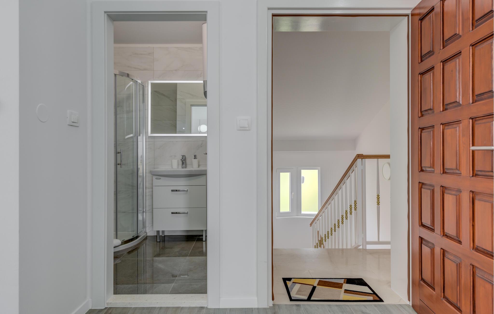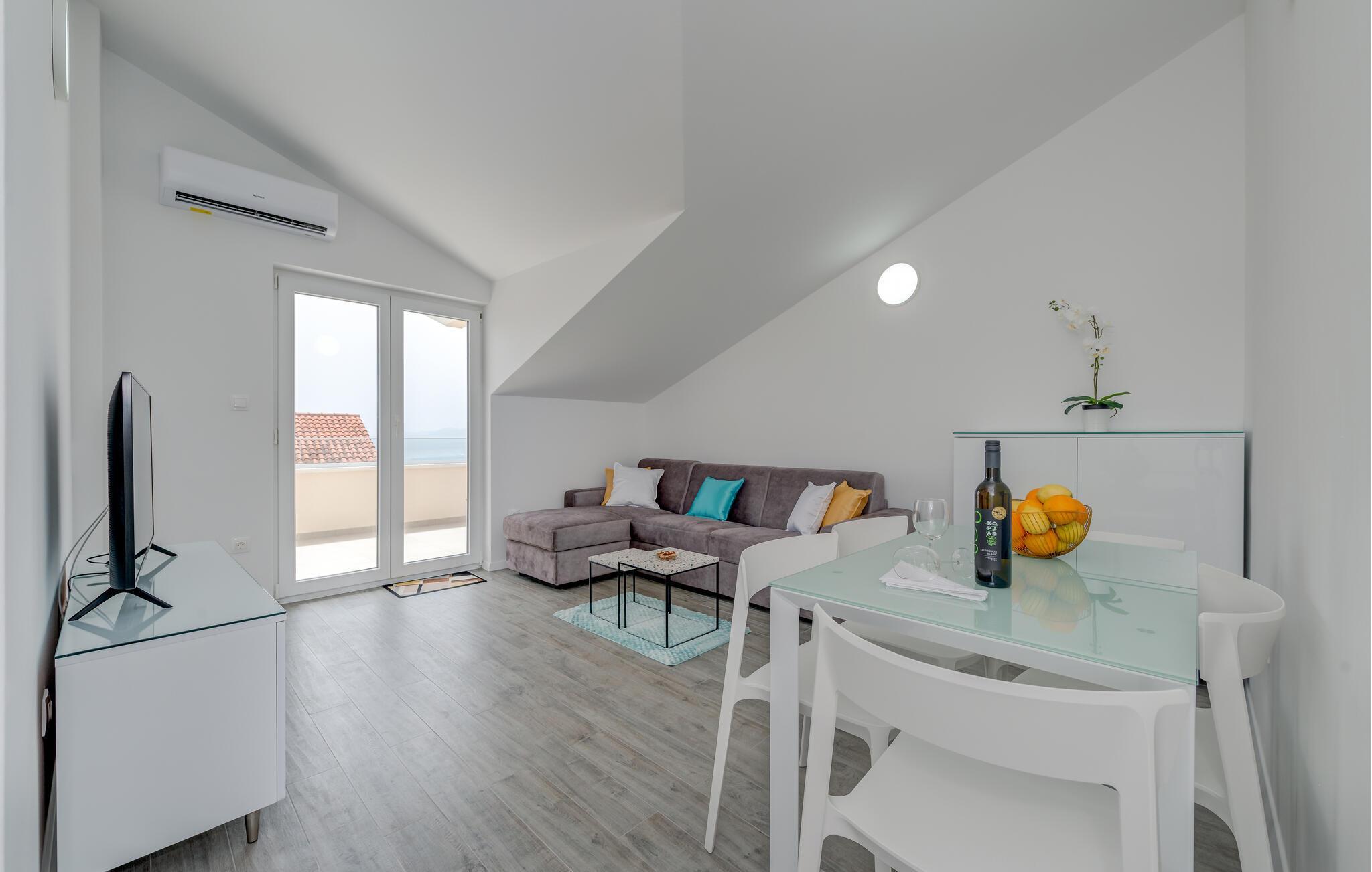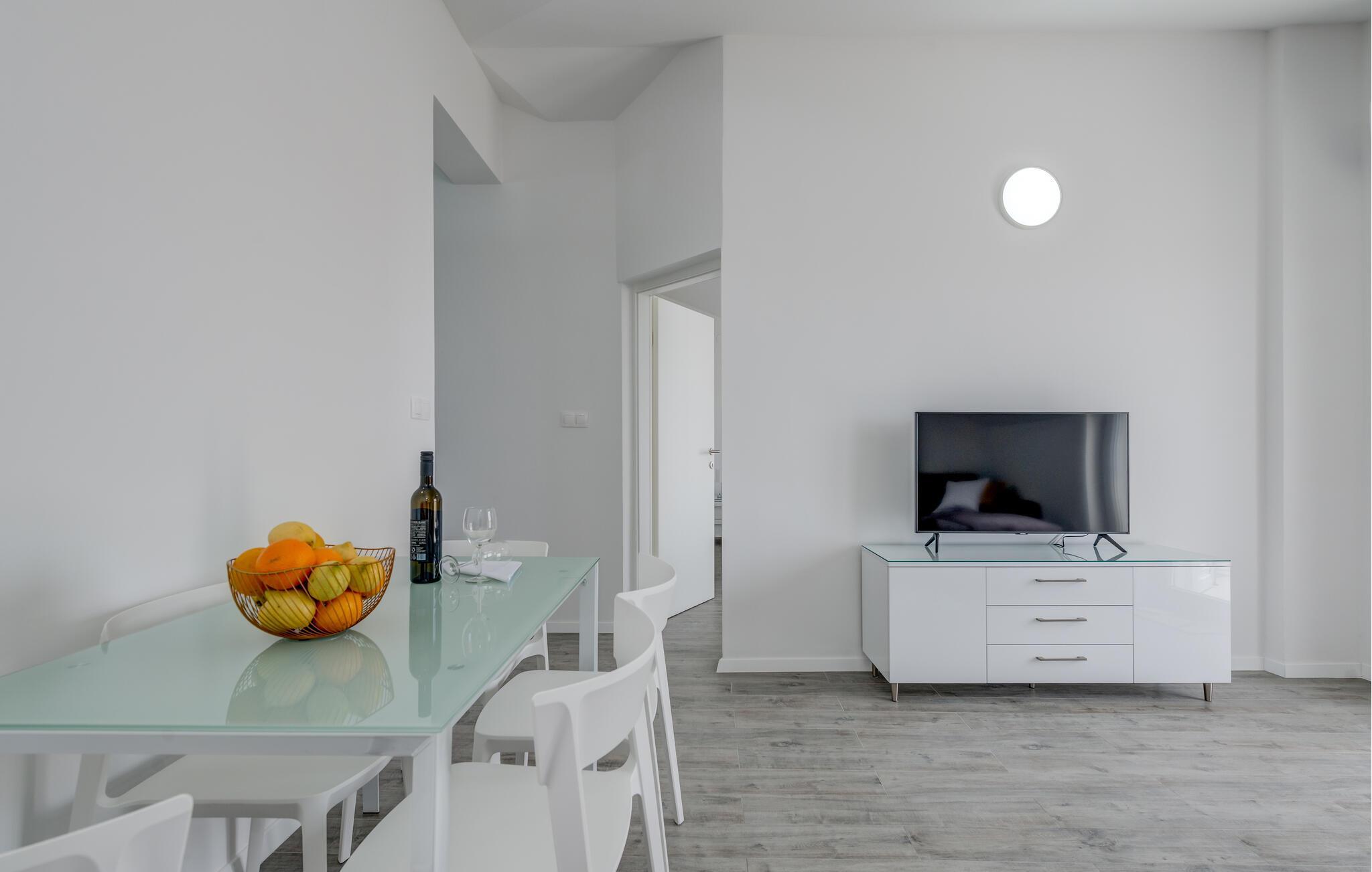 Denne velholdte ferieleiligheten på den solfylte øya Iovo ønsker deg velkommen med en lys og stilfull atmosfære. Tilbered deilige måltider på det åpne kjøkkenet og slå deg ned ved det innbydende spisebordet. Slå deg ned i den koselige sofaen, se en spennende film eller fordyp deg i en god bok.