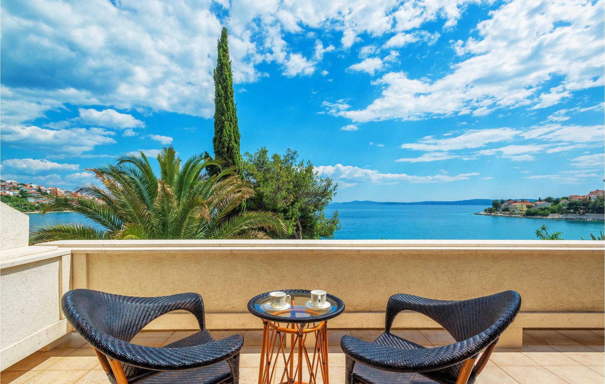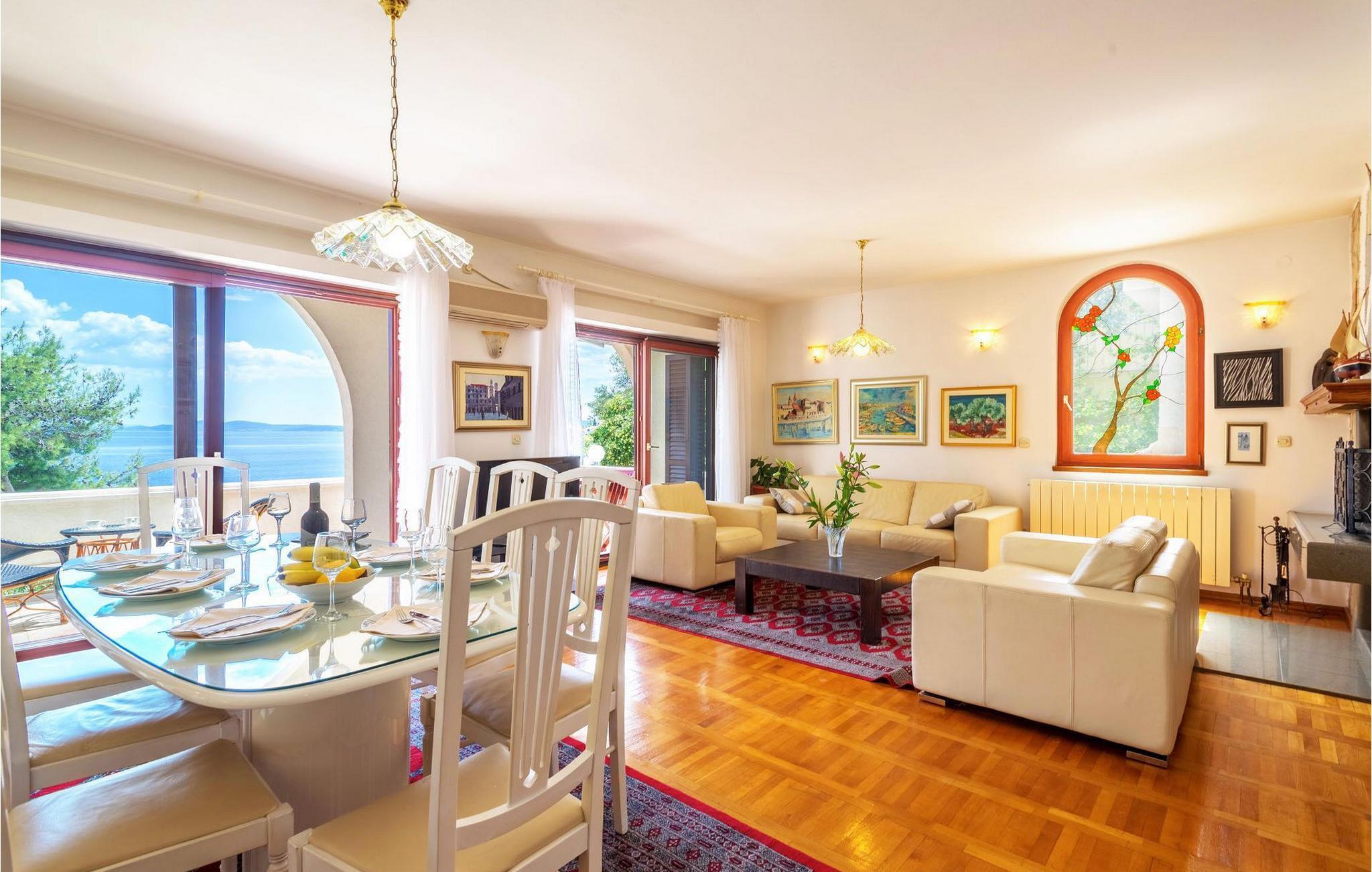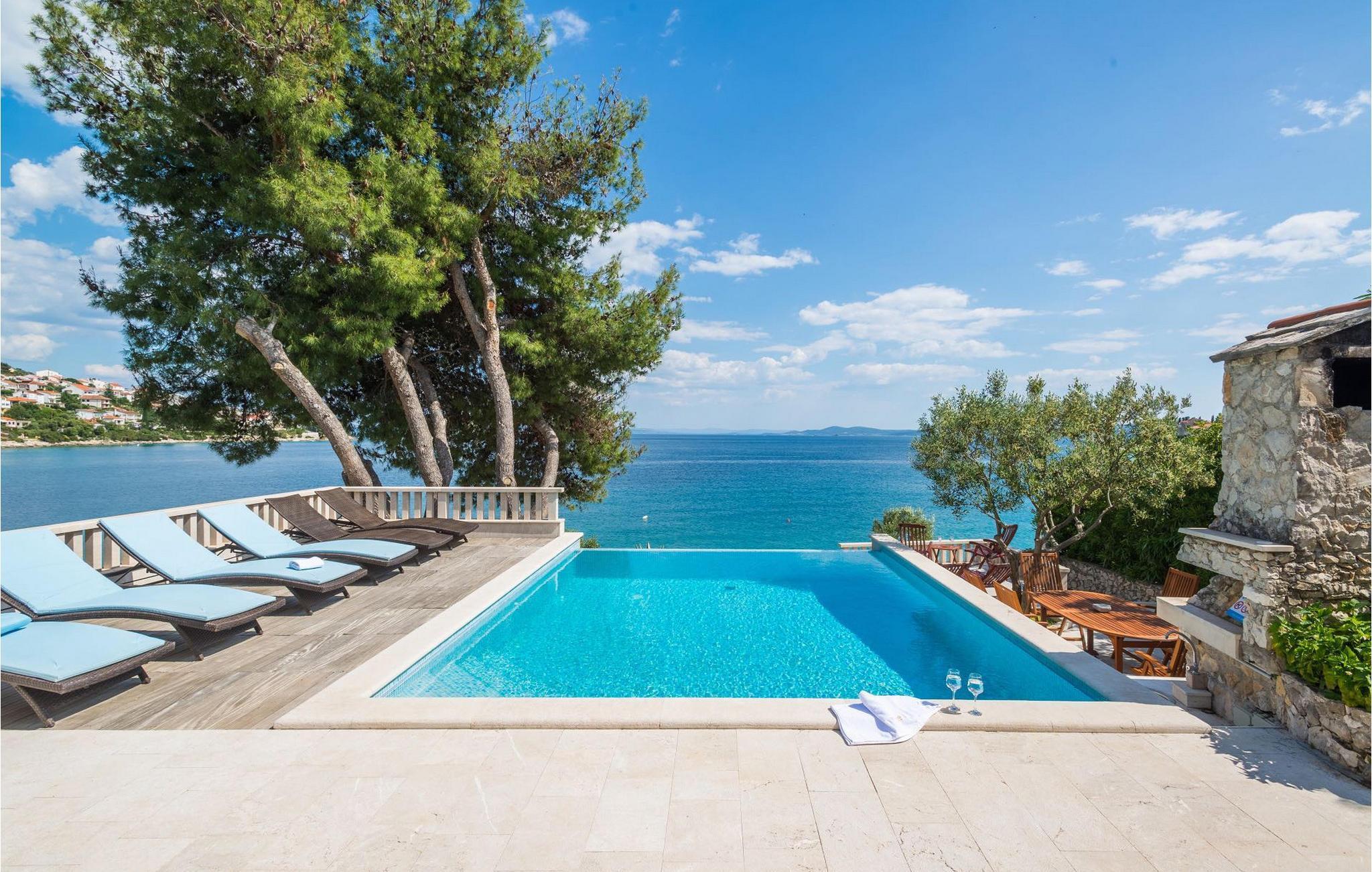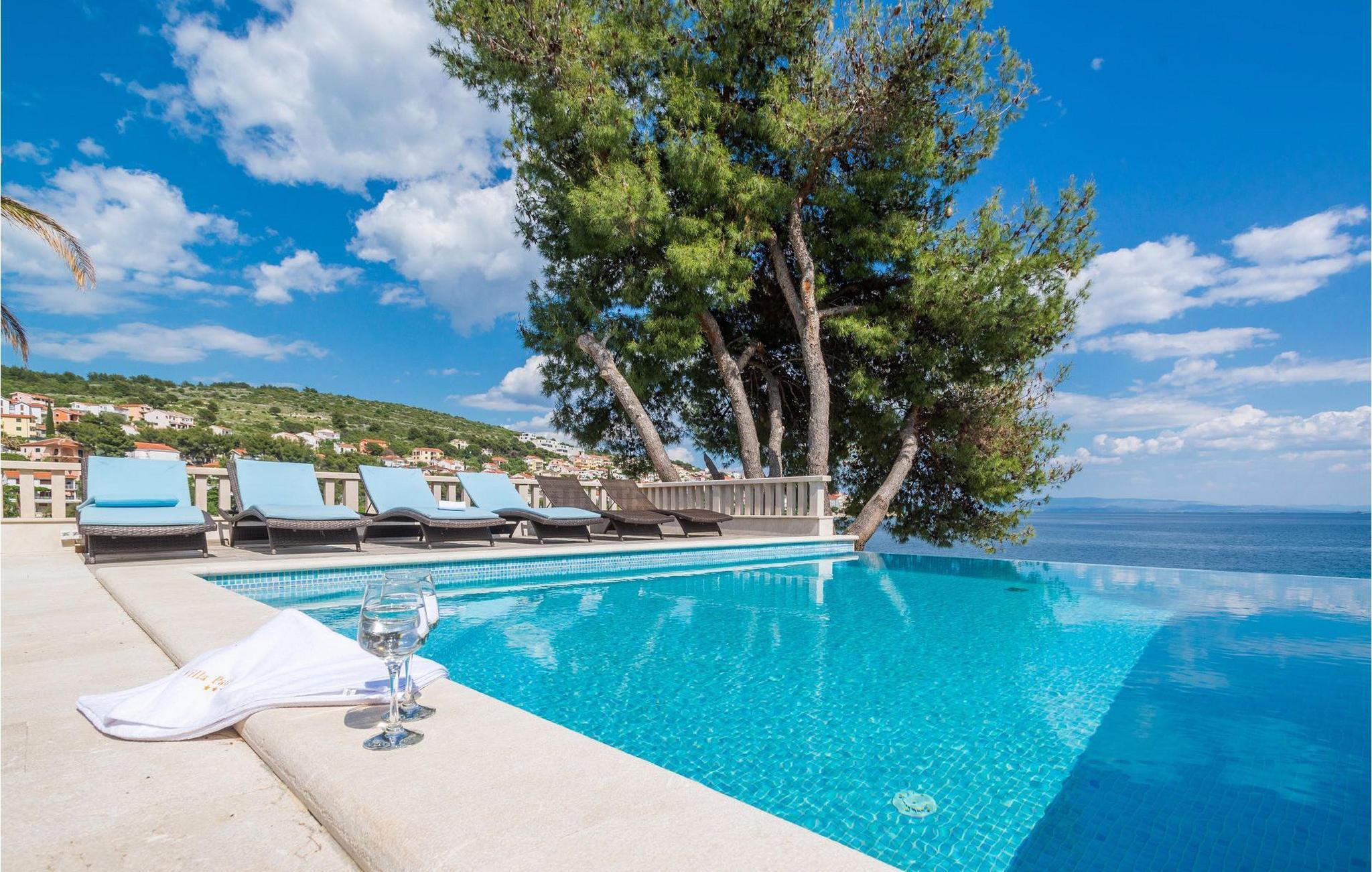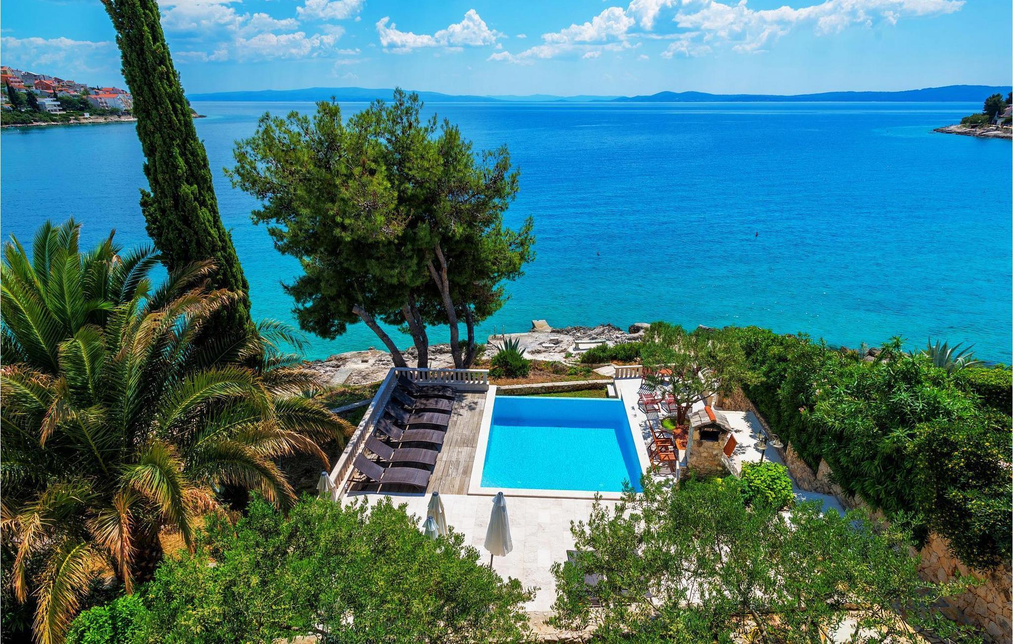 Villa Paula har en førsteklasses beliggenhet rett ved klippekysten, perfekt plassert for å kunne nyte solen og det krystallklare havet hele dagen, og er designet for å utnytte dette utmerkede utsiktspunktet fra alle vinkler. Den innbydende asfalterte terrassen, som er omkranset av et soldekk i tre og en middelhavshage, er ideell for dem som foretrekker soling og bading fremfor sightseeing, og har et vakkert evighetsbasseng hvis kant ser ut til å renne ut i det koboltblå havet. De koselige solsengene og hagemøblene er plassert slik at du kan nyte både sol og skygge, og fra den flotte verandaen kan du beundre de spektakulære solnedgangene mens du nyter grillede biffer eller fersk fisk fra lokale fiskere. Denne romslige eiendommen med alle moderne bekvemmeligheter (WiFi, klimaanlegg, kabel- og satellitt-TV) går over tre etasjer og består av fire lyse, selvstendige leiligheter med fire fullt utstyrte kjøkken med spiseplass, tre komfortable stuer med peis for en koselig atmosfære, seks bad (fire av dem med eget bad) og syv doble soverom, noe som gir nok plass til å finne en rolig krok både i en stor gruppe og i en liten gruppe. Hver etasje har utgang til en balkong eller terrasse, som er smart plassert slik at du kan beundre den praktfulle havutsikten i ditt eget hjem. Det er nesten umulig å beundre de fortryllende omkringliggende øyene fra villaen hver dag uten å bli fristet til å hoppe på en båt og utforske dem, noe som er lett å få til ettersom du kan leie en båt direkte fra de svært hjelpsomme vertene på stedet.Villa Paula har den ideelle beliggenheten for å utforske dette hjørnet av paradis, med sine mange vakre strender, idylliske øyer, skjulte bukter og Adriaterhavets berømte krystallklare vann, samtidig som det er kort vei til de fantastiske historiske og arkitektoniske severdighetene i de berømte UNESCO-verdensarvstedene Trogir og Split. Det livlige lille feriestedet Okrug Gornji på den pittoreske øya Ciovo byr på et fint utvalg av restauranter, kafeer og butikker, samt en rekke strandbarer som er kjent blant den yngre generasjonen for sine gode fester. Utallige små bukter i nærområdet byr på fred og ro for de som foretrekker privatliv, mens vakre rullesteinstrender med mange grunne områder gjør stedet perfekt for barnefamilier. Eventyrlystne har et stort utvalg av sports- og opplevelsesfasiliteter til rådighet, blant annet et dykkesenter, tennis, fotball og basketball, samt sandvolleyball, surfing, parasailing og alle slags vannsportsaktiviteter. Biler, sykler og båter kan leies direkte fra villaen.
