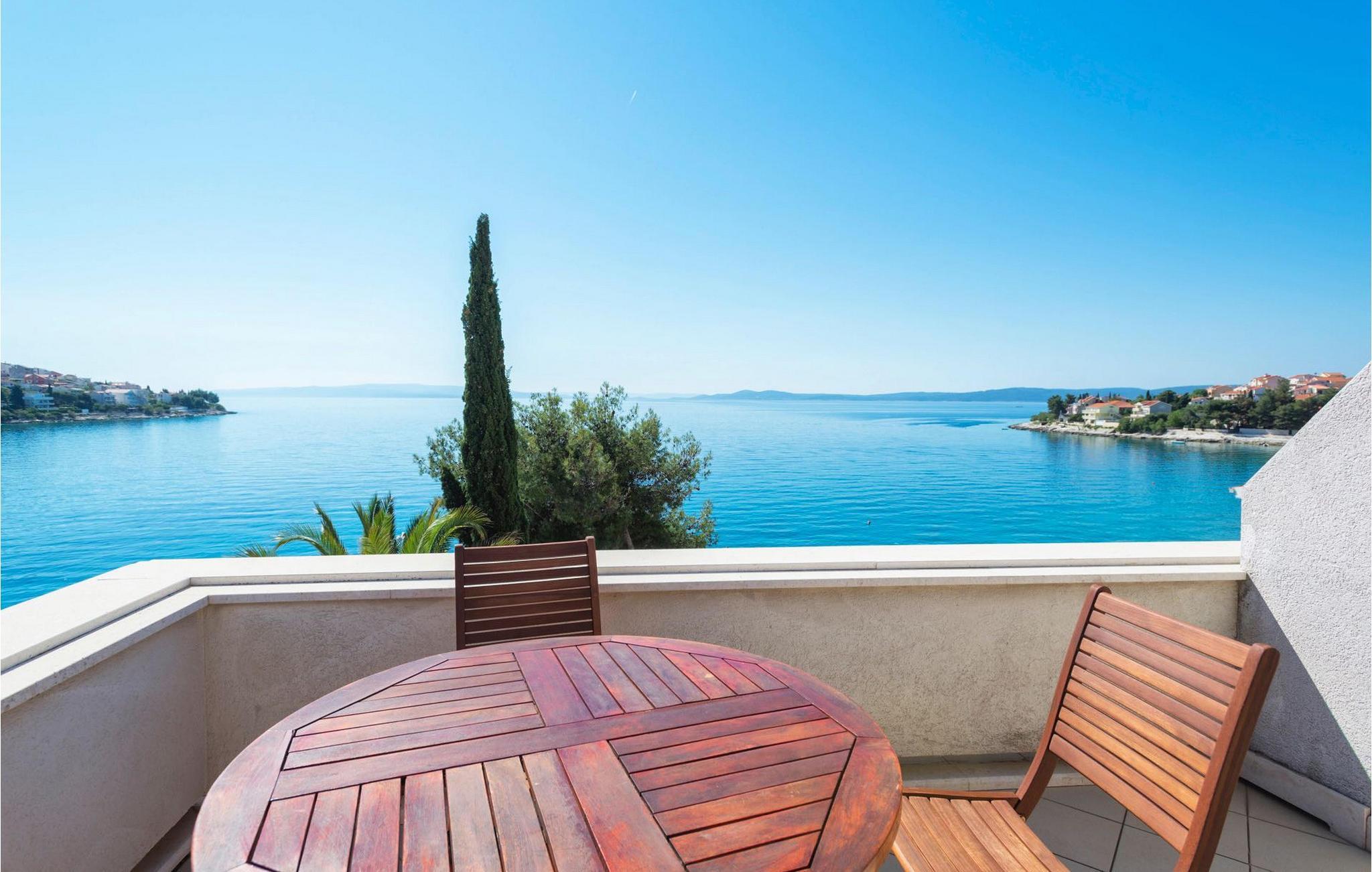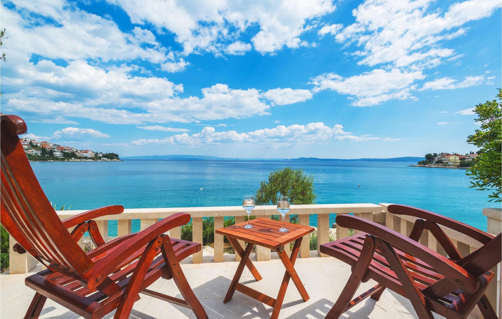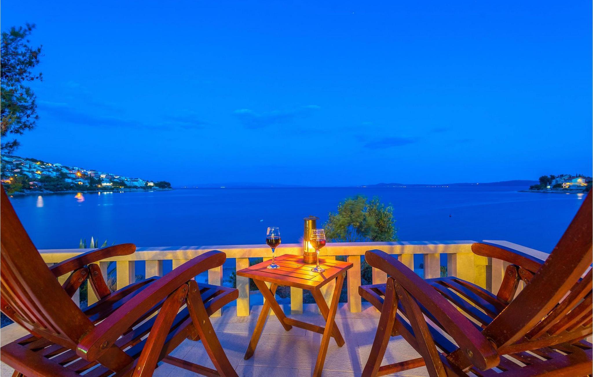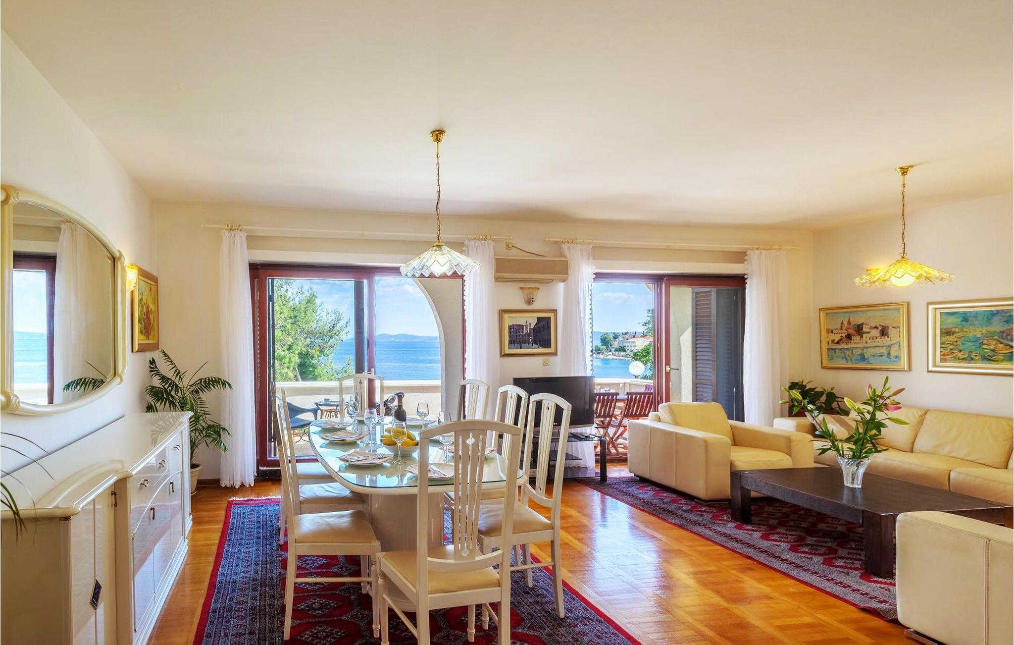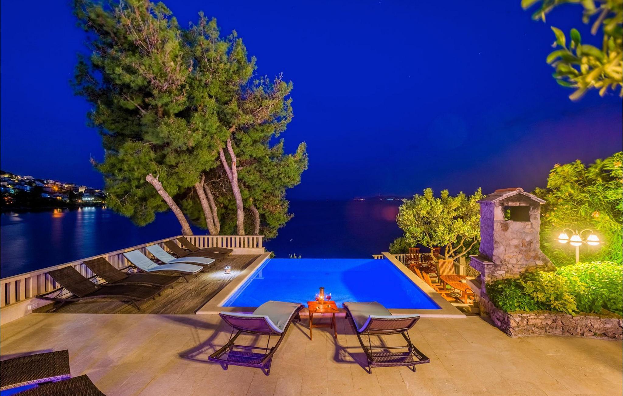 Villa Paula har en førsteklasses beliggenhet rett ved klippekysten, perfekt plassert for å kunne nyte solen og det krystallklare havet hele dagen, og er designet for å utnytte dette utmerkede utsiktspunktet fra alle vinkler. Den innbydende asfalterte terrassen, som er omkranset av et soldekk i tre og en middelhavshage, er ideell for dem som foretrekker soling og bading fremfor sightseeing, og har et vakkert evighetsbasseng hvis kant ser ut til å renne ut i det koboltblå havet. De koselige solsengene og hagemøblene er plassert slik at du kan nyte både sol og skygge, og fra den flotte verandaen kan du beundre de spektakulære solnedgangene mens du nyter grillede biffer eller fersk fisk fra lokale fiskere. Denne romslige eiendommen med alle moderne bekvemmeligheter (WiFi, klimaanlegg, kabel- og satellitt-TV) går over tre etasjer og består av fire lyse, selvstendige leiligheter med fire fullt utstyrte kjøkken med spiseplass, tre komfortable stuer med peis for en koselig atmosfære, seks bad (fire av dem med eget bad) og syv doble soverom, noe som gir nok plass til å finne en rolig krok både i en stor gruppe og i en liten gruppe. Hver etasje har utgang til en balkong eller terrasse, som er smart plassert slik at du kan beundre den praktfulle havutsikten i ditt eget hjem. Det er nesten umulig å beundre de fortryllende omkringliggende øyene fra villaen hver dag uten å bli fristet til å hoppe på en båt og utforske dem, noe som er lett å få til ettersom du kan leie en båt direkte fra de svært hjelpsomme vertene på stedet.Villa Paula har den ideelle beliggenheten for å utforske dette hjørnet av paradis, med sine mange vakre strender, idylliske øyer, skjulte bukter og Adriaterhavets berømte krystallklare vann, samtidig som det er kort vei til de fantastiske historiske og arkitektoniske severdighetene i de berømte UNESCO-verdensarvstedene Trogir og Split. Det livlige lille feriestedet Okrug Gornji på den pittoreske øya Ciovo byr på et fint utvalg av restauranter, kafeer og butikker, samt en rekke strandbarer som er kjent blant den yngre generasjonen for sine gode fester. Utallige små bukter i nærområdet byr på fred og ro for de som foretrekker privatliv, mens vakre rullesteinstrender med mange grunne områder gjør stedet perfekt for barnefamilier. Eventyrlystne har et stort utvalg av sports- og opplevelsesfasiliteter til rådighet, blant annet et dykkesenter, tennis, fotball og basketball, samt sandvolleyball, surfing, parasailing og alle slags vannsportsaktiviteter. Biler, sykler og båter kan leies direkte fra villaen.