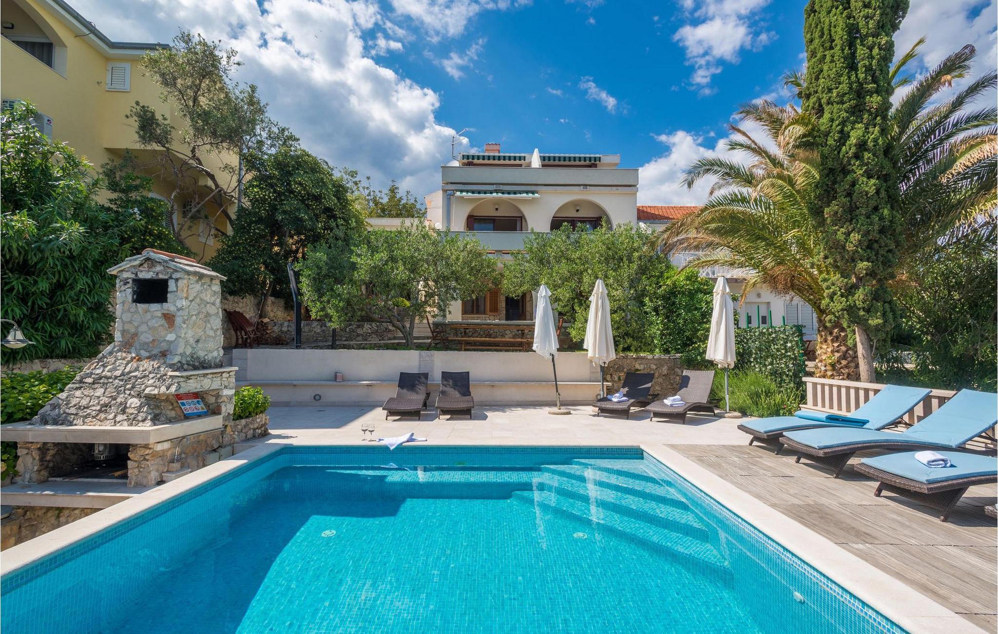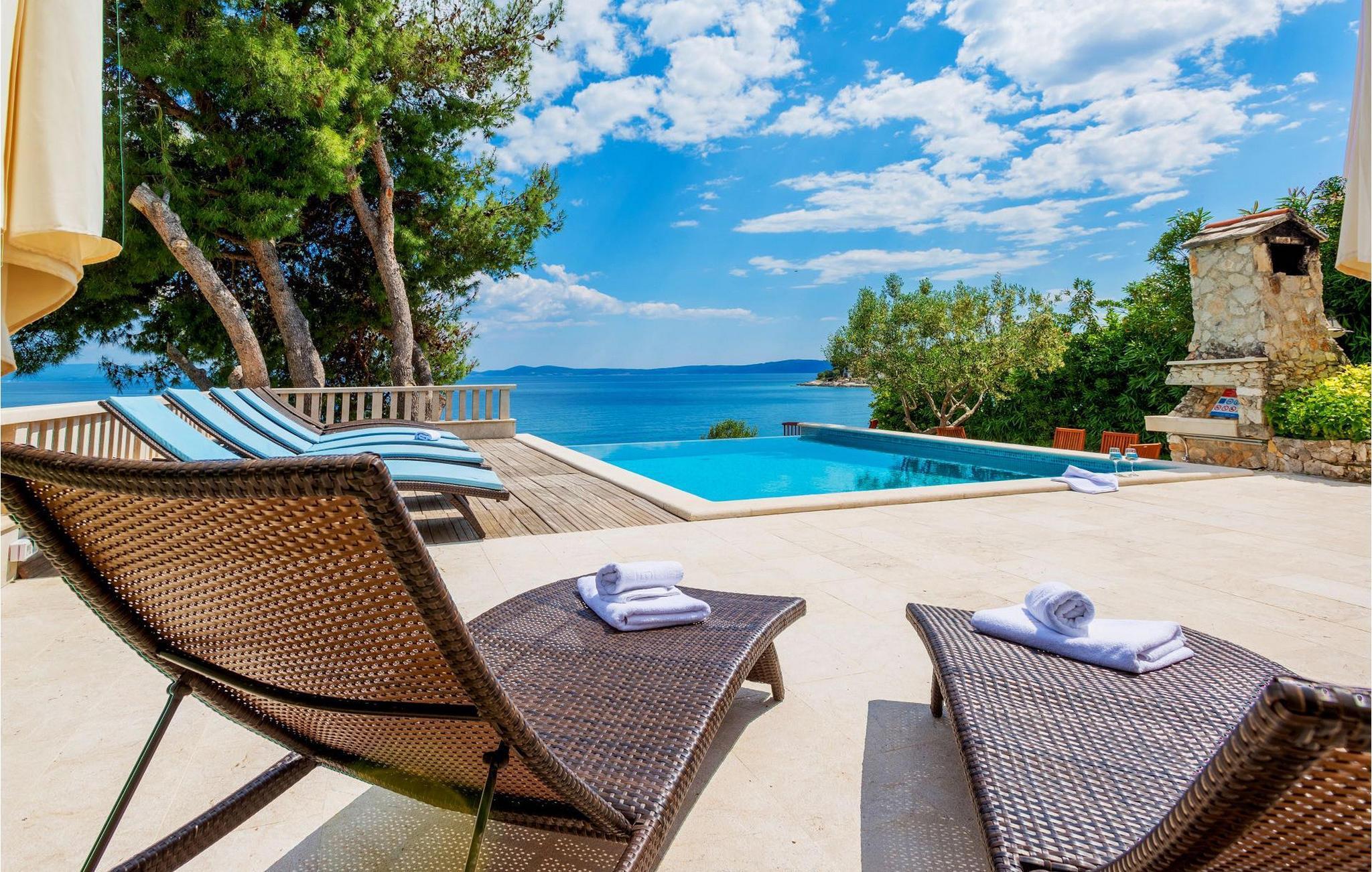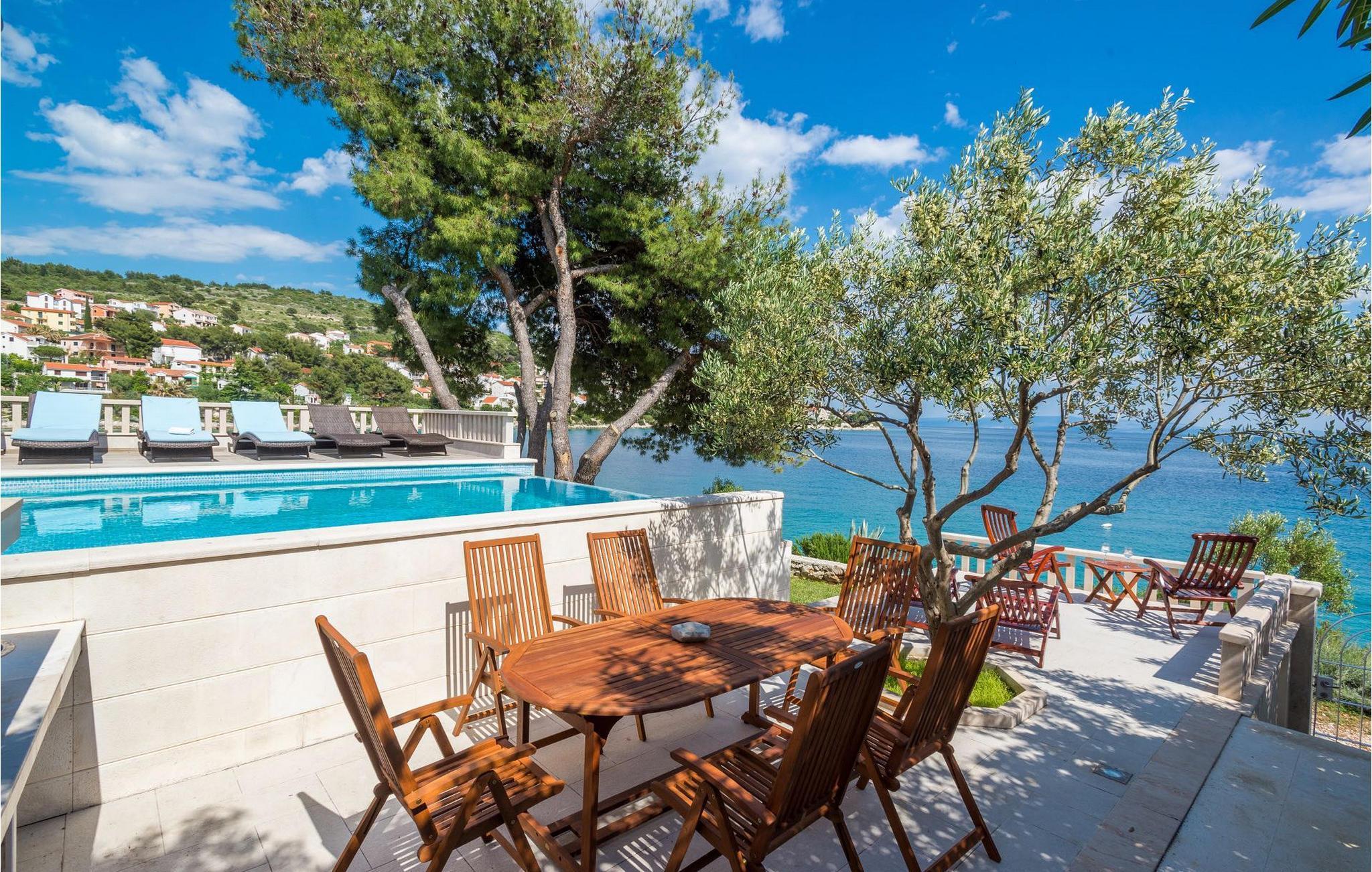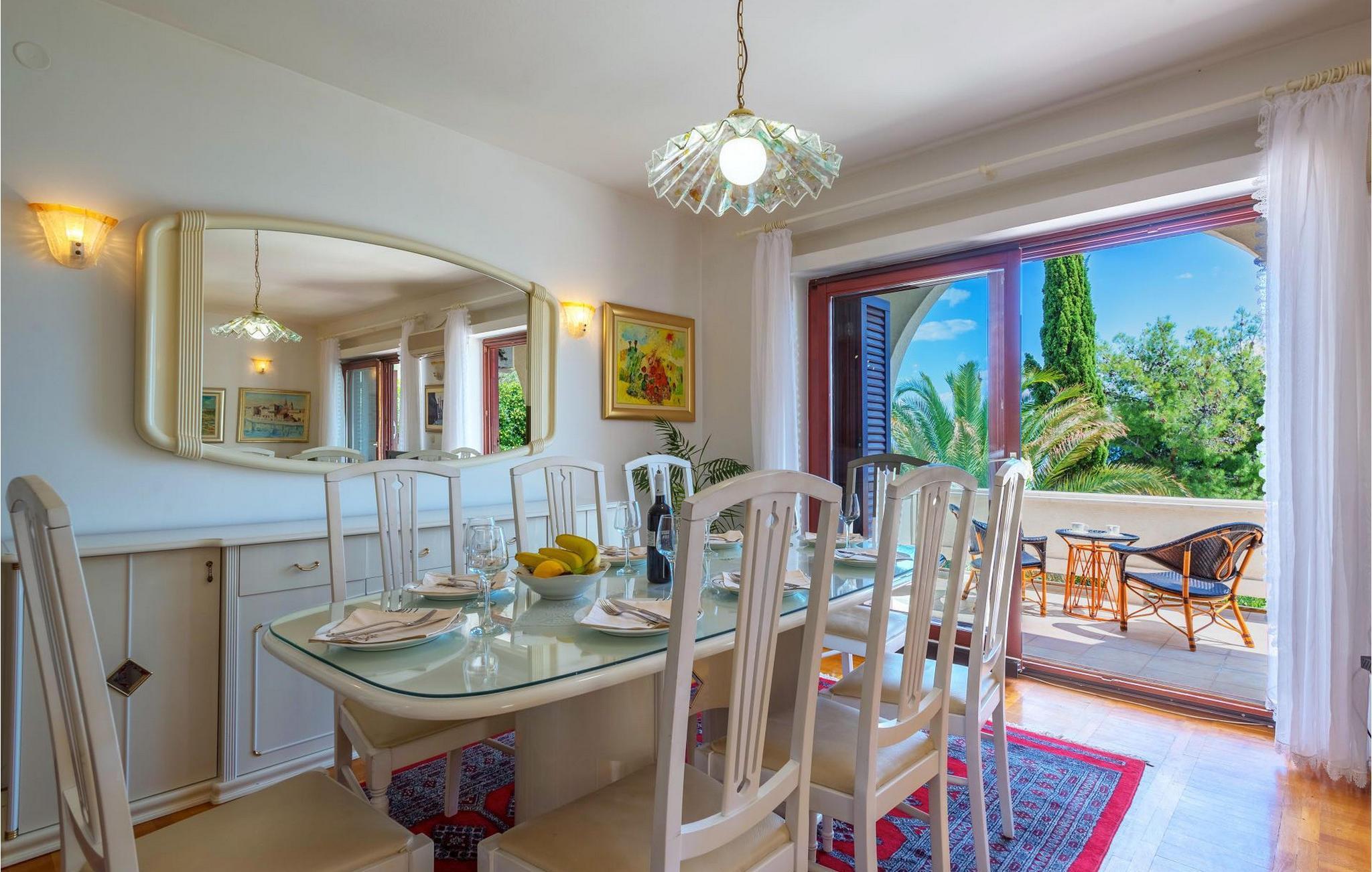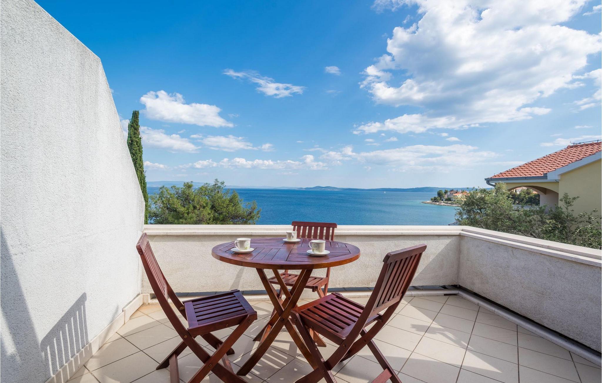 Villa Paula har en førsteklasses beliggenhet rett ved klippekysten, perfekt plassert for å kunne nyte solen og det krystallklare havet hele dagen, og er designet for å utnytte dette utmerkede utsiktspunktet fra alle vinkler. Den innbydende asfalterte terrassen, som er omkranset av et soldekk i tre og en middelhavshage, er ideell for dem som foretrekker soling og bading fremfor sightseeing, og har et vakkert evighetsbasseng hvis kant ser ut til å renne ut i det koboltblå havet. De koselige solsengene og hagemøblene er plassert slik at du kan nyte både sol og skygge, og fra den flotte verandaen kan du beundre de spektakulære solnedgangene mens du nyter grillede biffer eller fersk fisk fra lokale fiskere. Denne romslige eiendommen med alle moderne bekvemmeligheter (WiFi, klimaanlegg, kabel- og satellitt-TV) går over tre etasjer og består av fire lyse, selvstendige leiligheter med fire fullt utstyrte kjøkken med spiseplass, tre komfortable stuer med peis for en koselig atmosfære, seks bad (fire av dem med eget bad) og syv doble soverom, noe som gir nok plass til å finne en rolig krok både i en stor gruppe og i en liten gruppe. Hver etasje har utgang til en balkong eller terrasse, som er smart plassert slik at du kan beundre den praktfulle havutsikten i ditt eget hjem. Det er nesten umulig å beundre de fortryllende omkringliggende øyene fra villaen hver dag uten å bli fristet til å hoppe på en båt og utforske dem, noe som er lett å få til ettersom du kan leie en båt direkte fra de svært hjelpsomme vertene på stedet.Villa Paula har den ideelle beliggenheten for å utforske dette hjørnet av paradis, med sine mange vakre strender, idylliske øyer, skjulte bukter og Adriaterhavets berømte krystallklare vann, samtidig som det er kort vei til de fantastiske historiske og arkitektoniske severdighetene i de berømte UNESCO-verdensarvstedene Trogir og Split. Det livlige lille feriestedet Okrug Gornji på den pittoreske øya Ciovo byr på et fint utvalg av restauranter, kafeer og butikker, samt en rekke strandbarer som er kjent blant den yngre generasjonen for sine gode fester. Utallige små bukter i nærområdet byr på fred og ro for de som foretrekker privatliv, mens vakre rullesteinstrender med mange grunne områder gjør stedet perfekt for barnefamilier. Eventyrlystne har et stort utvalg av sports- og opplevelsesfasiliteter til rådighet, blant annet et dykkesenter, tennis, fotball og basketball, samt sandvolleyball, surfing, parasailing og alle slags vannsportsaktiviteter. Biler, sykler og båter kan leies direkte fra villaen.