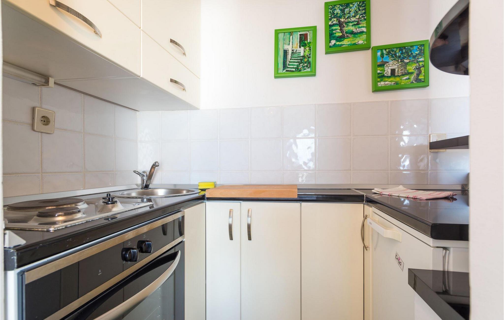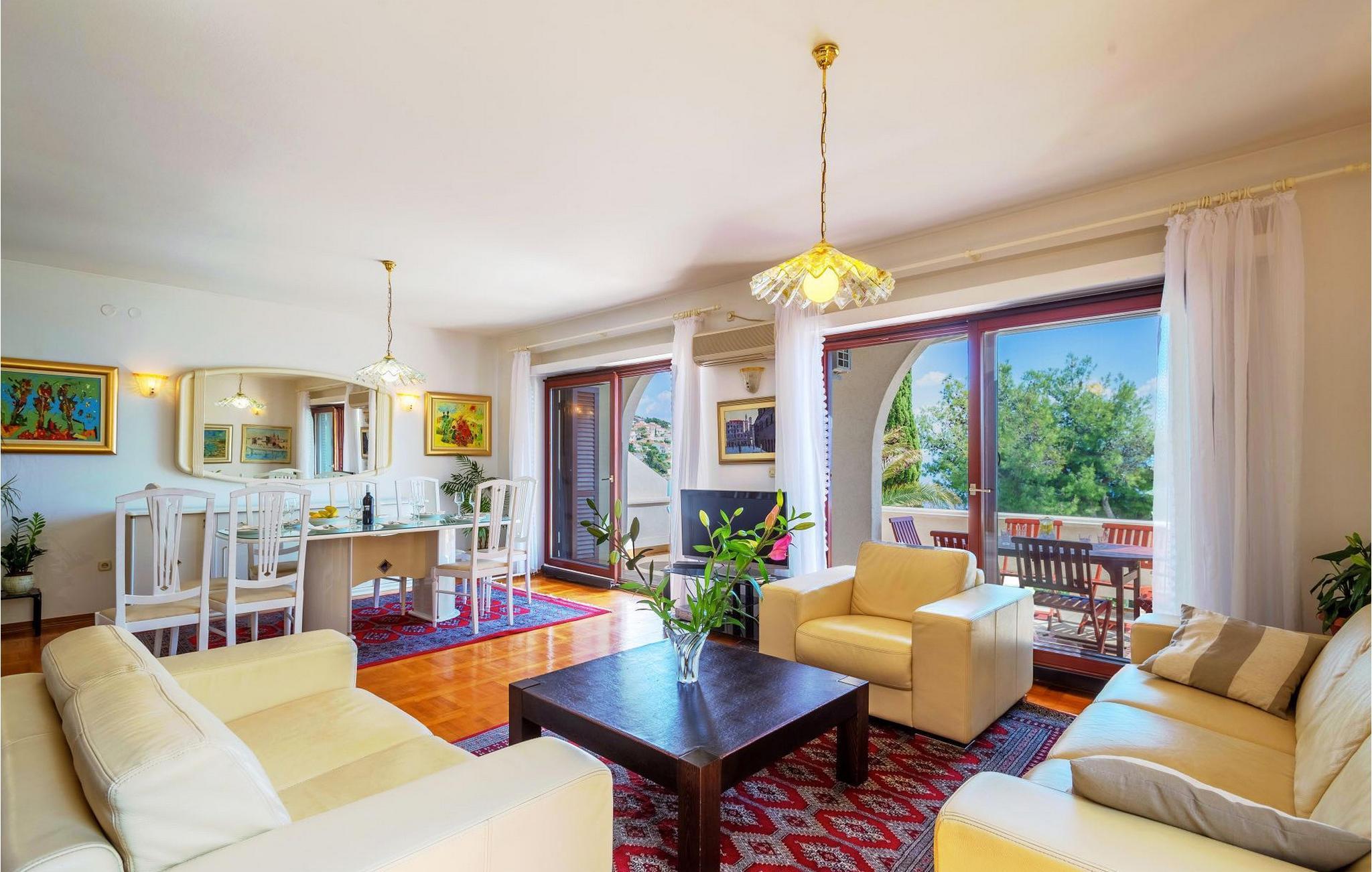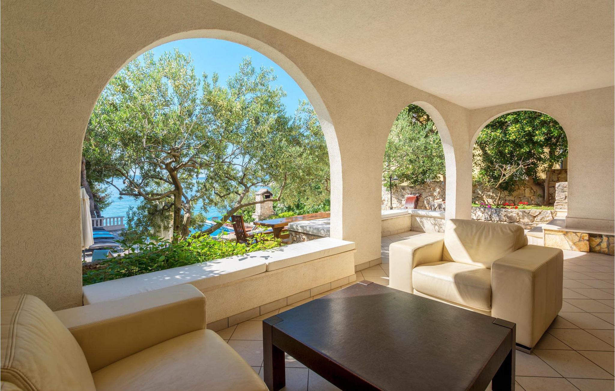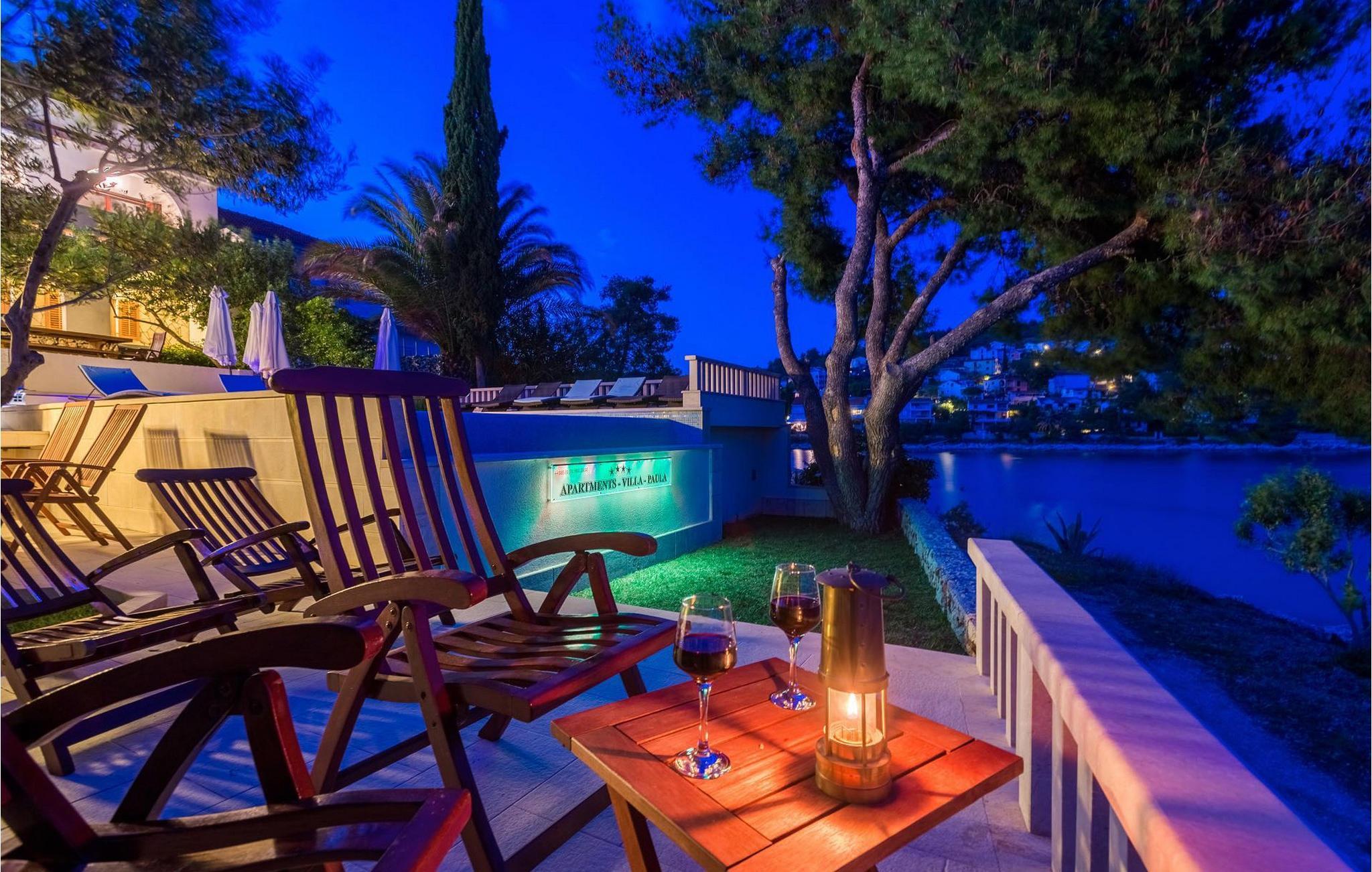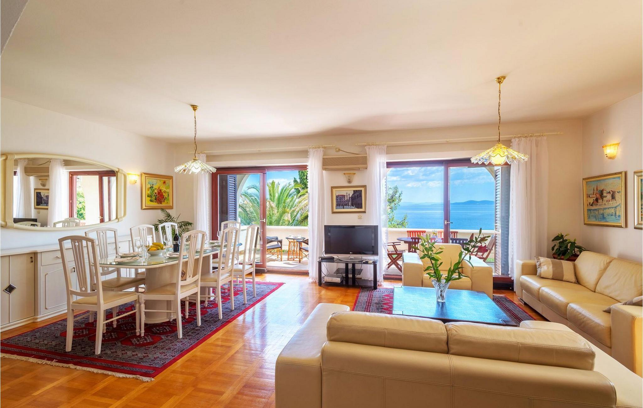 Villa Paula har en førsteklasses beliggenhet rett ved klippekysten, perfekt plassert for å kunne nyte solen og det krystallklare havet hele dagen, og er designet for å utnytte dette utmerkede utsiktspunktet fra alle vinkler. Den innbydende asfalterte terrassen, som er omkranset av et soldekk i tre og en middelhavshage, er ideell for dem som foretrekker soling og bading fremfor sightseeing, og har et vakkert evighetsbasseng hvis kant ser ut til å renne ut i det koboltblå havet. De koselige solsengene og hagemøblene er plassert slik at du kan nyte både sol og skygge, og fra den flotte verandaen kan du beundre de spektakulære solnedgangene mens du nyter grillede biffer eller fersk fisk fra lokale fiskere. Denne romslige eiendommen med alle moderne bekvemmeligheter (WiFi, klimaanlegg, kabel- og satellitt-TV) går over tre etasjer og består av fire lyse, selvstendige leiligheter med fire fullt utstyrte kjøkken med spiseplass, tre komfortable stuer med peis for en koselig atmosfære, seks bad (fire av dem med eget bad) og syv doble soverom, noe som gir nok plass til å finne en rolig krok både i en stor gruppe og i en liten gruppe. Hver etasje har utgang til en balkong eller terrasse, som er smart plassert slik at du kan beundre den praktfulle havutsikten i ditt eget hjem. Det er nesten umulig å beundre de fortryllende omkringliggende øyene fra villaen hver dag uten å bli fristet til å hoppe på en båt og utforske dem, noe som er lett å få til ettersom du kan leie en båt direkte fra de svært hjelpsomme vertene på stedet.Villa Paula har den ideelle beliggenheten for å utforske dette hjørnet av paradis, med sine mange vakre strender, idylliske øyer, skjulte bukter og Adriaterhavets berømte krystallklare vann, samtidig som det er kort vei til de fantastiske historiske og arkitektoniske severdighetene i de berømte UNESCO-verdensarvstedene Trogir og Split. Det livlige lille feriestedet Okrug Gornji på den pittoreske øya Ciovo byr på et fint utvalg av restauranter, kafeer og butikker, samt en rekke strandbarer som er kjent blant den yngre generasjonen for sine gode fester. Utallige små bukter i nærområdet byr på fred og ro for de som foretrekker privatliv, mens vakre rullesteinstrender med mange grunne områder gjør stedet perfekt for barnefamilier. Eventyrlystne har et stort utvalg av sports- og opplevelsesfasiliteter til rådighet, blant annet et dykkesenter, tennis, fotball og basketball, samt sandvolleyball, surfing, parasailing og alle slags vannsportsaktiviteter. Biler, sykler og båter kan leies direkte fra villaen.