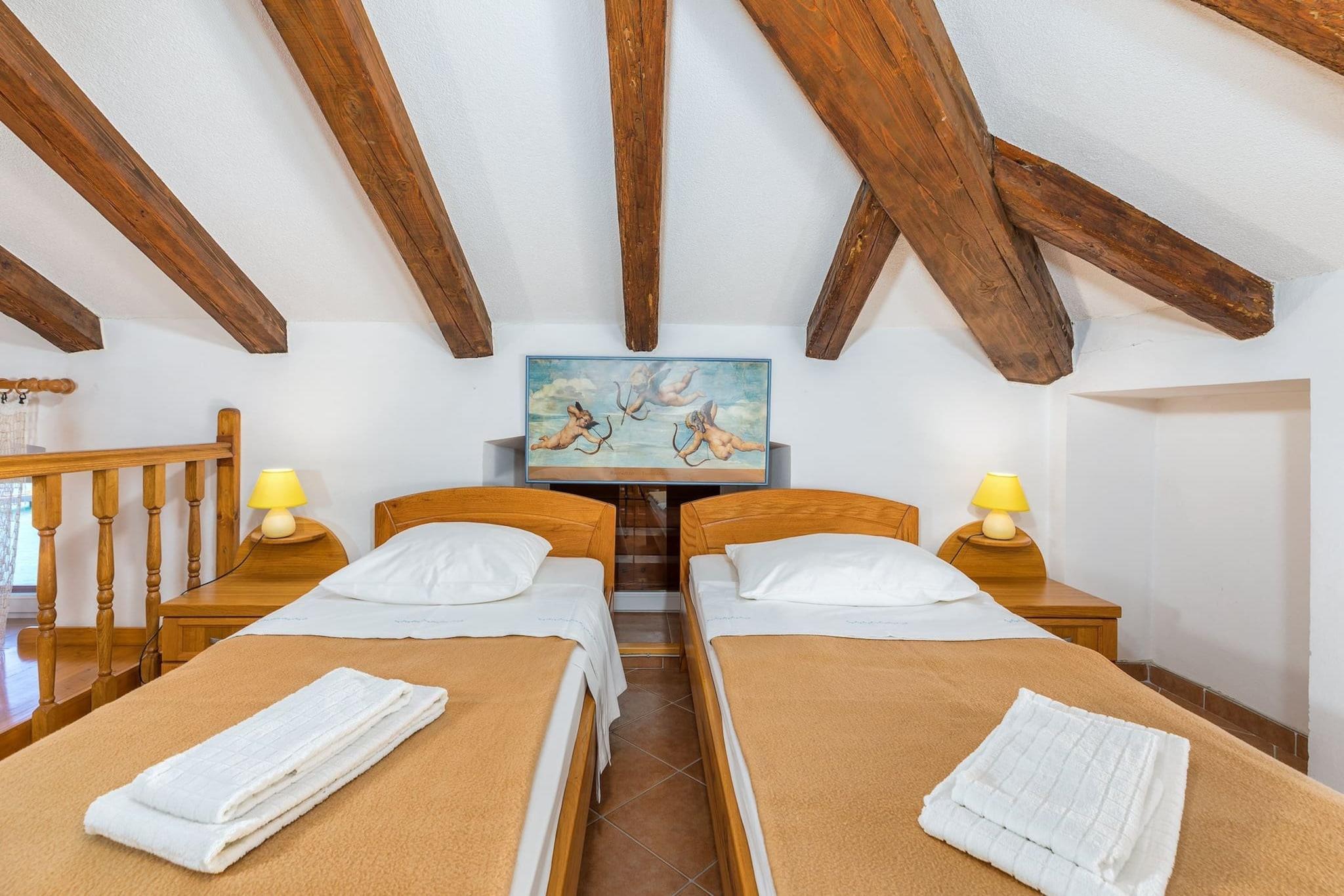 Denne innbydende leiligheten har plass til opptil 6 gjester med to koselige soverom med enkeltsenger og en sovesofa i fellesområdet. Den har en romslig planløsning med et spisebord ved siden av en konvertibel seng for ekstra fleksibilitet. En stor felles terrasse med havutsikt er et perfekt sted for uteservering, komplett med en grill. Leiligheten er kjæledyrvennlig, og tillater kjæledyr mot en liten tilleggsavgift. I tillegg har gjestene tilgang til eierens vaskerom, inkludert en vaskemaskin og strykeutstyr, tilgjengelig etter gjensidig avtale. Ligger i det pittoreske hjertet av Cres, plasserer leiligheten gjestene bare noen skritt fra den vakre gamlebyen, kjent for sin middelhavssjarm og praktfulle arkitektur. Stranden og en rekke kafeer, butikker og restauranter ligger i nærheten, og tilbyr en perfekt blanding av avslapning og utforskning. Gjestene kan ta en ferge til øya Cres fra Brestova-Porozina, med eiendommen i kort avstand fra flere parkeringsplasser innen 300 meter til 1 km. Områdene rundt gir muligheter for bading, fotturer og utforsking av Cres' rike historie, inkludert landemerker knyttet til gresk mytologi. Leiligheten har et åpent kjøkken utstyrt med viktige apparater, inkludert kjøleskap, mikrobølgeovn, komfyr og vannkoker. Badet har både dusj og badekar for ekstra bekvemmelighet. Aircondition, Wi-Fi og satellitt-TV er tilgjengelig for å sikre komfort og underholdning under oppholdet. Leiligheten inkluderer også viktige fasiliteter som sengetøy, håndklær og sluttrengjøring, med valgfri kjæledyrinnkvartering tilgjengelig for en liten avgift.