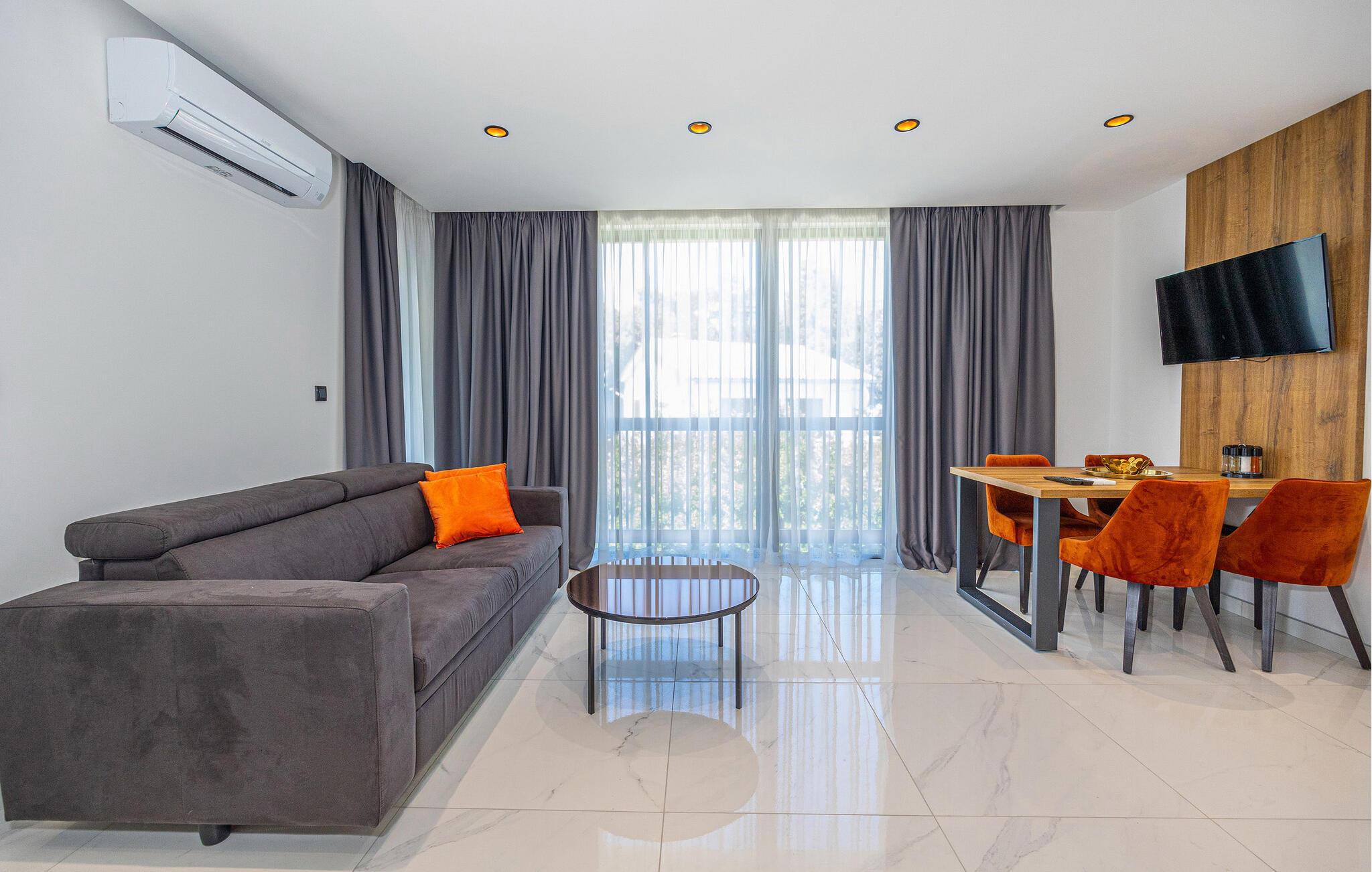 Bare noen få skritt fra stranden ligger denne moderne ferieleiligheten i et leilighetskompleks av høy kvalitet. Den smakfulle innredningen med nøye utvalgte materialer skaper en komfortabel og innbydende atmosfære. Start dagen med en kaffe på balkongen mens du nyter utsikten over havet. Slapp av ved det felles svømmebassenget eller slapp av om kvelden i den stilfulle ferieleiligheten din - det perfekte stedet å komme seg bort fra alt.