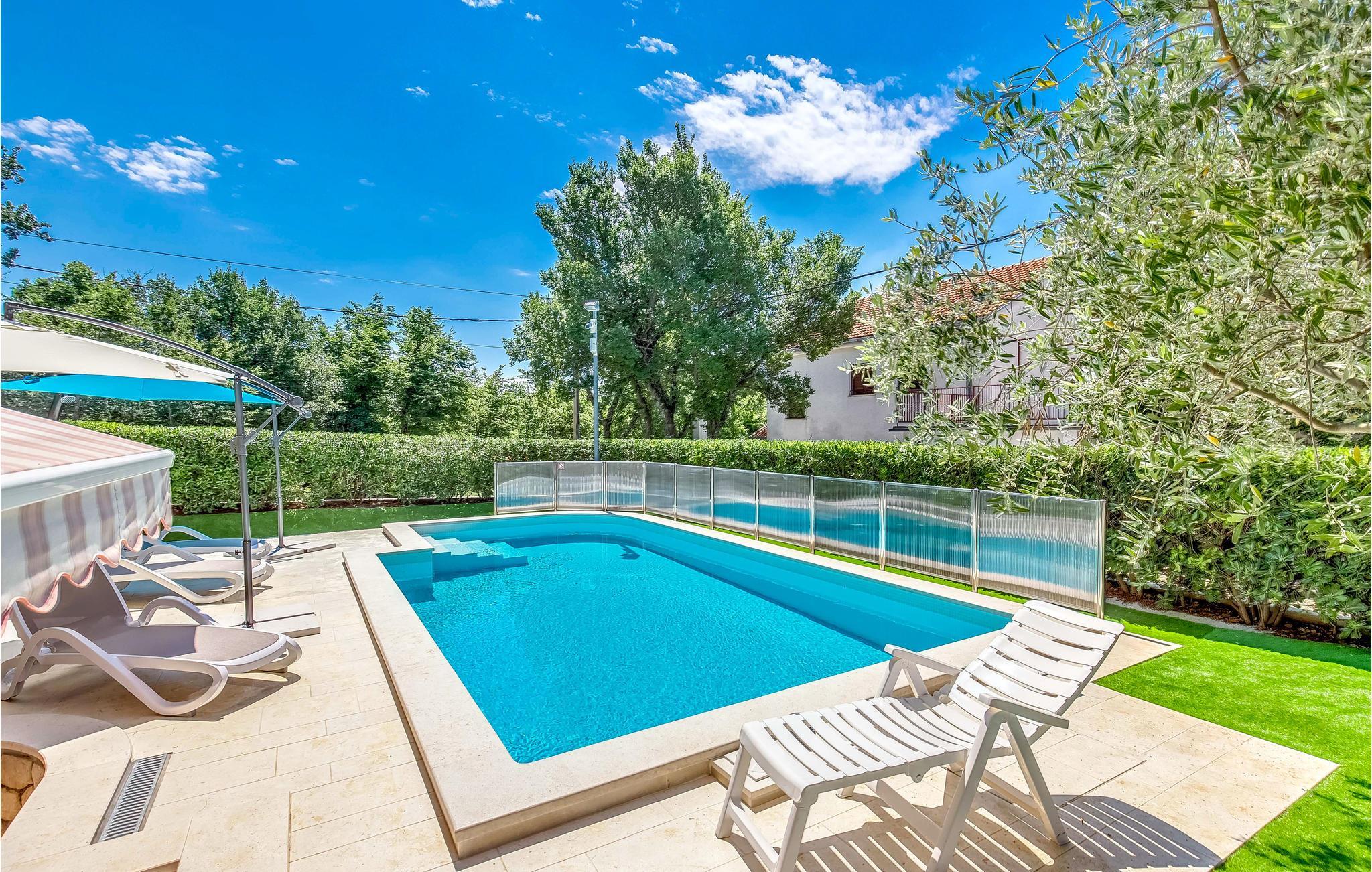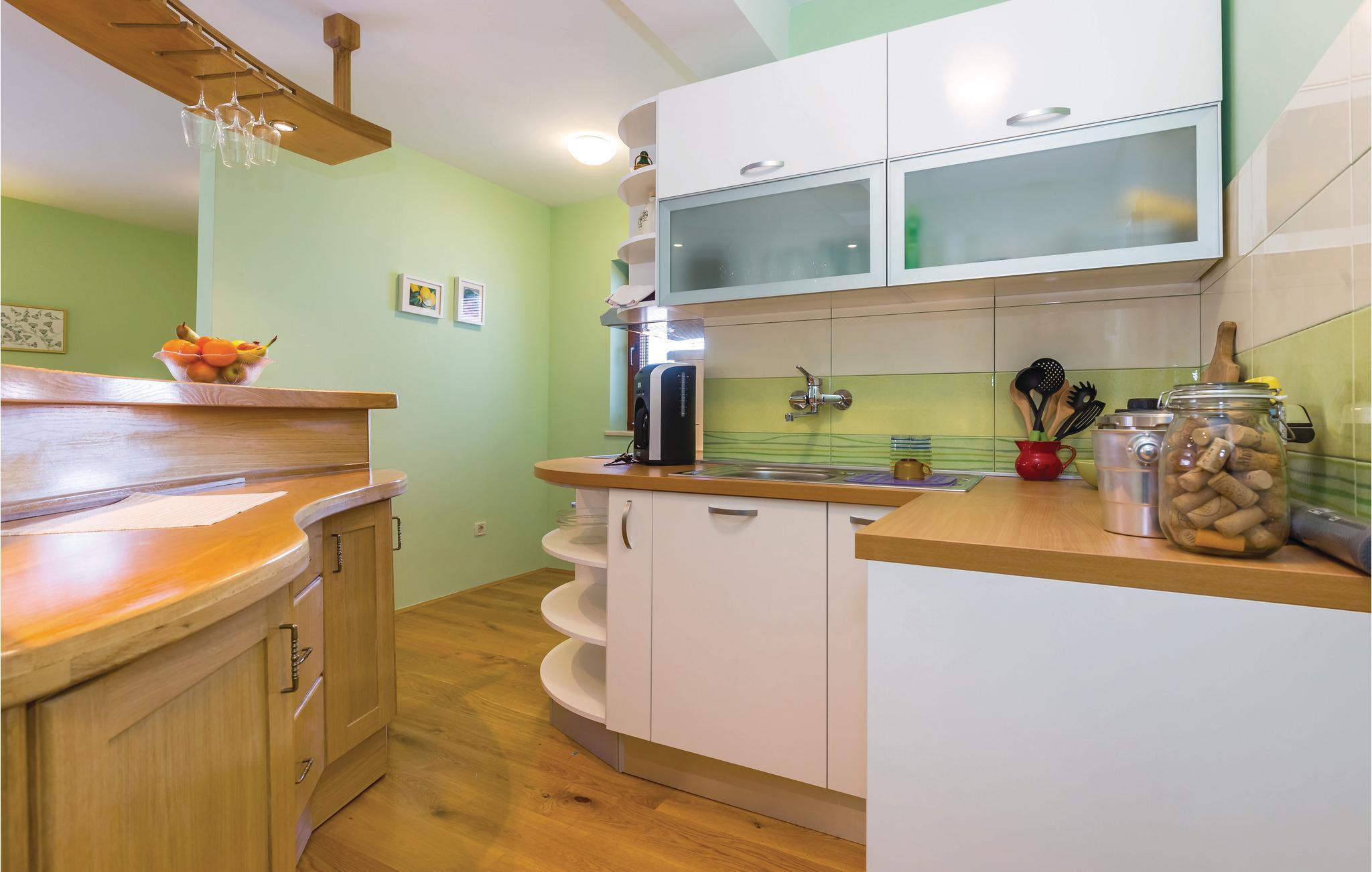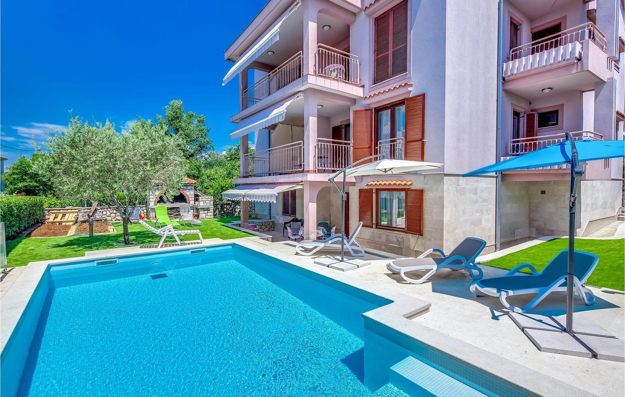 Dette feriehuset ligger i den lille kystbyen Jadranovo, på Crikvenica-rivieraen, og består av et sommerkjøkken i første etasje, fire soverom og et rom med kjøkken, spisestue og stue i andre etasje. Hvert rom har sitt eget bad. Den øverste etasjen er lukket og ubrukt. For avslapning og forfriskning har eiendommen også et basseng og en grill hvor du kan tilberede deilige måltider. Den nærmeste stranden ligger bare noen minutters gange unna, eller du kan kjøre til sandstranden i Crikvenica. Øya Krk ligger også i nærheten, så vi vil absolutt anbefale dagsturer til øybyene Baka, Malinska eller Vrbnik.