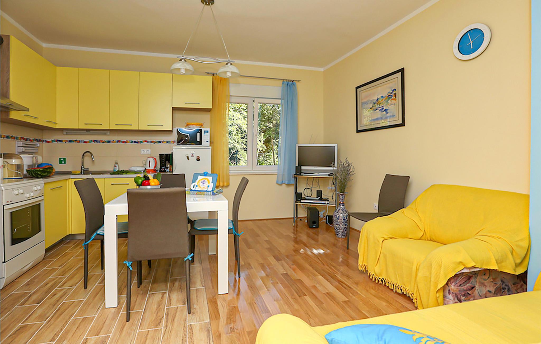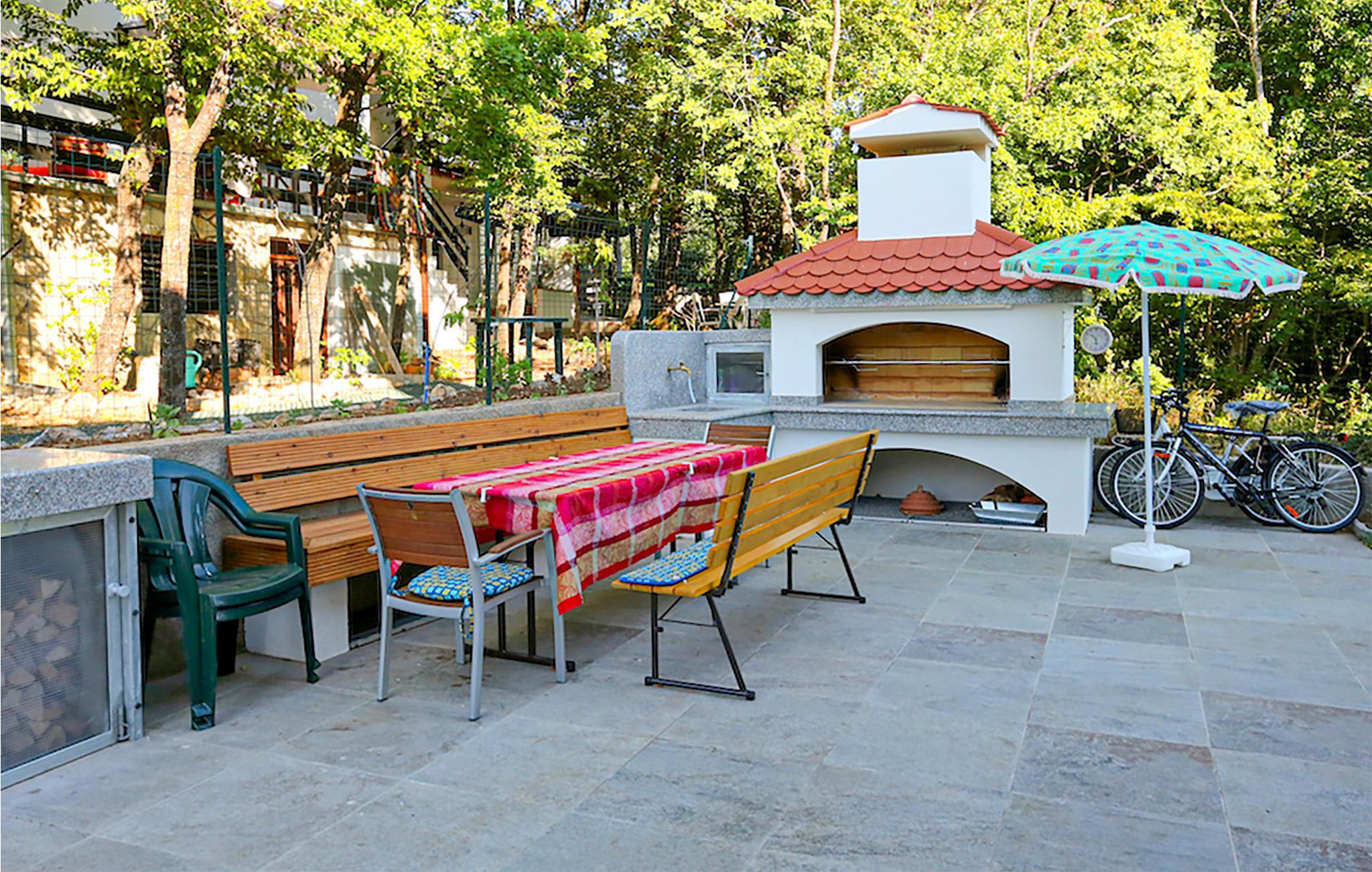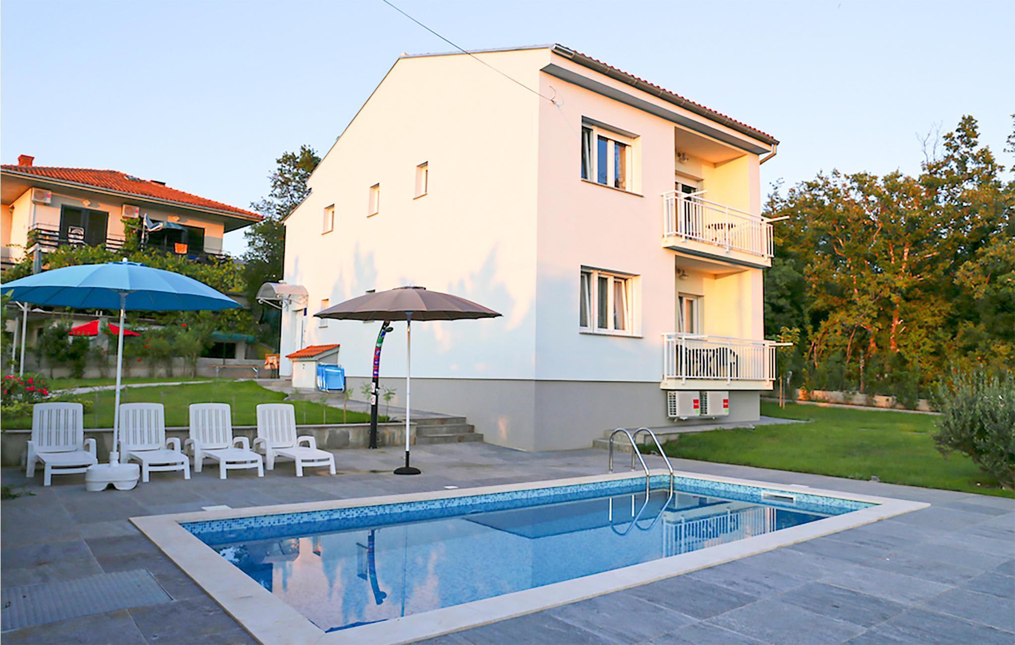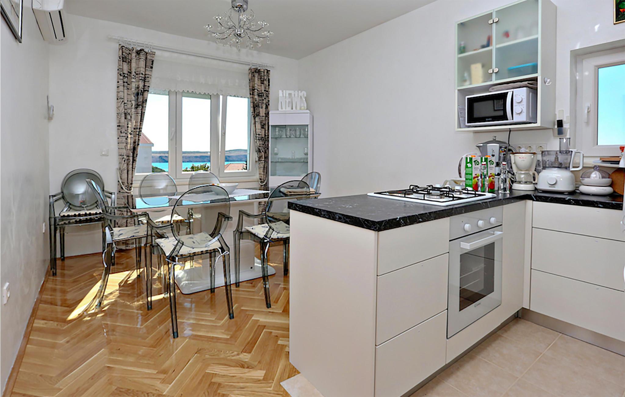Nyt ferien i Jadranovo og dette fargerike feriehuset, som ønsker deg velkommen med vennlige farger og god innredning i alle rom. På grunn av den komplette innredningen i begge etasjer kan du bruke huset optimalt med to vennlige familier som også ønsker privatliv. Den øverste etasjen har egen inngang og er forbundet med heis. Drikk morgenkaffen på balkongen og få det første glimtet av havet og øya Krk, eller tilbring dagen ved bassenget og avrund ferien med å grille i den inngjerdede hagen.