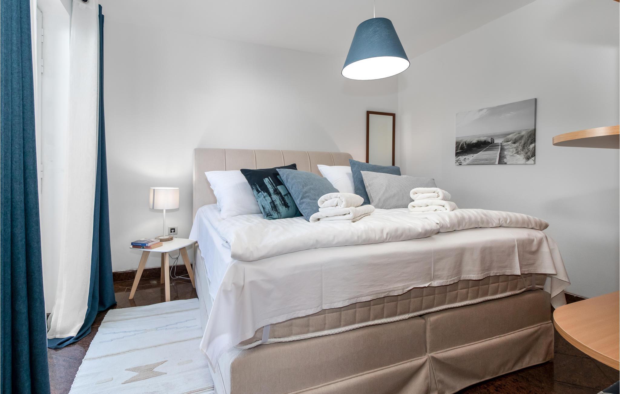 Den er hyggelig innredet og har egen terrasse, slik at du er sikret komfort og privatliv. Du kan enkelt nå strendene til fots fra hagen. Leiligheten er den mest komfortable i huset og består av to enheter, hvorav den ene består av kjøkken og stue, soverom og bad. Noen få trapper skiller deg fra den andre delen, som er innredet som en studioleilighet med et lite kjøkken og separat bad. Eiendommen er delt og inngjerdet.