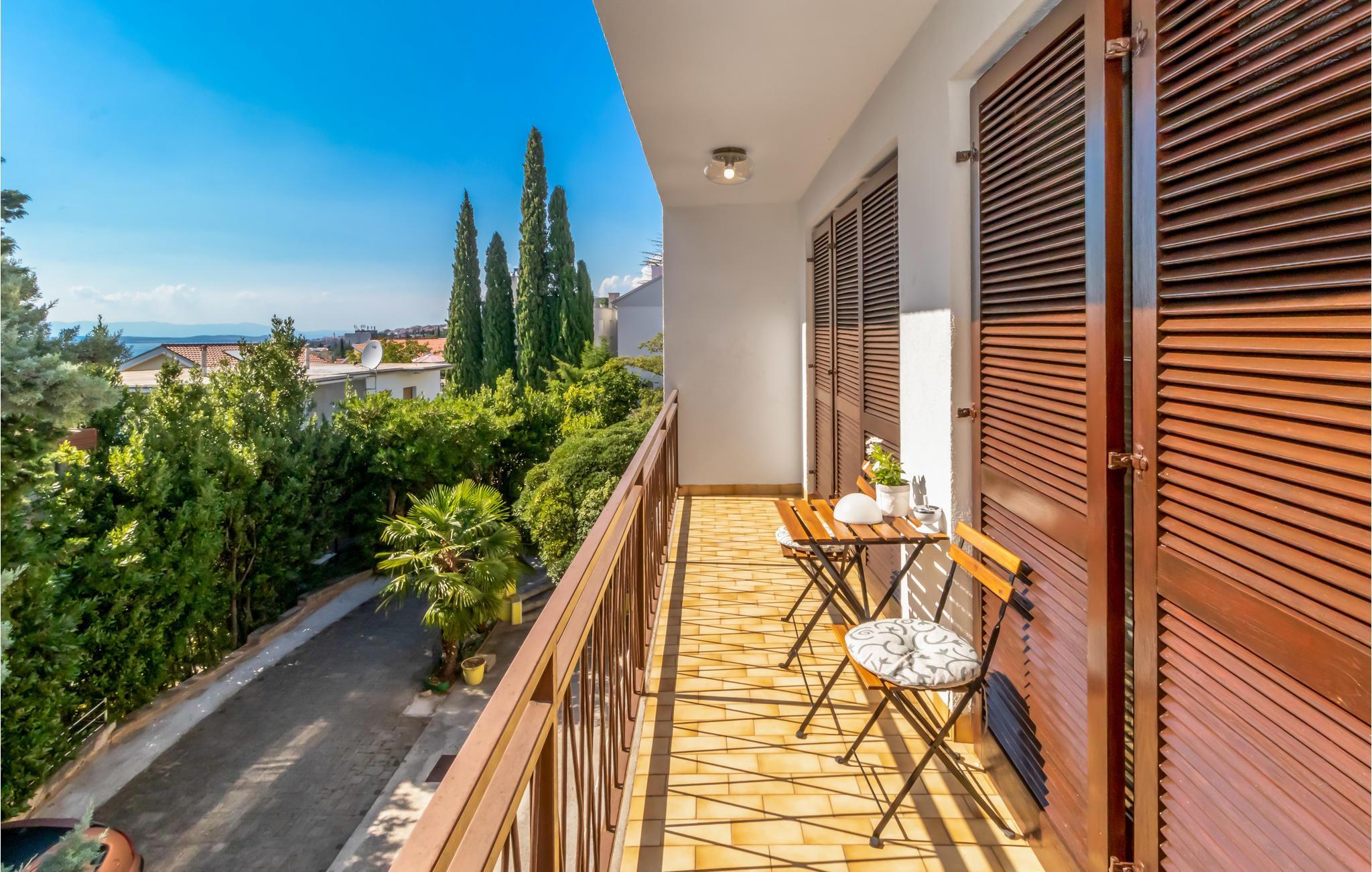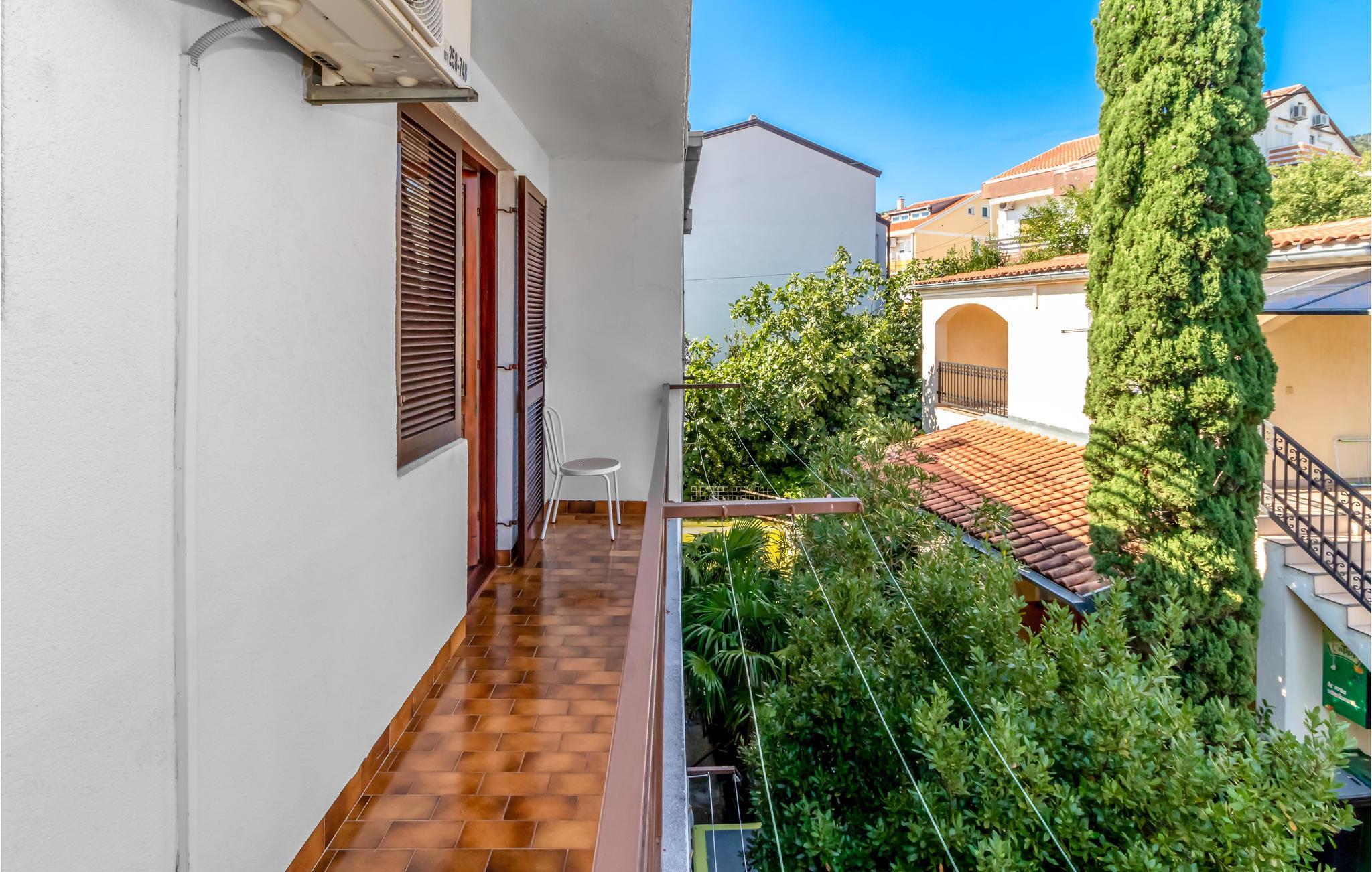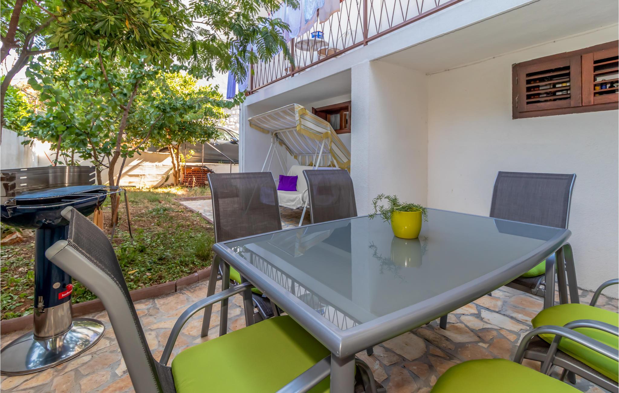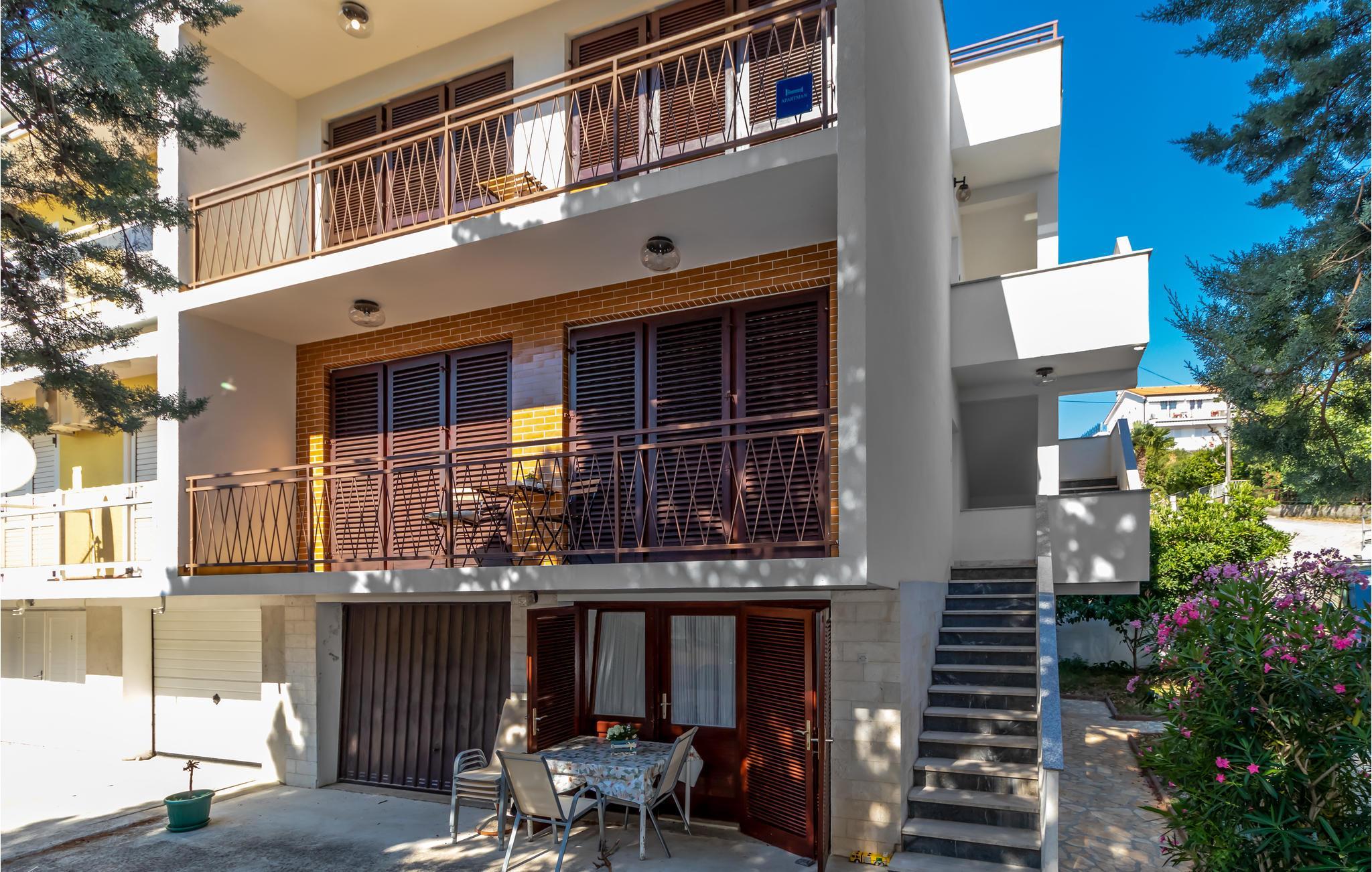 I den private hagen i første etasje er det en privat terrasse med grill. Leiligheten ligger i andre etasje og har en overbygd balkong på sjøsiden i hele sin lengde, som er tilgjengelig fra soverommene. Her kan du nyte utsikten over det åpne havet ved solnedgang på slutten av dagen med et glass god kroatisk vin. Det er også en overbygd balkong på baksiden, som kan nås fra kjøkkenet og spisestuen.