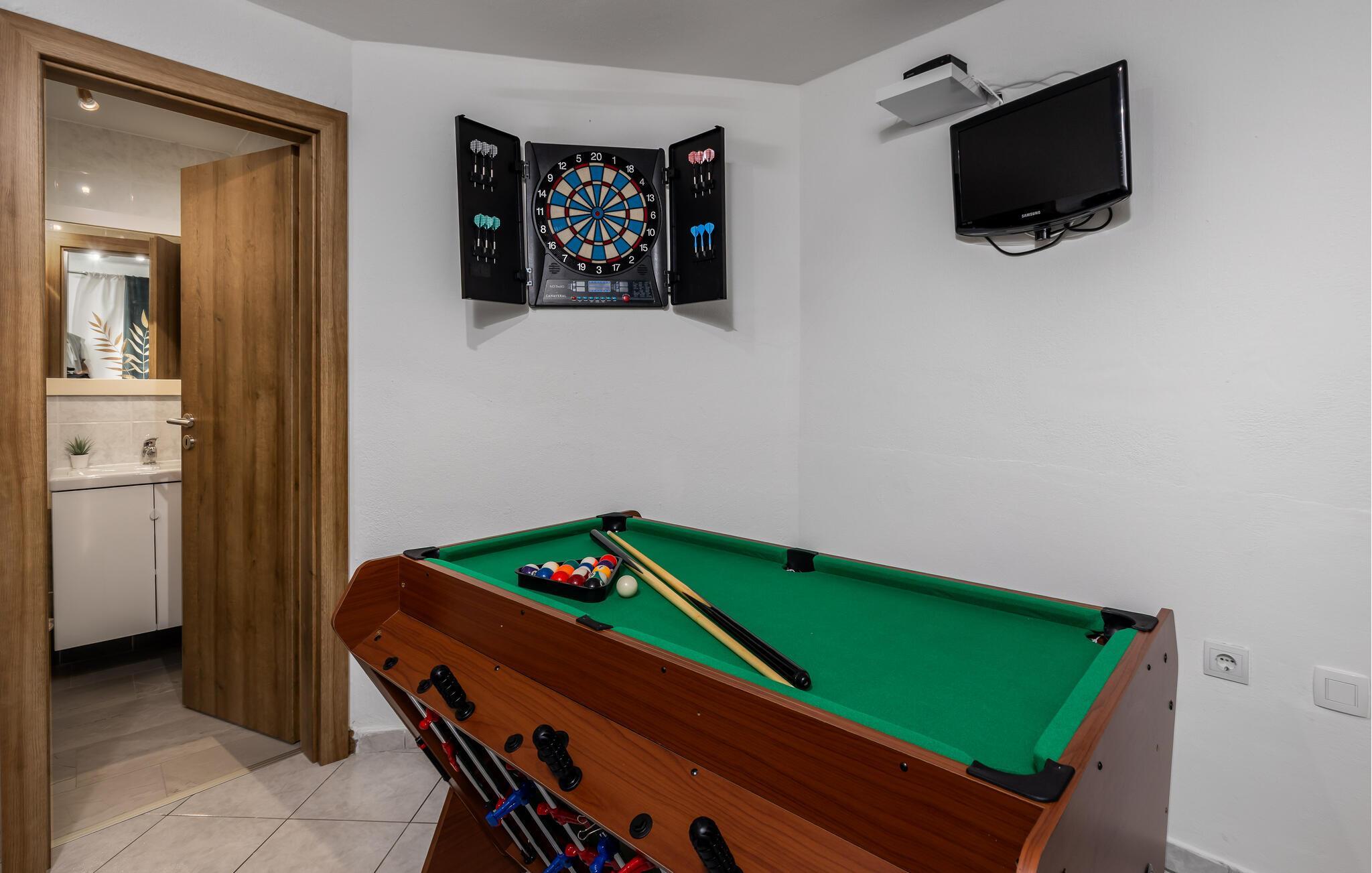 Dette romslige feriehuset ligger bare en kort spasertur fra sjøen, og skjemmer deg bort med attraktive ekstrafunksjoner som hele familien vil nyte. Nyt stilfulle måltider i den innbydende spisestuen, utfordre deg selv ved biljardbordet og tren i treningsrommet. Slå deg ned i den koselige sofaen for en hyggelig spillkveld eller stream favorittserien din.