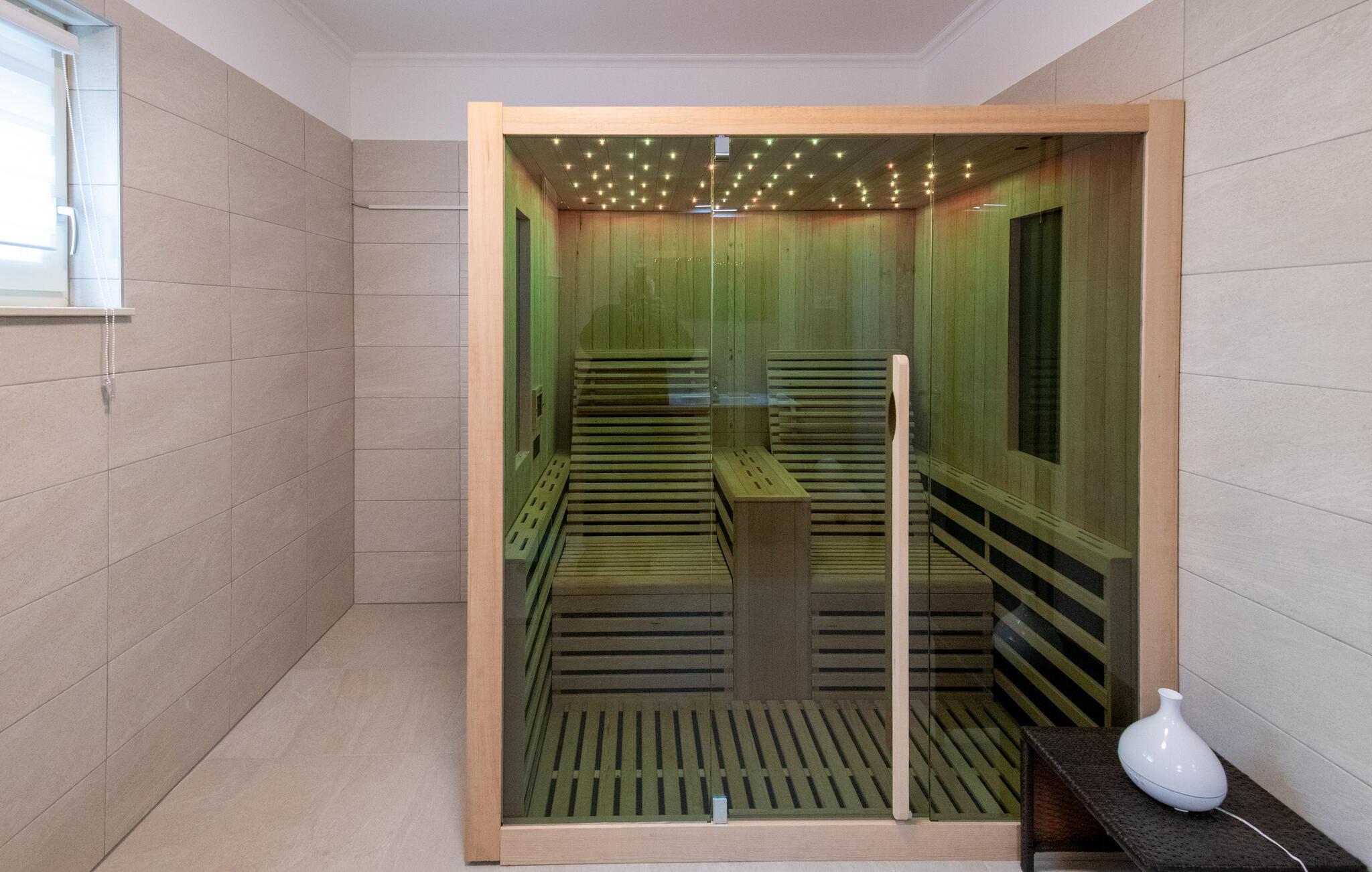 Tilbring en avslappende ferie i dette romslige feriehuset med basseng, badstue og sjøutsikt.