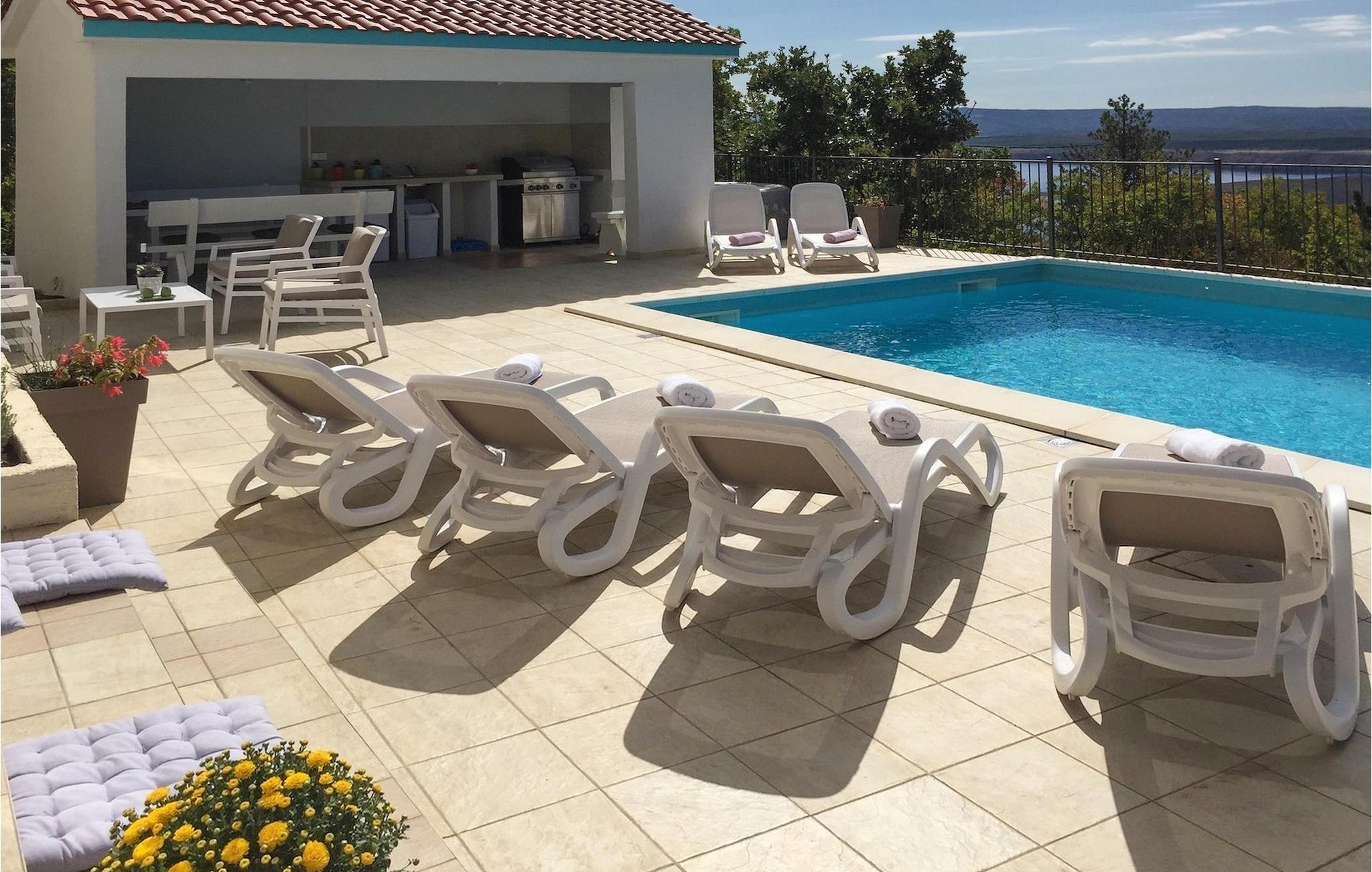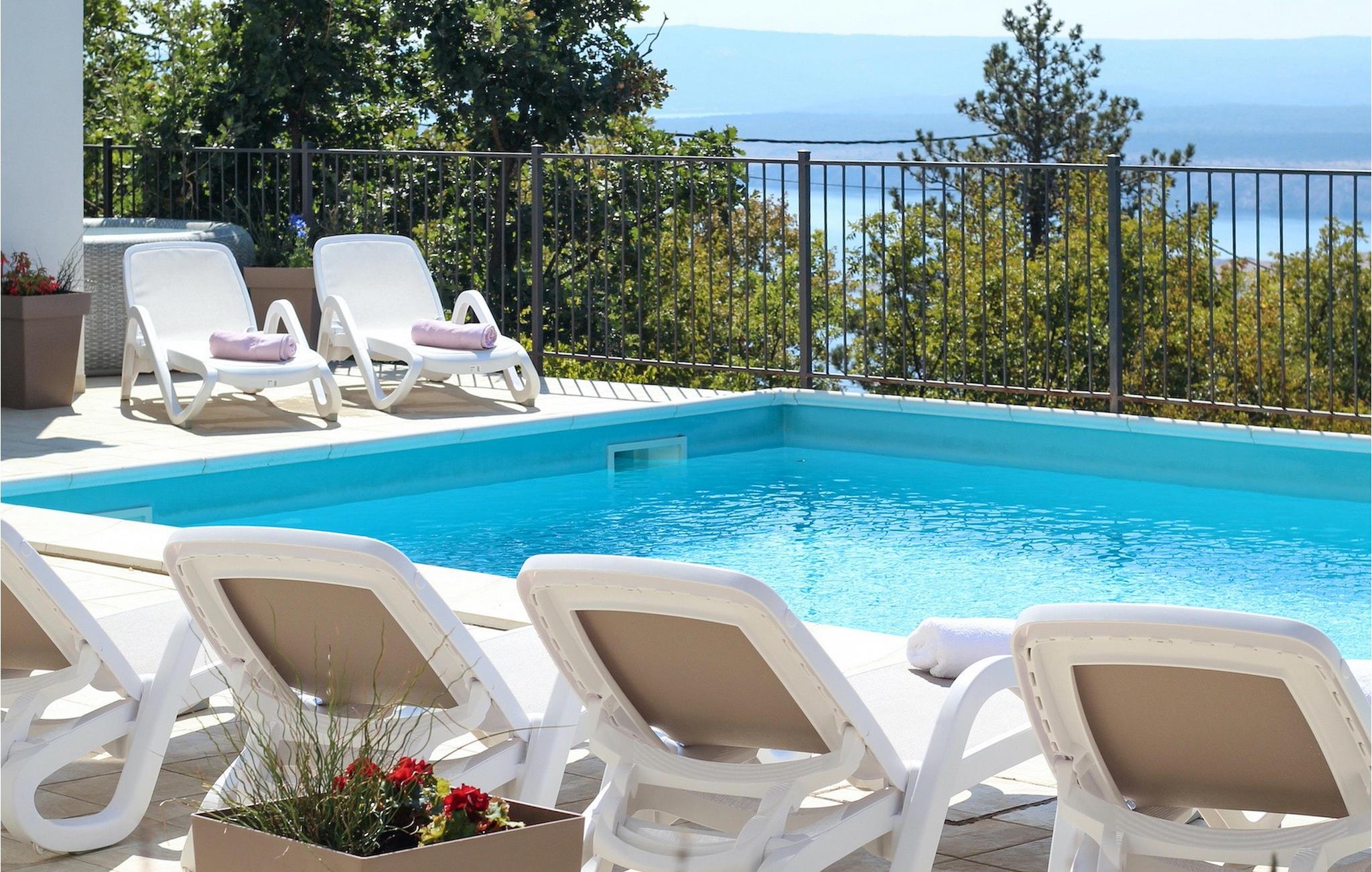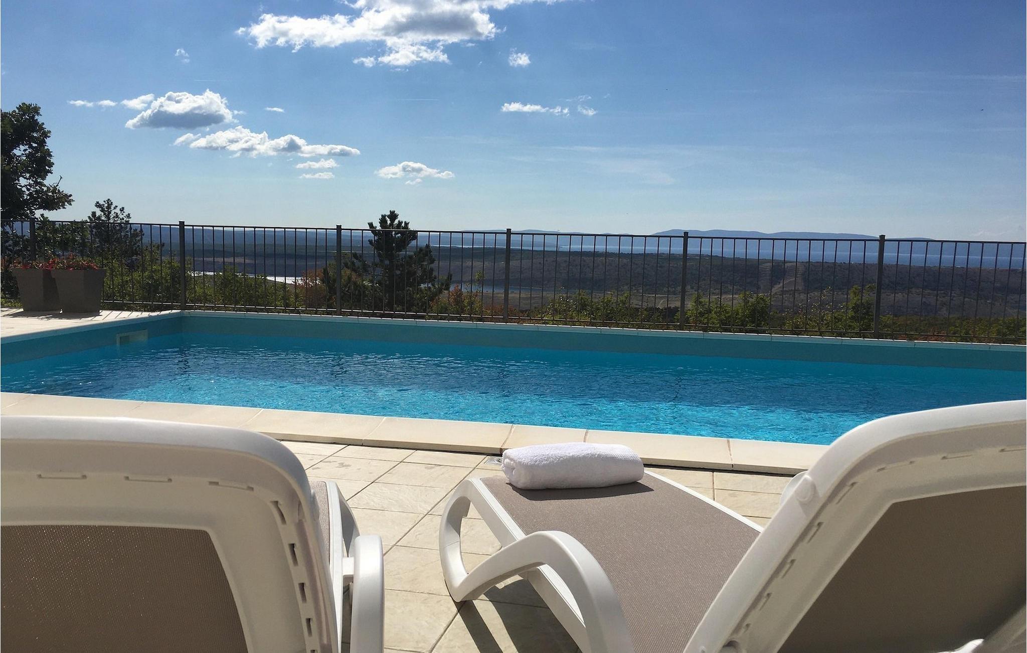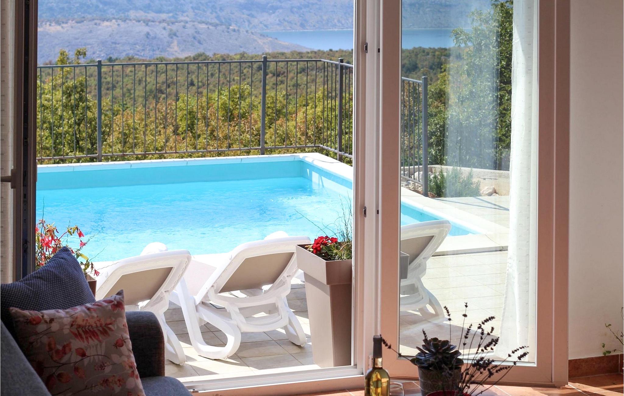 Villa Aqua ligger i den lille landsbyen Smrika nær øya Krk. Villaen har plass til opptil 8 personer og tilbyr nok plass til familier eller vennegrupper. Eiendommen har en fantastisk utsikt over havet og øyene. Det private bassenget inviterer deg til å kjøle deg ned på varme sommerdager. Rundt bassenget er det solsenger hvor du kan slappe av. Villaen har et sjarmerende interiør. I første etasje har villaen et åpent rom med et fullt utstyrt kjøkken og spiseplass, en koselig stue og et bad. I 1. etasje er det 3 komfortable soverom og 2 bad. 2 soverom har hver en dobbeltseng og tilgang til den felles balkongen, som er perfekt for å nyte morgenkaffen. Villaens beliggenhet gir fullstendig privatliv - en fantastisk ferie er garantert. Bestill nå og nyt Villa Aqua, som ligger i den lille landsbyen mrika nær øya Krk. Kraljevica, den nærmeste stranden, ligger bare 1,2 kilometer fra villaen. Villa Aqua overrasker sine besøkende med sin beliggenhet. Den magiske utsikten strekker seg helt til øya Krk. Du finner restauranter og kafeer i landsbyen Mrika. Supermarkeder finner du i Crikvenica, som ligger omtrent 9 kilometer fra villaen. Sørg for å utforske naturen som omgir Villa Aqua og nyt skjønnheten den byr på.