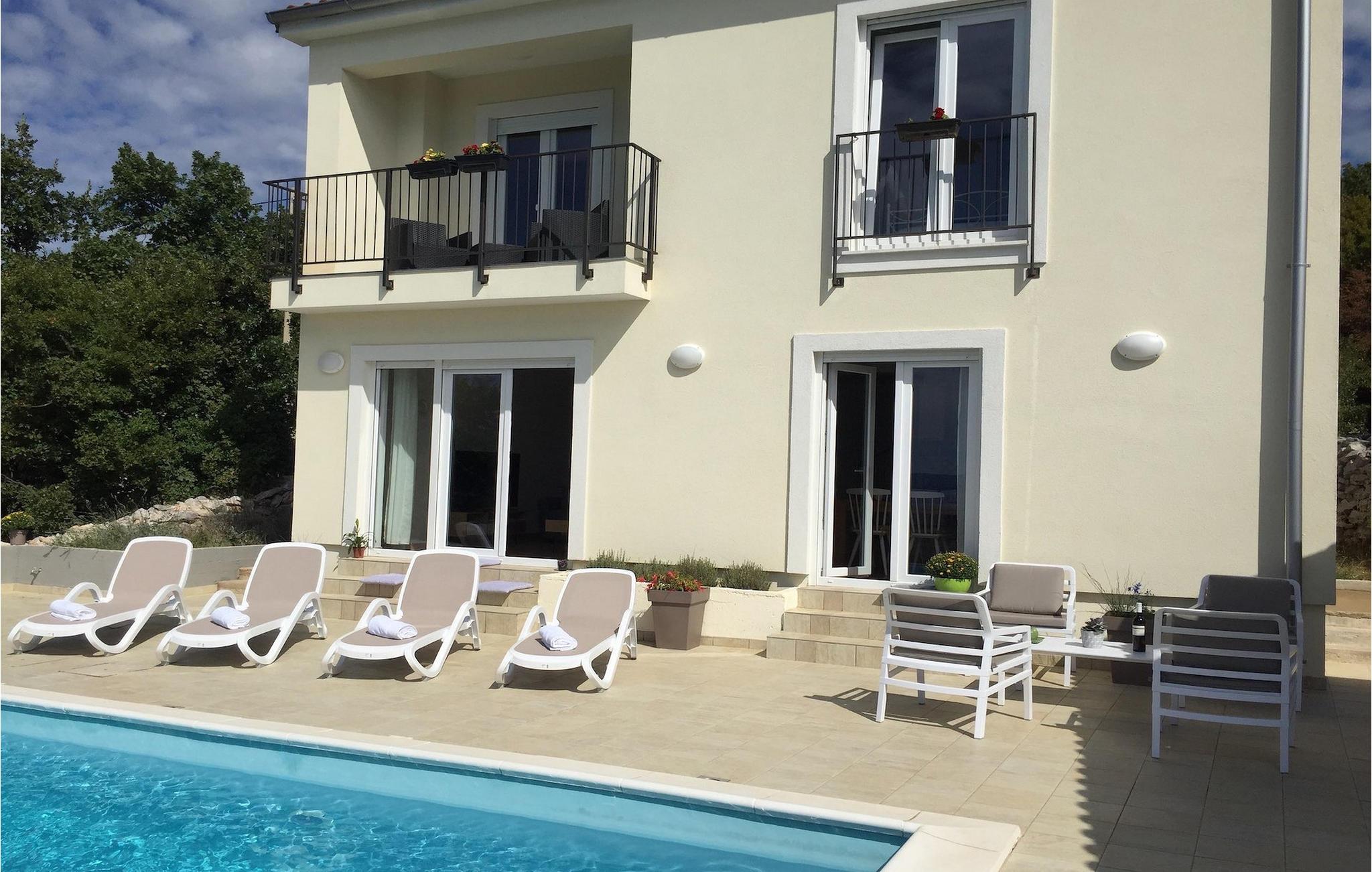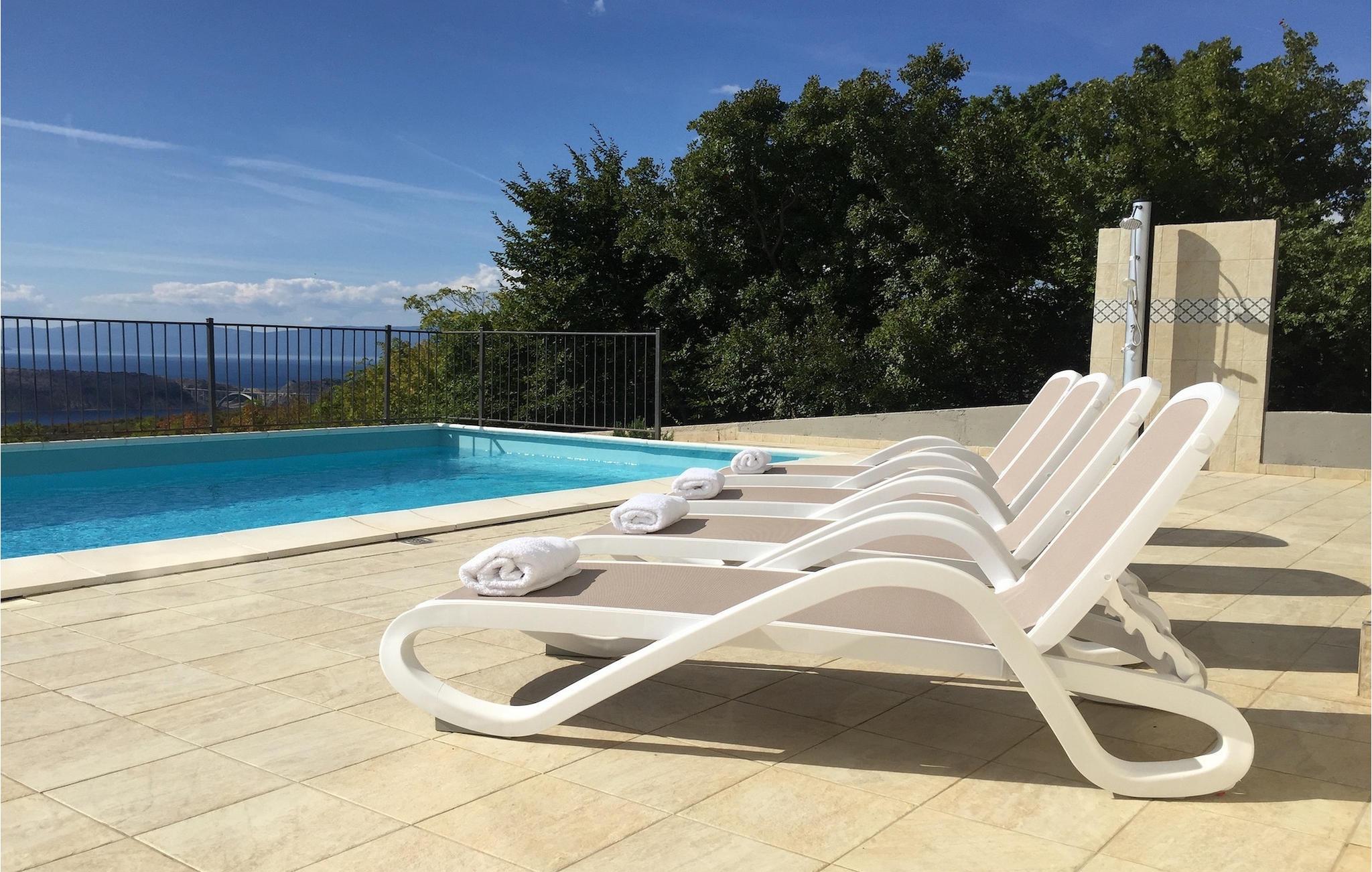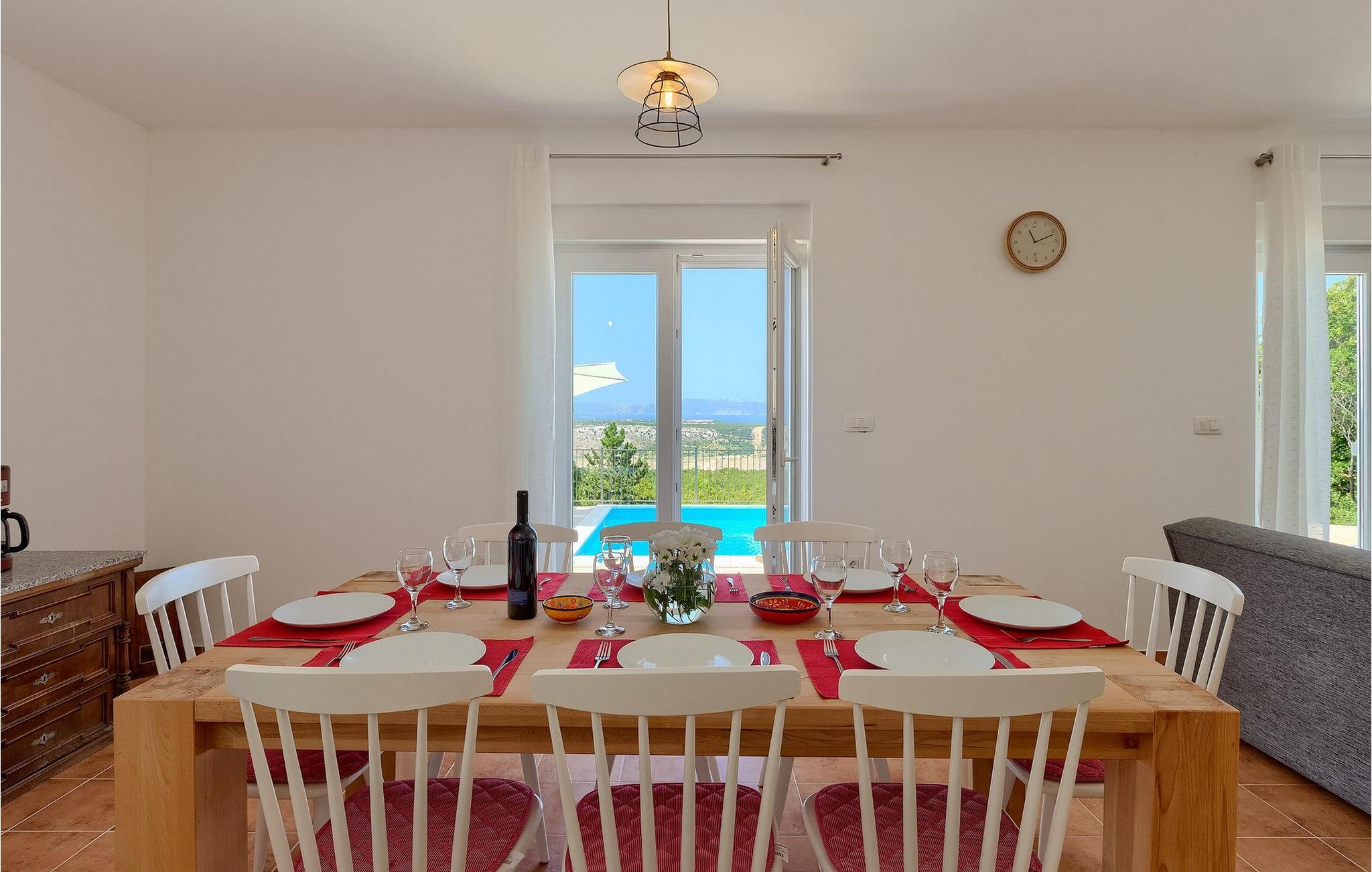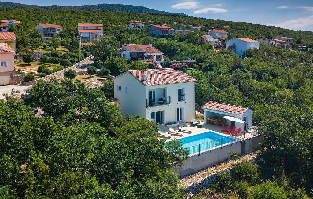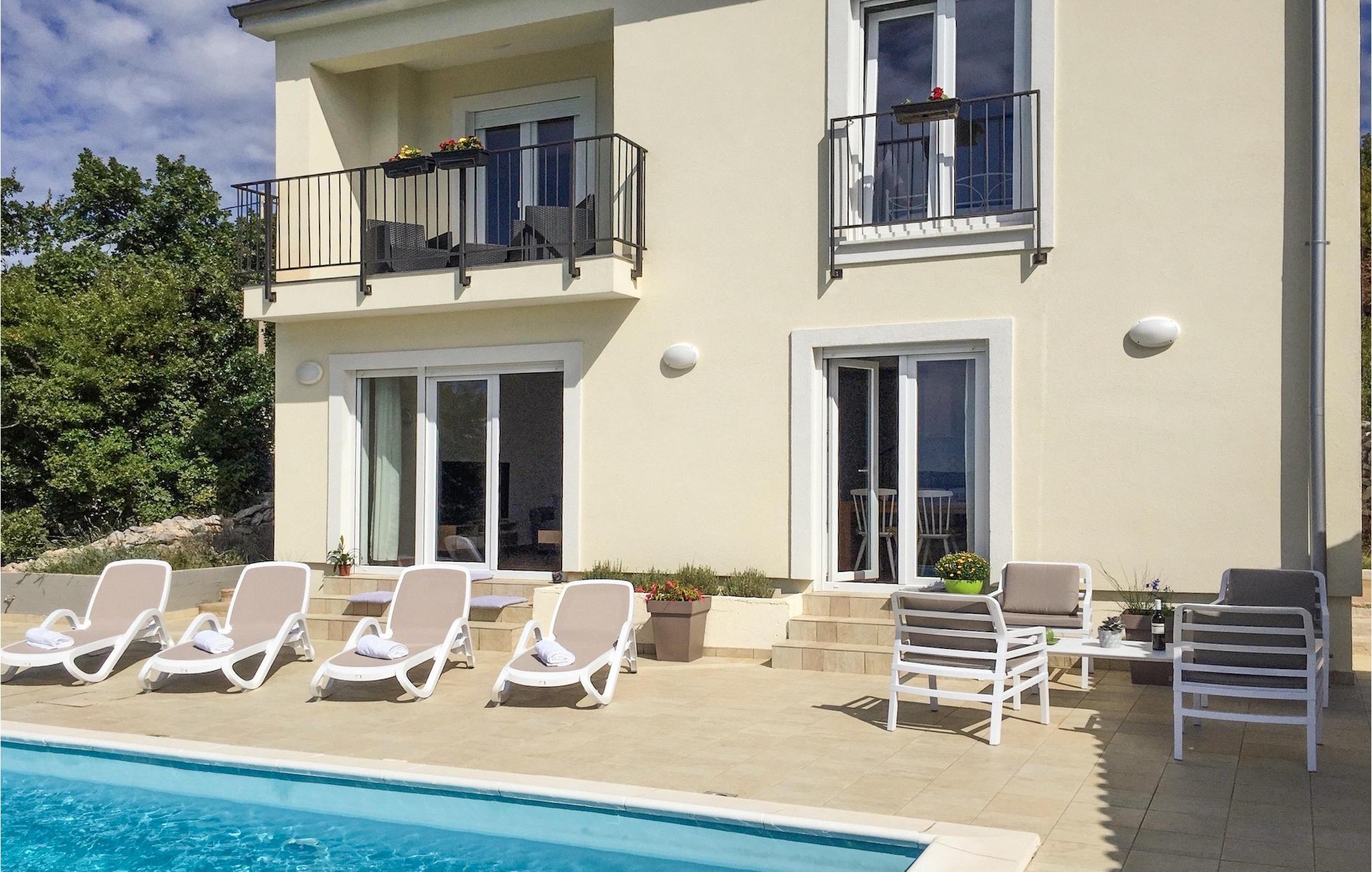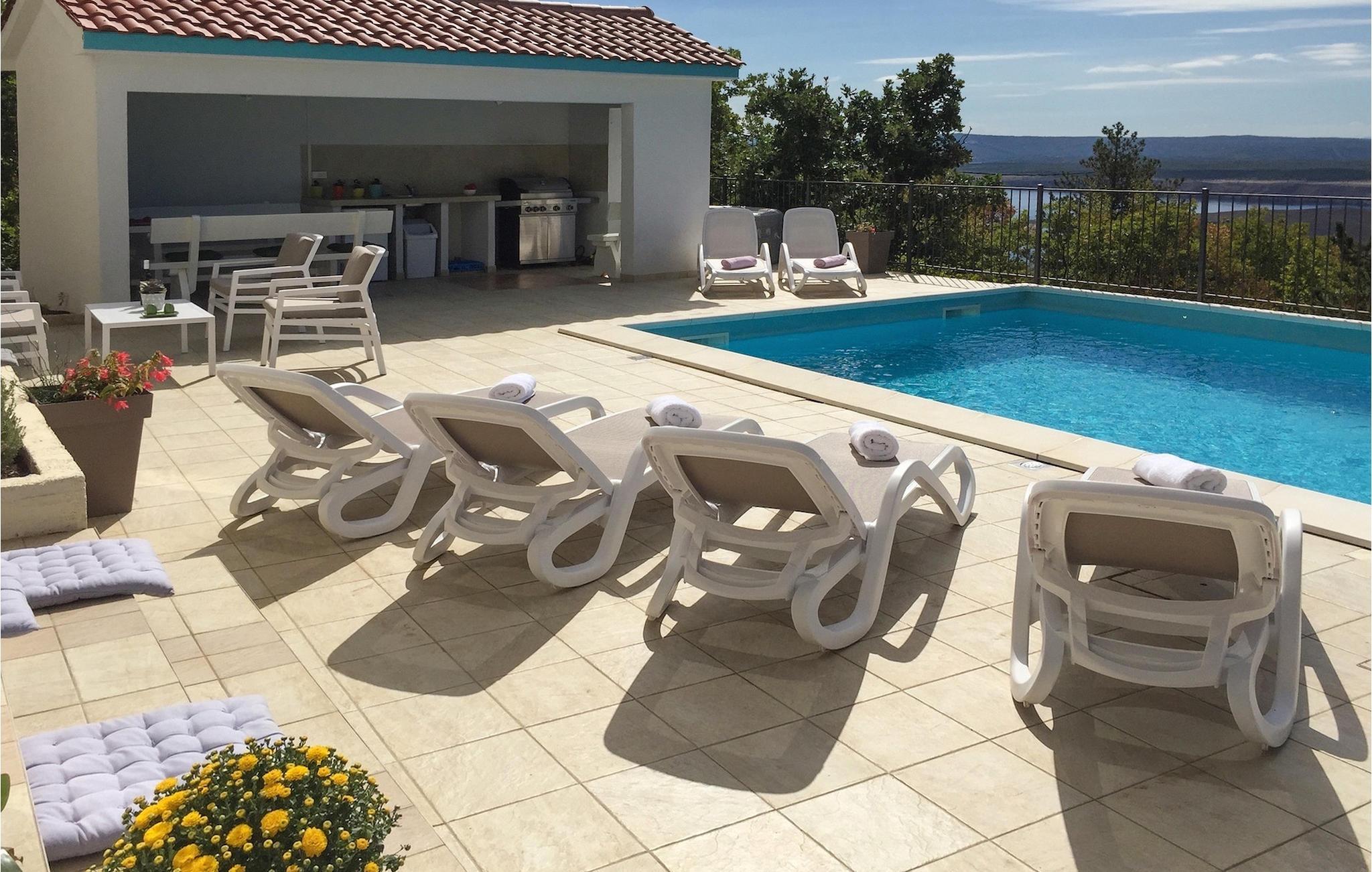 Villa Aqua ligger i den lille landsbyen Smrika nær øya Krk. Villaen har plass til opptil 8 personer og tilbyr nok plass til familier eller vennegrupper. Eiendommen har en fantastisk utsikt over havet og øyene. Det private bassenget inviterer deg til å kjøle deg ned på varme sommerdager. Rundt bassenget er det solsenger hvor du kan slappe av. Villaen har et sjarmerende interiør. I første etasje har villaen et åpent rom med et fullt utstyrt kjøkken og spiseplass, en koselig stue og et bad. I 1. etasje er det 3 komfortable soverom og 2 bad. 2 soverom har hver en dobbeltseng og tilgang til den felles balkongen, som er perfekt for å nyte morgenkaffen. Villaens beliggenhet gir fullstendig privatliv - en fantastisk ferie er garantert. Bestill nå og nyt Villa Aqua, som ligger i den lille landsbyen mrika nær øya Krk. Kraljevica, den nærmeste stranden, ligger bare 1,2 kilometer fra villaen. Villa Aqua overrasker sine besøkende med sin beliggenhet. Den magiske utsikten strekker seg helt til øya Krk. Du finner restauranter og kafeer i landsbyen Mrika. Supermarkeder finner du i Crikvenica, som ligger omtrent 9 kilometer fra villaen. Sørg for å utforske naturen som omgir Villa Aqua og nyt skjønnheten den byr på.
