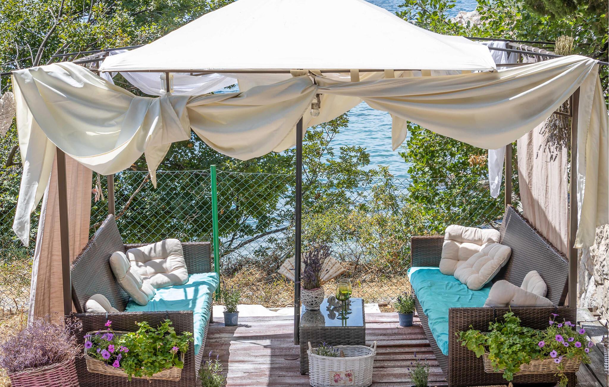 Den bortgjemte terrassen er et flott sted å slappe av utendørs. La deg fortrylle av utsikten over havet i skyggen av de gamle trærne, og nyt noe kaldt å drikke eller noen delikatesser fra grillen.