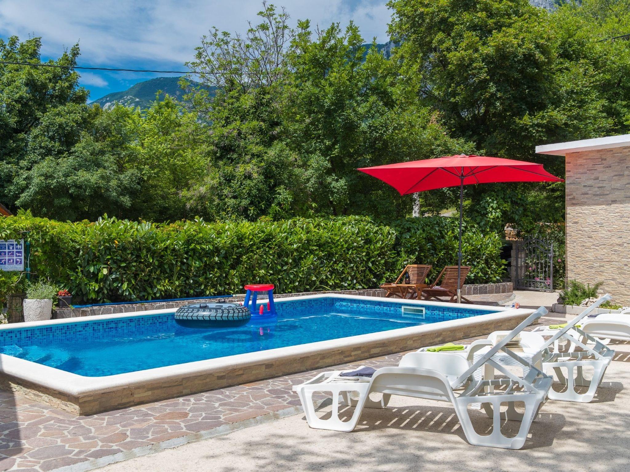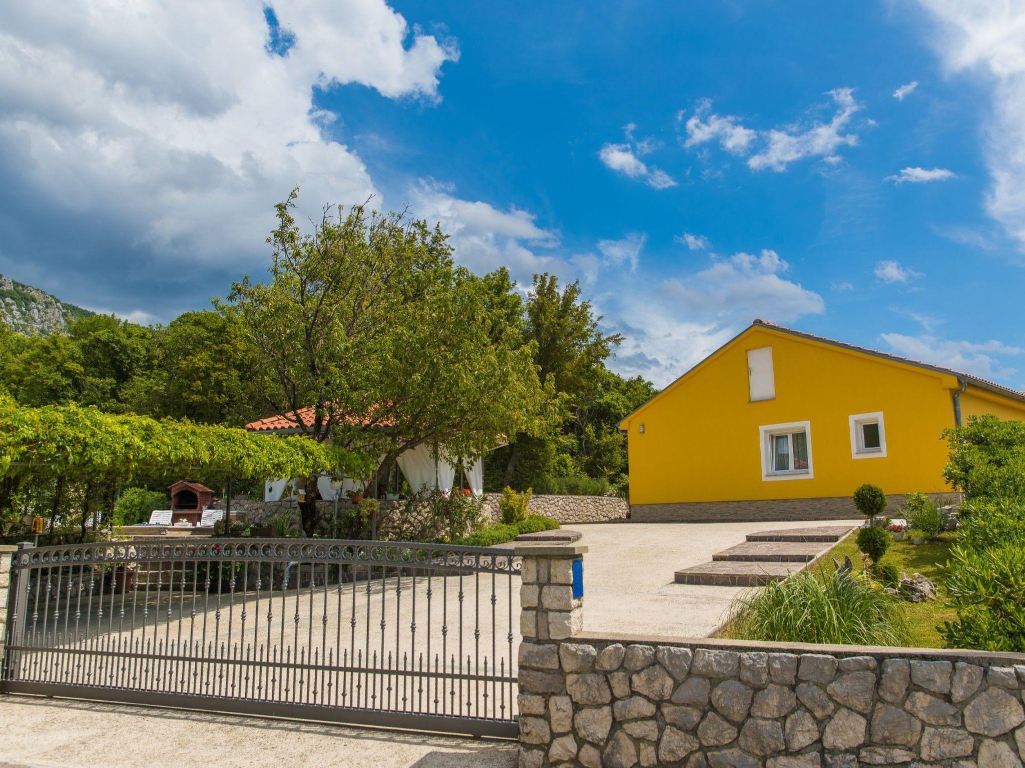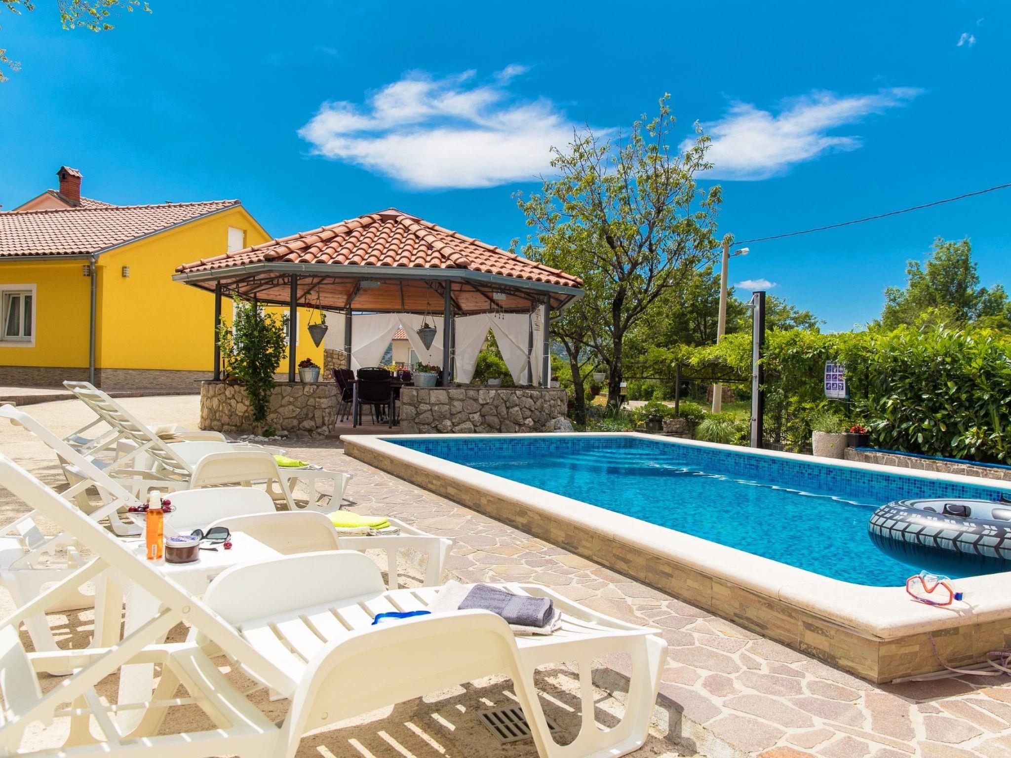 This holiday home with swimming pool for 4-6 people surrounded by greenery is located in the beautiful hinterland of Crikvenica.The closest town is the famous seaside resort Crikvenica in the Kvarner Bay, which can be reached in just a few minutes by car.The fully fenced 250 m² property and the comfortable 75 m² house with is ideal for families.DETAILED DESCRIPTION:Outdoor area:To make hot summer days as pleasant as possible, guests have access to a 22 m² covered terrace with seating for 8 people, and a 25 m² swimming pool is located in front of the terrace. A stone grill and a gas grill are available for grill lovers.There is a playground for children with swings, a slide, a wooden house and other toys.The gate and garage for 2 cars are opened by remote control.Indoor area:The entrance area leads directly into the large and modern living and dining room with a fully equipped kitchen with a dishwasher and espresso machine. In the living area is a wood-burning fireplace that can be used on cold days. The 2 bedrooms are each furnished with a double bed. The spacious bathroom has a bath, toilet and a washing machine.In addition, the house offers satellite TV in the living area and in both bedrooms and Internet via WiFi.Living area:Living/dining room and kitchen are in one room, sofa bed for two people, terrace, parquet, tiles, radio, DVD player, satellite TVKitchen:Kitchen, dishes, kitchen towels, electric/gas cooker combined, hot plates: 4, oven, refrigerator with freezer, filter coffee machine, kettle, microwave, toaster, dishwasherBedroom:Double room with double bed, laminateDouble room with double bed, laminateBathroom:Bathroom with toilet, showerBalcony/terrace:Private terrace, covered, seating, loungers, parasol, terrace size: 22 m²More information:Garden for use, barbecue, you can bring barbecue, parking on the property, swimming pool, swimming pool size: 25 m², outdoor shower, pets allowed, daily fee for pet: 15.00 EUR per day, heating, air conditioning included in the price, bed linen available, towels available, hair dryer, washing machine in the apartment, internet via W-LAN, 2 garage parking spaces, 2 parking spaces in the courtyard, 4 additional parking spaces in front of the houseDistances:to the sea 5,1 km, sandy beach 5,65 km, fine pebble beach 5,25 km, pebble beach 5,25 km, rocky beach 5,85 km, concrete beach 5,85 km, center 4,85 km, restaurant 4,85 km, supermarket 4,85 km, boat mooring 4,85 km, diving center 6,35 km, discotheque 4,95 km
