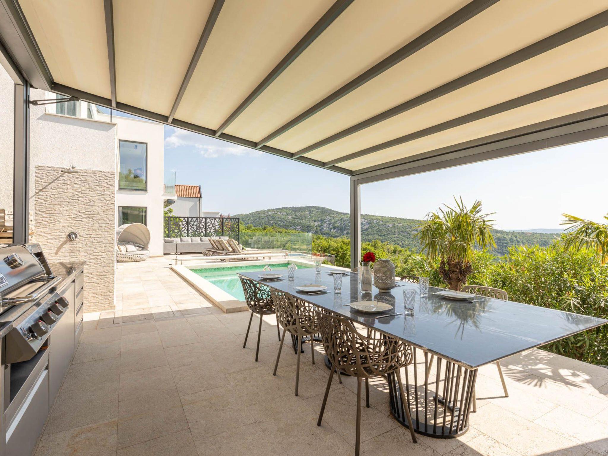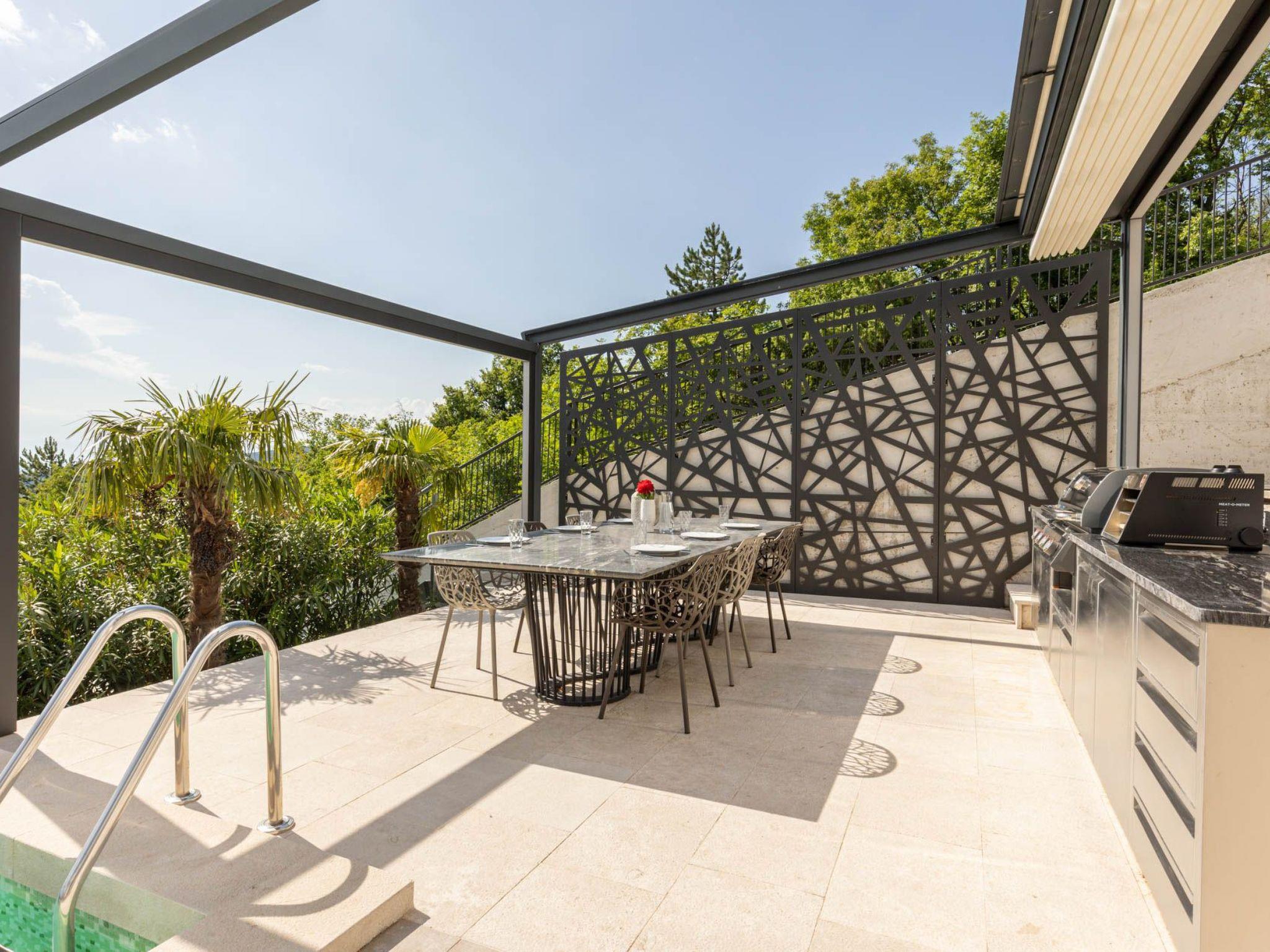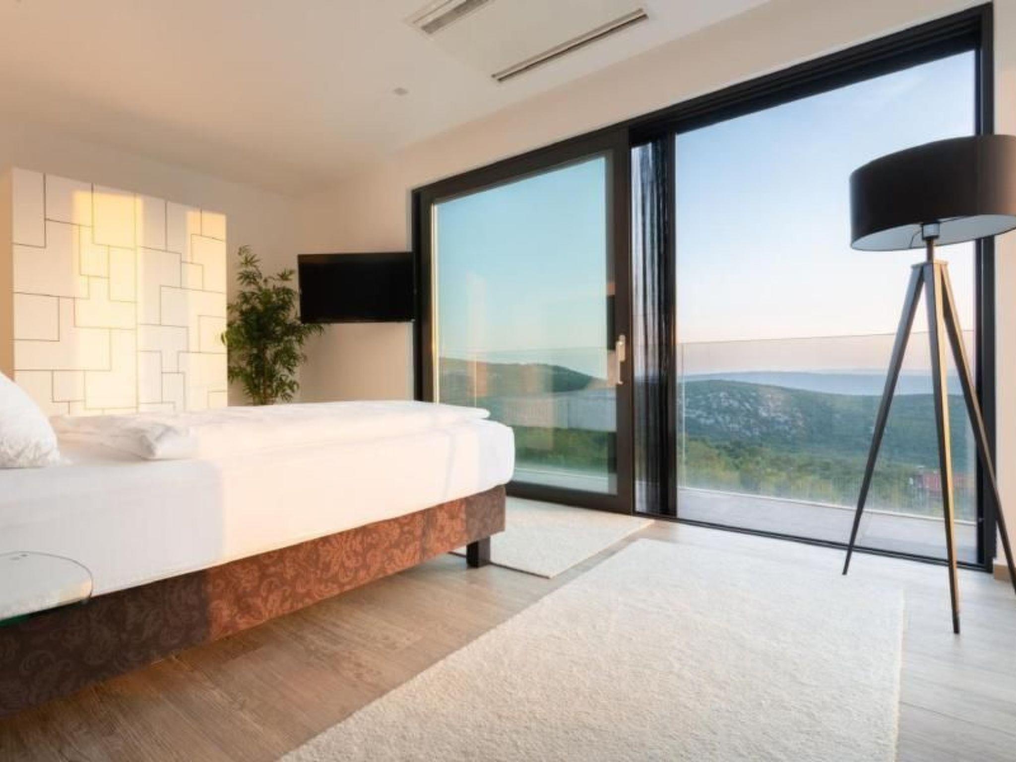 Design holiday home Croatia. Fantastic panoramic location in the mountains with sea view. Pleasant climate due to mountain location. Fully air-conditioned. Heated outdoor pool and hot spring whirlpool. Beautiful garden with palm trees. Very quiet location. Ultra fast internet. Shopping facilities at 3000 metres.