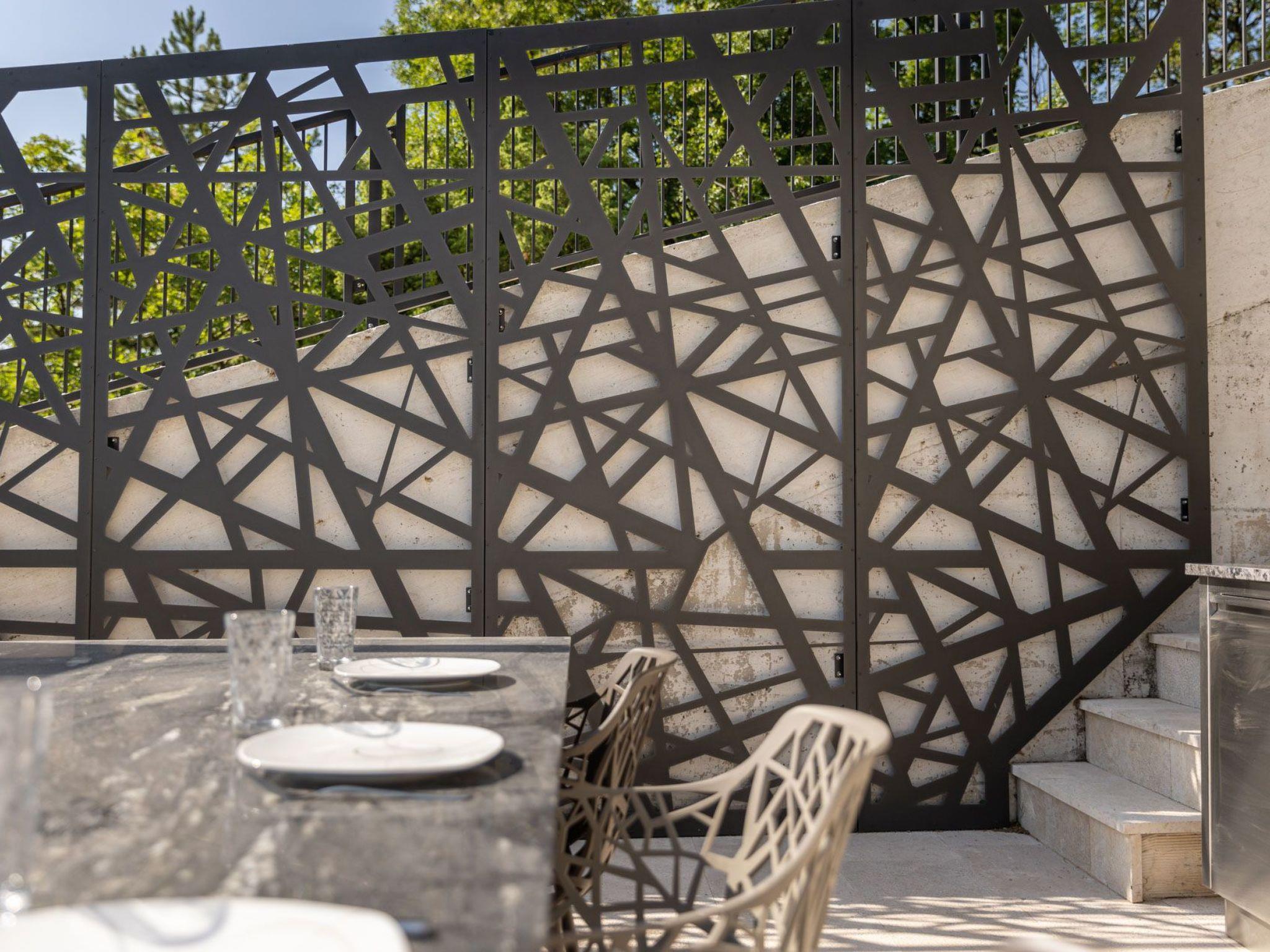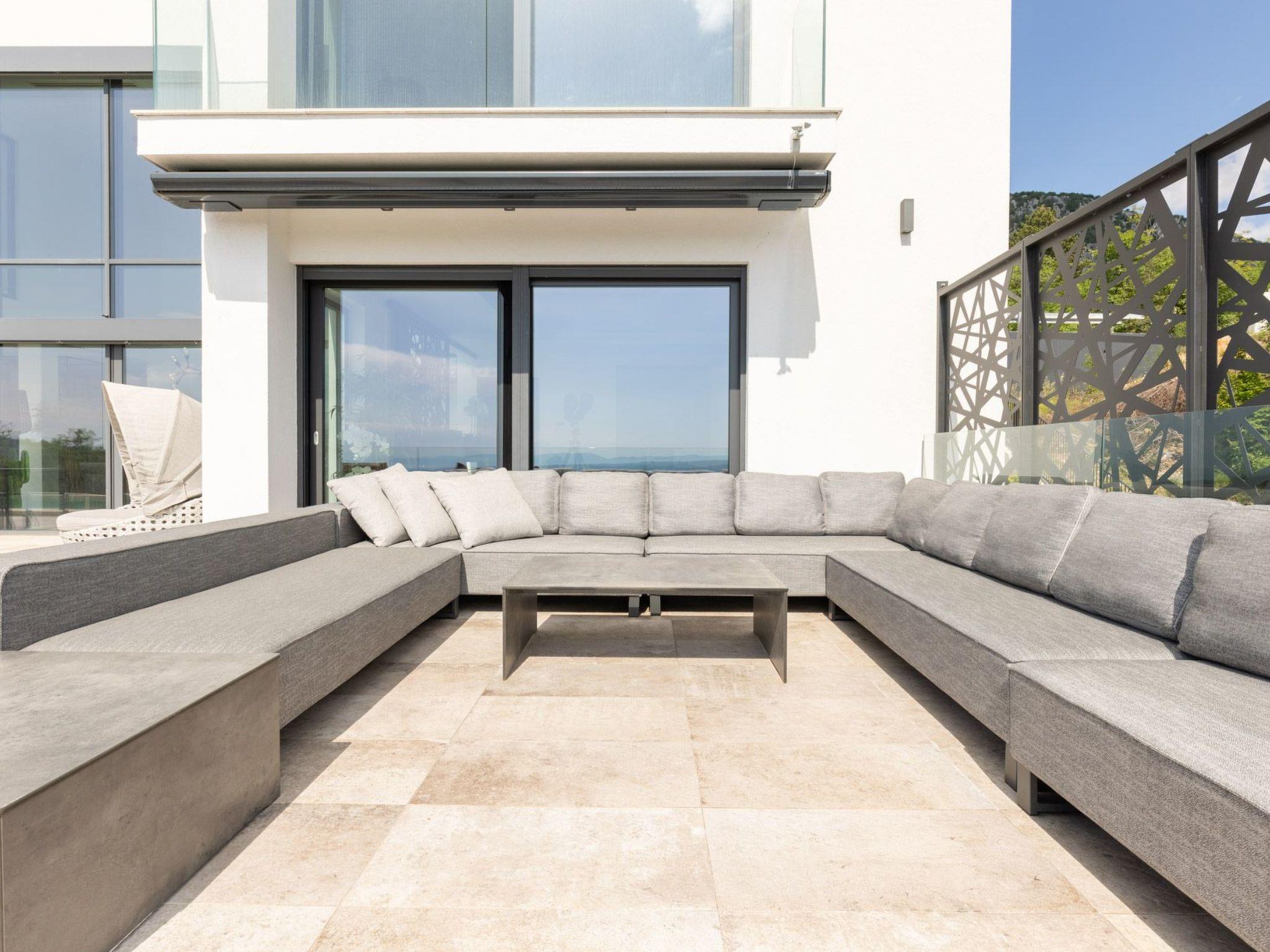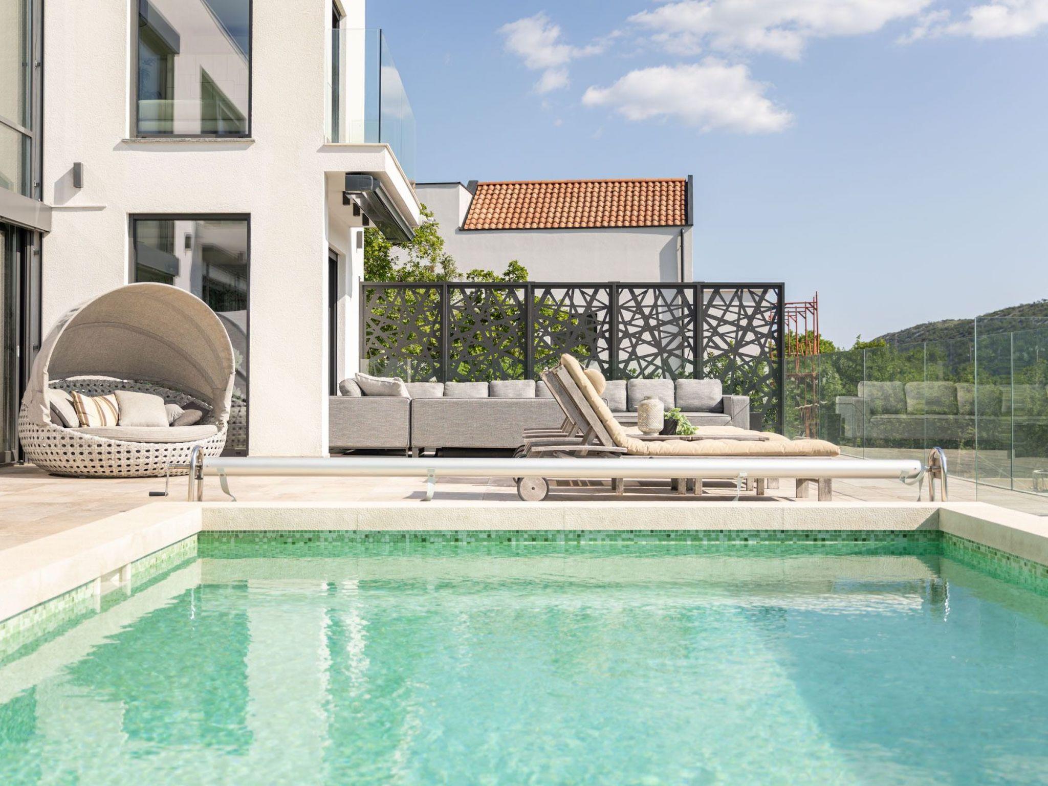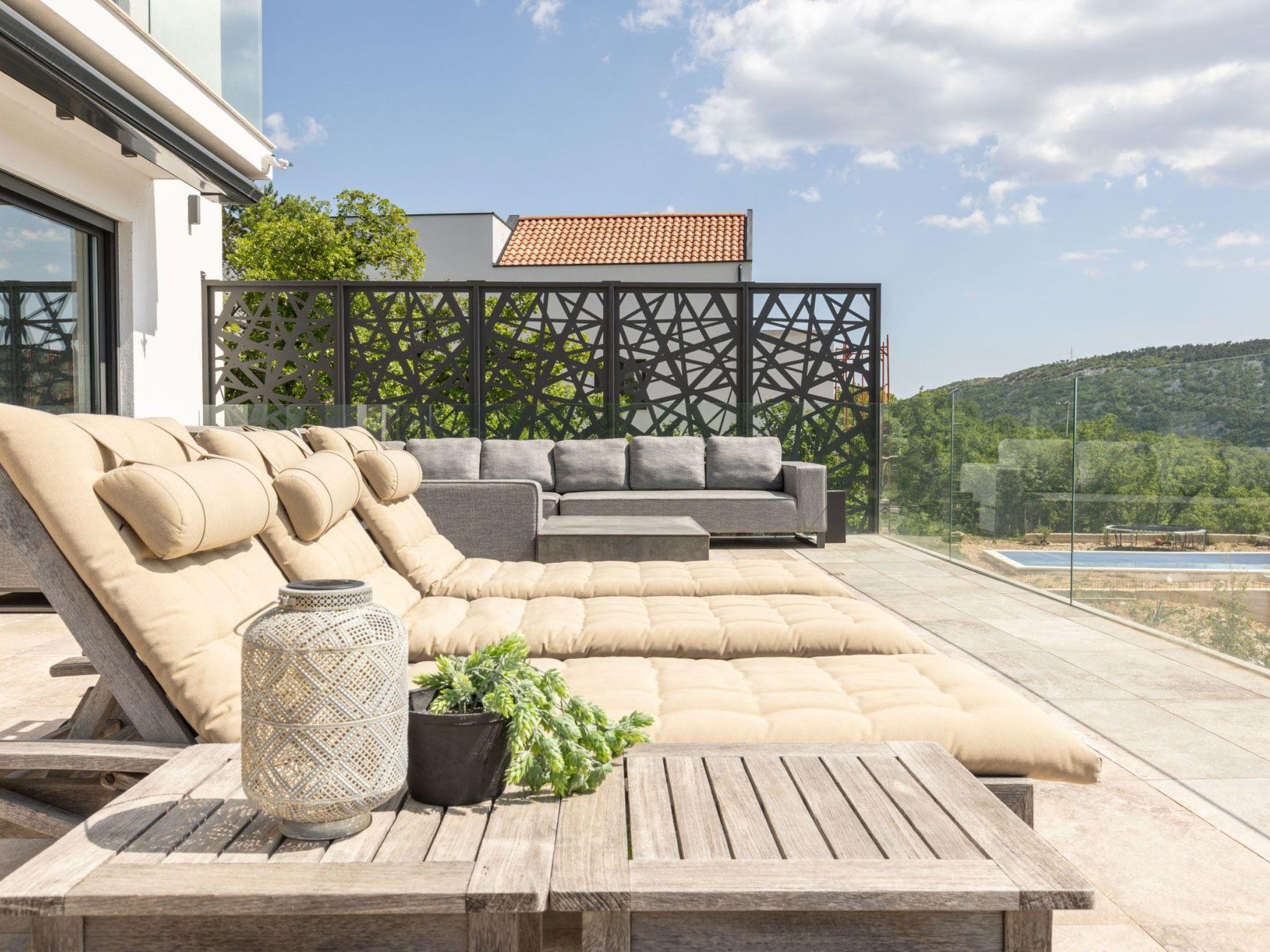 Design holiday home Croatia. Fantastic panoramic location in the mountains with sea view. Pleasant climate due to mountain location. Fully air-conditioned. Heated outdoor pool and hot spring whirlpool. Beautiful garden with palm trees. Very quiet location. Ultra fast internet. Shopping facilities at 3000 metres.