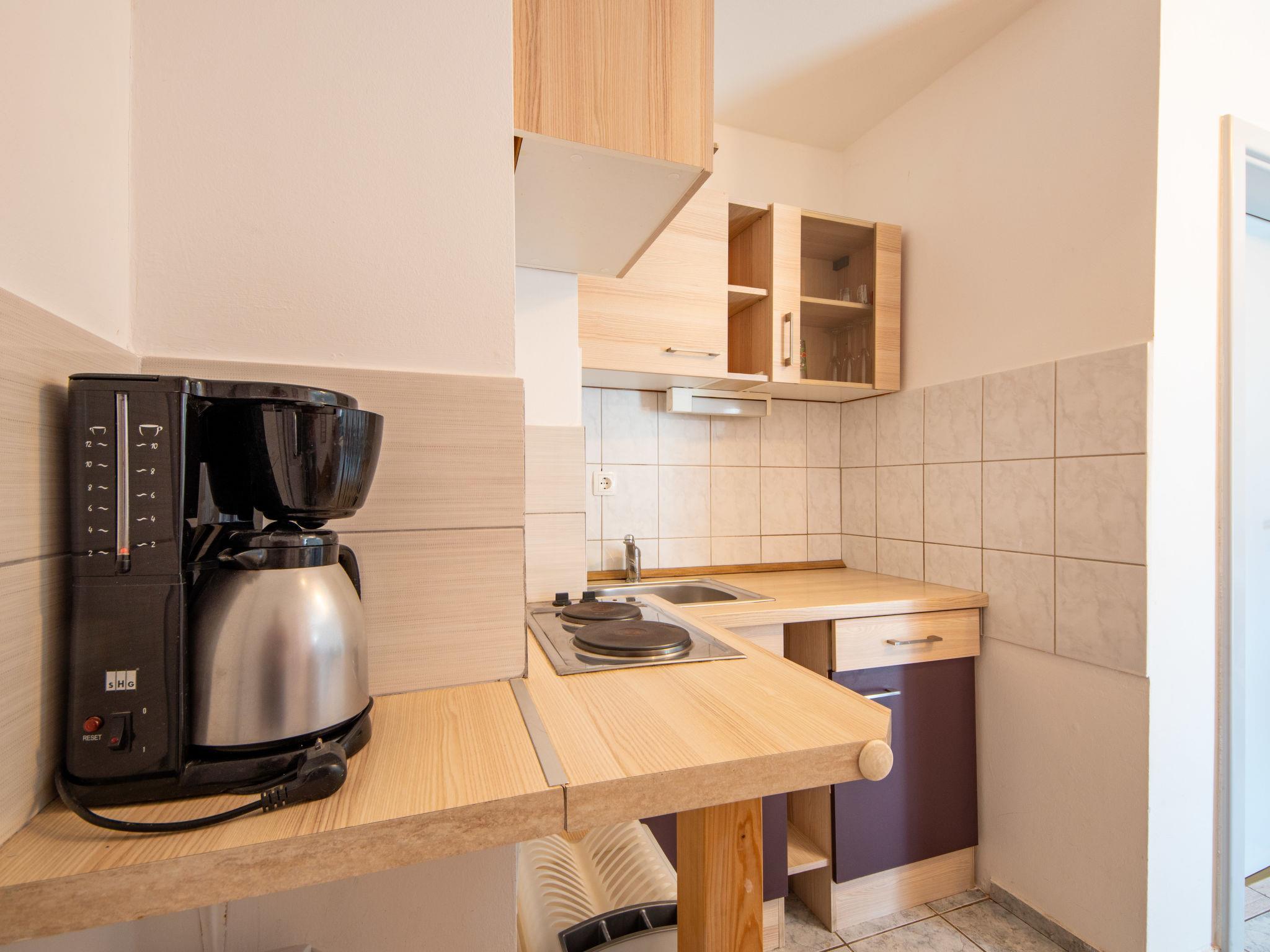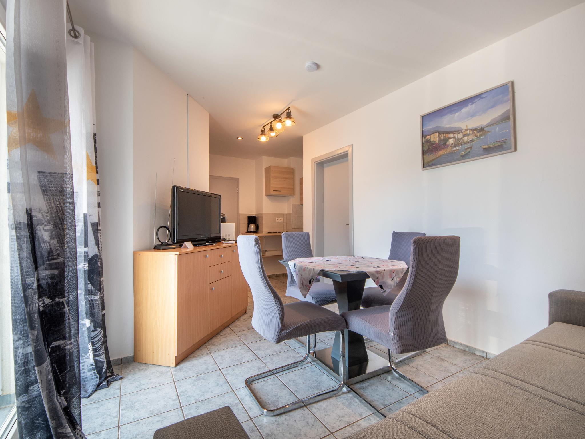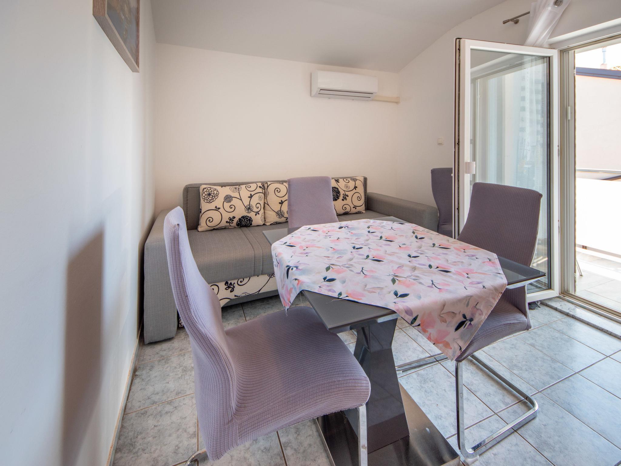 2-room apartment 35 m2 on 2nd floor. Living/dining room with 1 double sofabed (2 x 70 cm, length 190 cm), digital TV and air conditioning. Exit to the terrace. 1 room with 1 french bed (160 cm, length 200 cm). Open kitchen (2 ceramic glass hob hotplates, kettle, freezer, electric coffee machine). Shower/WC. No heating option. Balcony 4 m2. Balcony furniture. Side view of the sea. Facilities: Internet (WiFi, free). Parking (1 car) at the house.