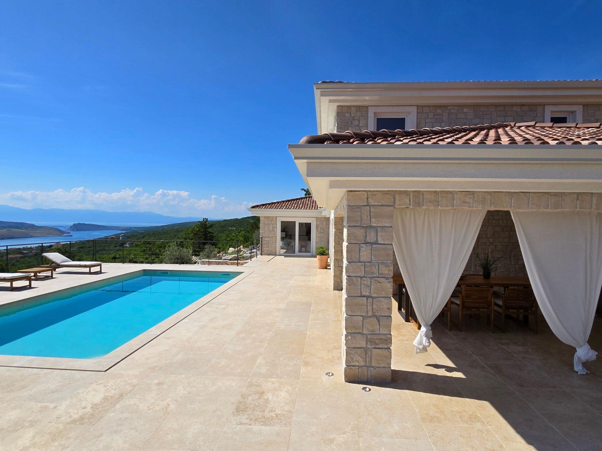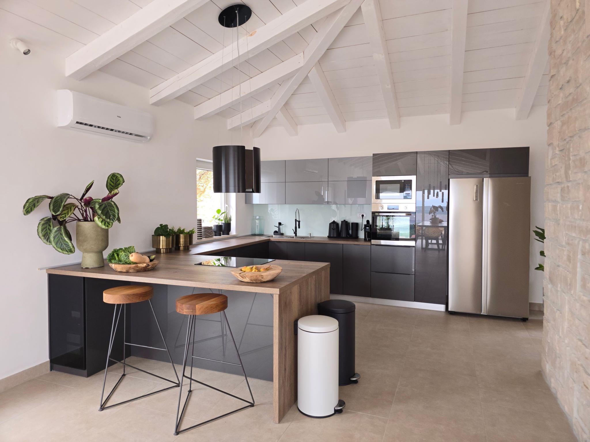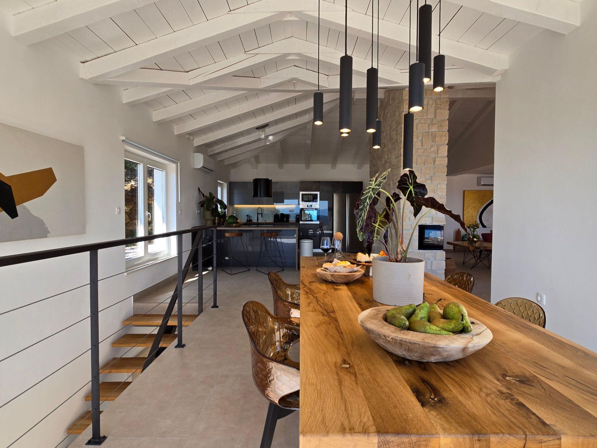 The villa has two terraces. While the lower one offers relaxation in the jacuzzi, the main terrace with a large pool attracts attention with its panoramic view and invites you to sunbathe and refresh. The covered area is completed with a barbecue and an outdoor dining area so you can enjoy your meals outdoors.