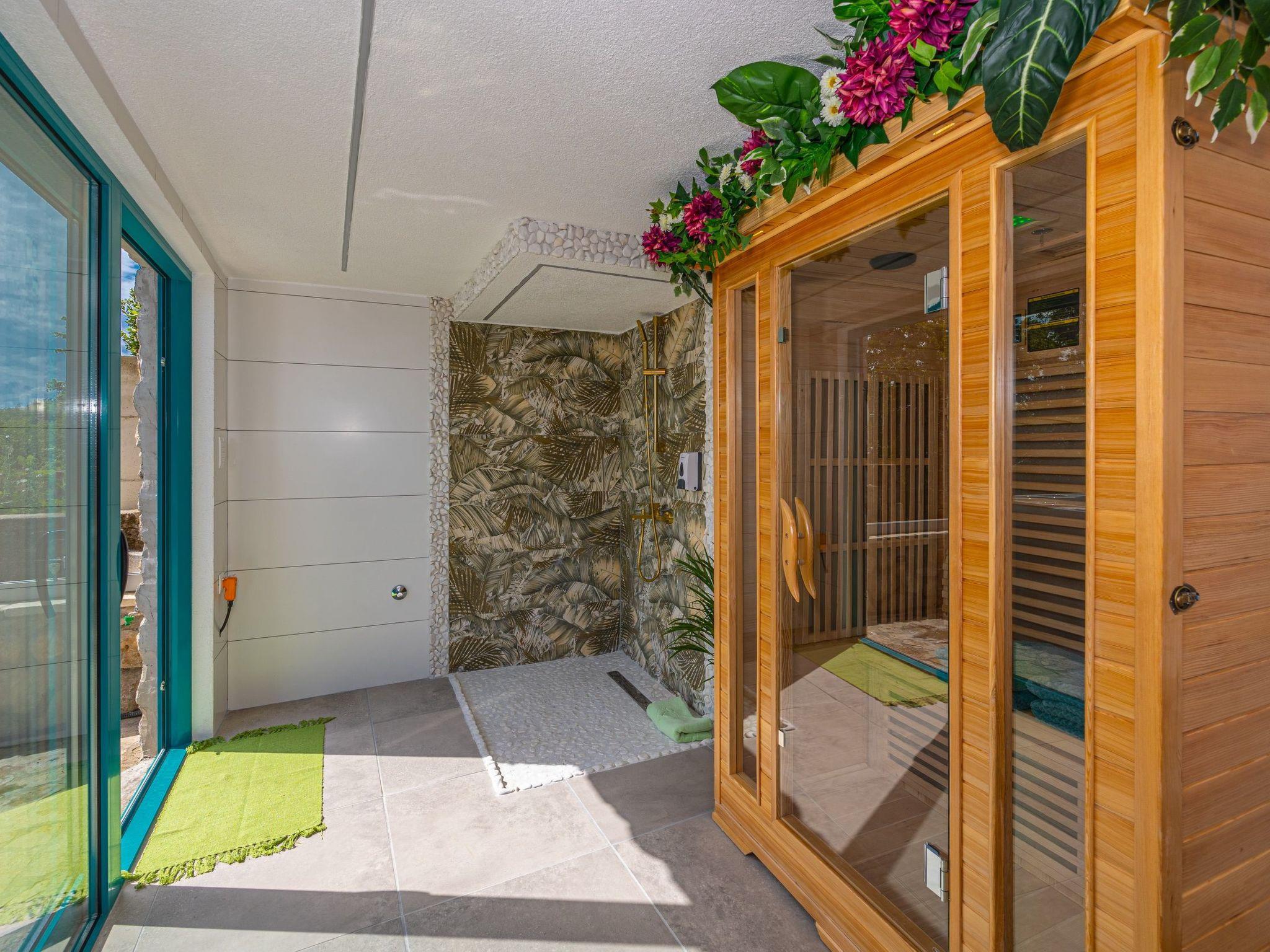 Inside, the villa impresses with comfortable furnishings that leave nothing to be desired. Three inviting bedrooms, each with its own bathroom, ensure privacy and comfort for all guests. A washing machine for exclusive use adds to the comfort. The living areas are equipped with air conditioning throughout, ensuring pleasant temperatures at any time of year. The technical equipment includes a dishwasher, an induction hob, a kettle and a coffee machine, which make everyday life easier and ensure culinary delights.