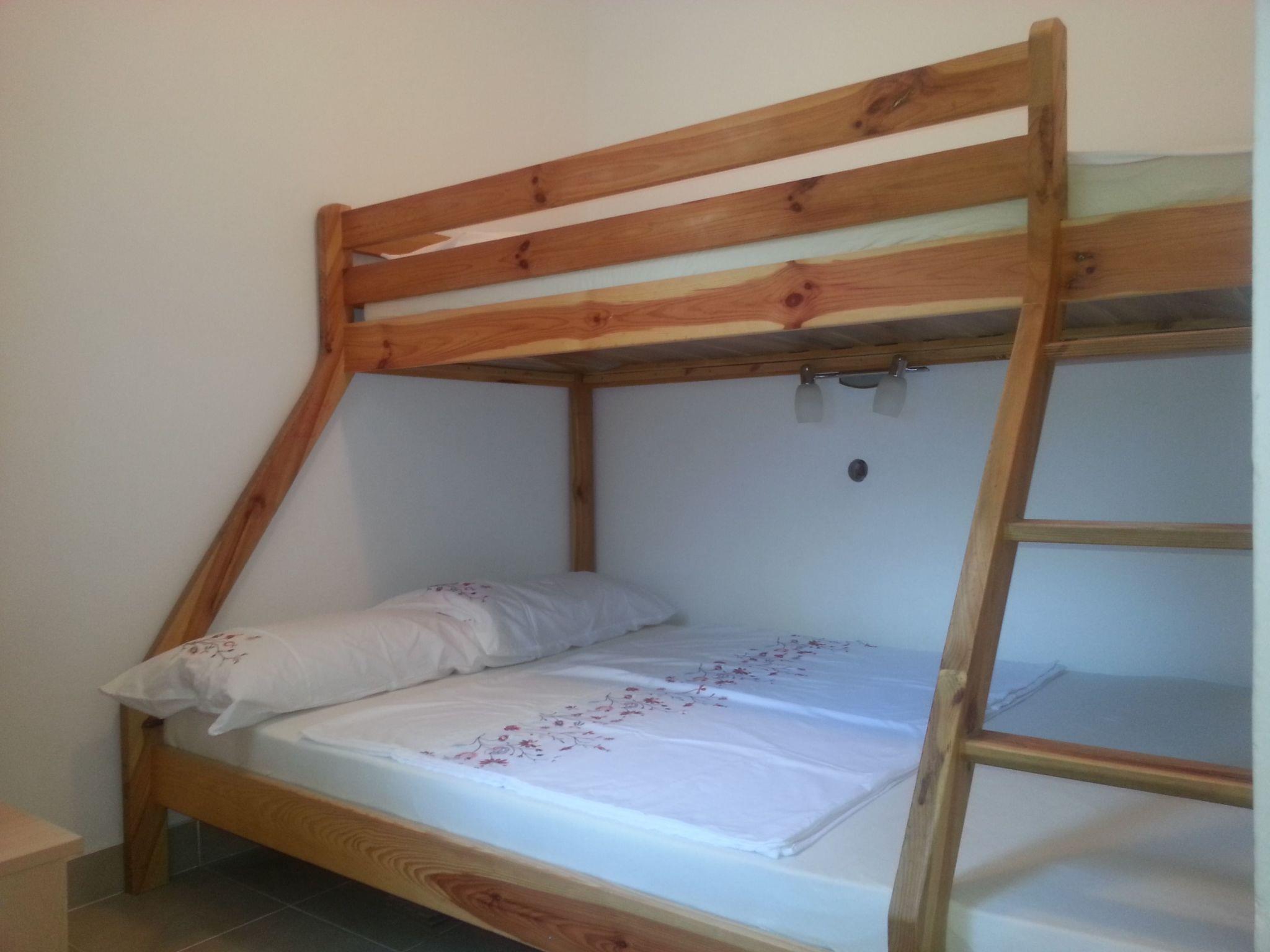 The accommodation provides around 32m² of living space, comprising a living room, a cooking space, two bedrooms and a bathroom. The living room has a sofa bed for two people, which can be used as an alternative to the other beds, as well as a flatscreen TV with a satellite receiver and a dining corner. The entrance area has a little cooking niche that is fully-equipped, including a two-ring ceramic hob. The first bedroom is furnished with a double bed 180cm wide, while the second has a bunk bed for three people (200 x 200cm below, 90 x 200cm above). The bathroom is fitted with a shower, washbasin and toilet, as well as a washing machine for your own exclusive use. The apartment does not have heating. A total of three fans cool the apartment in summer.