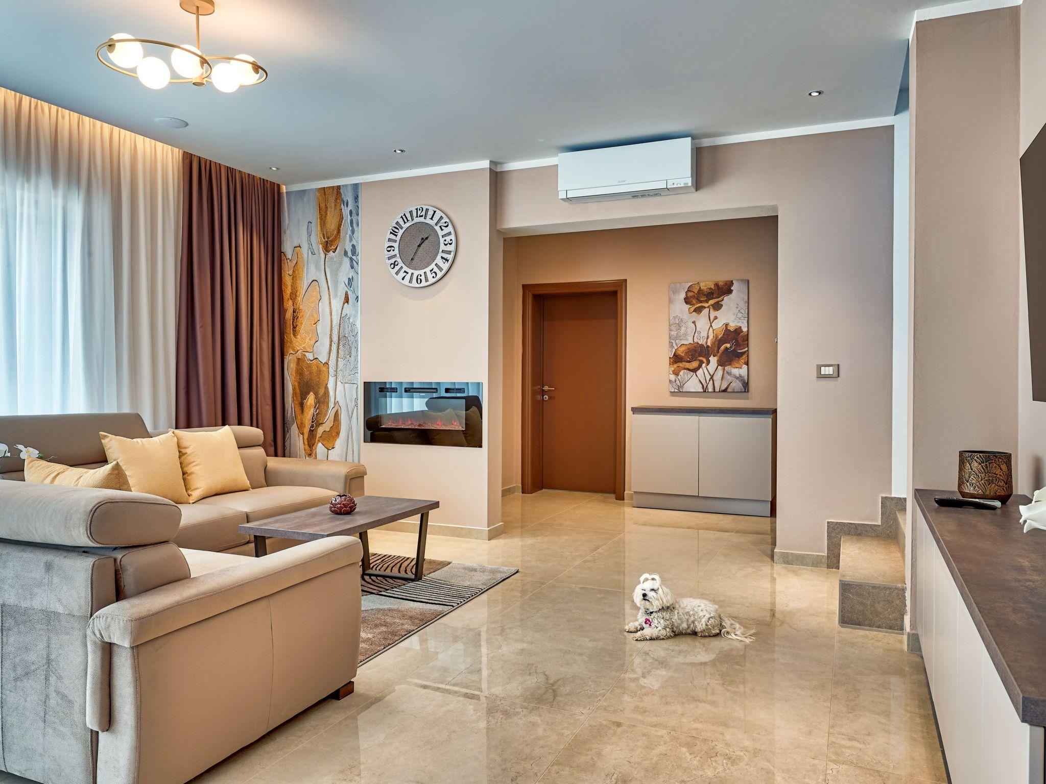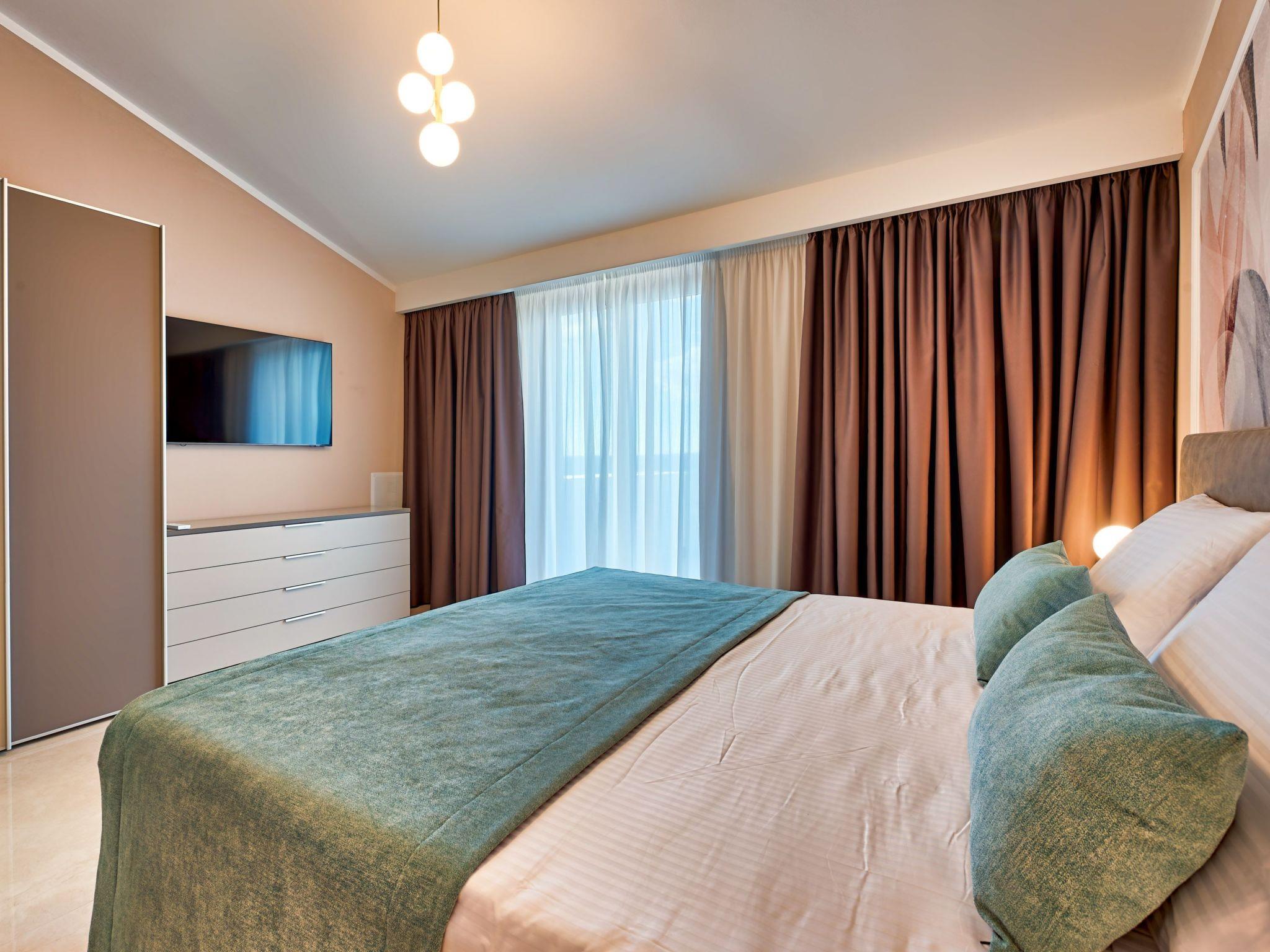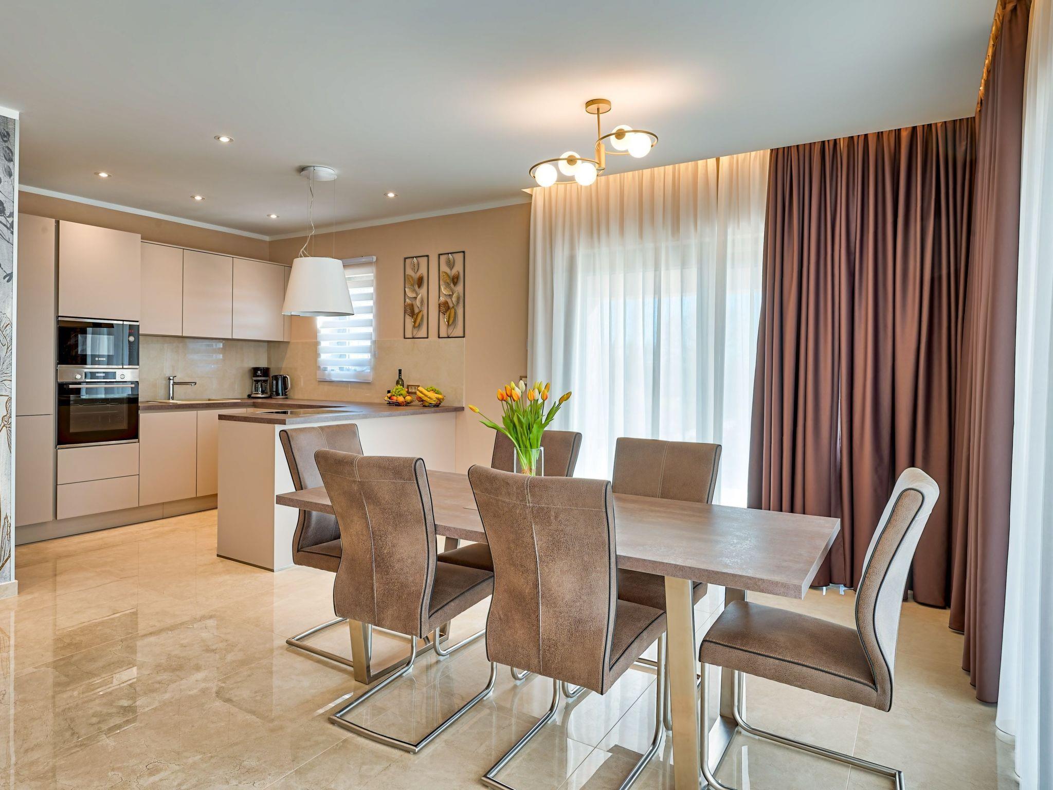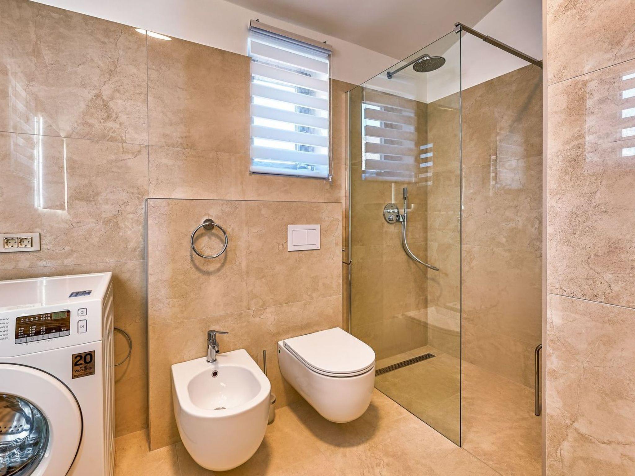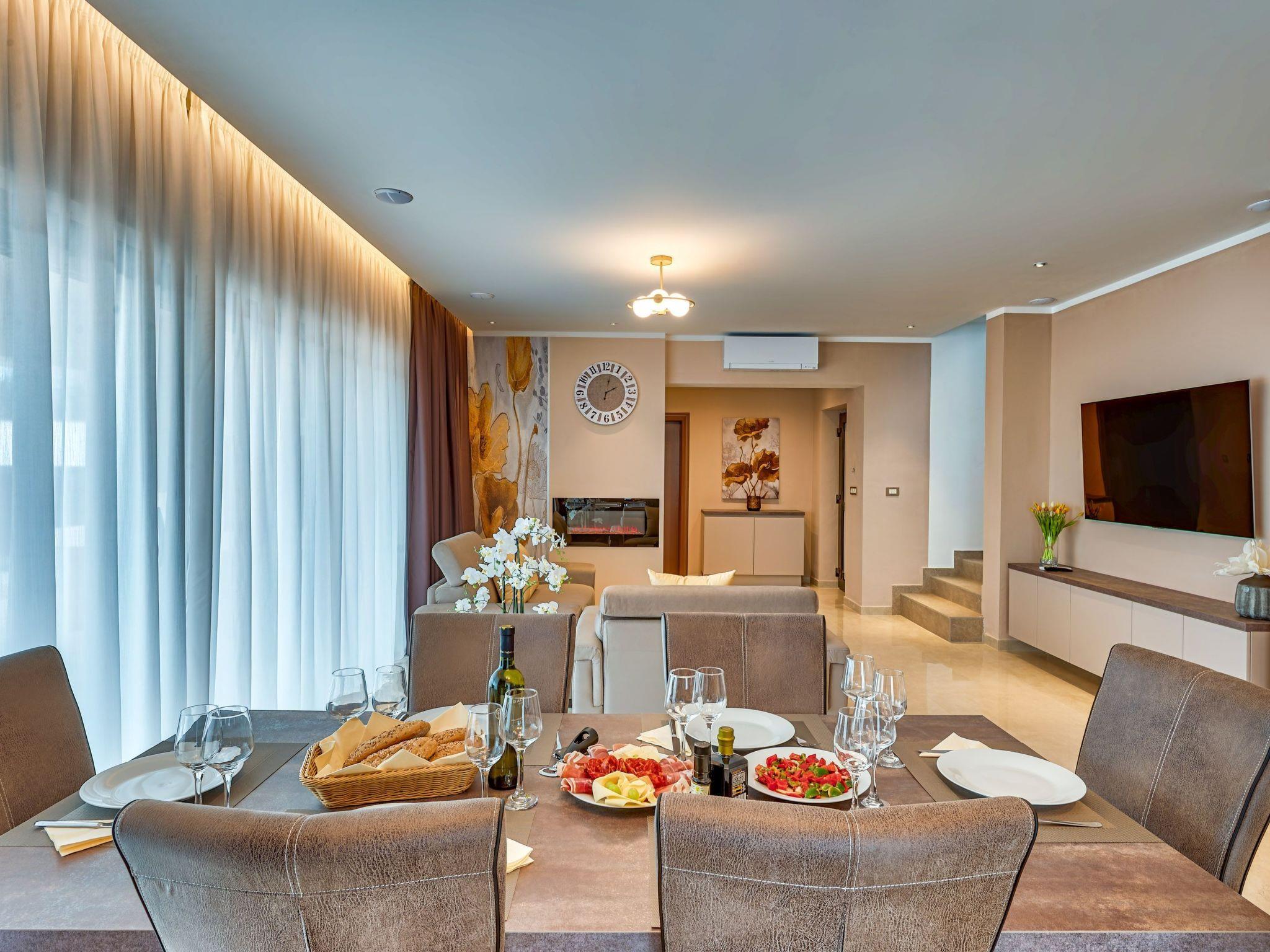 Villa Astrid has the capacity for 11 people: 2 double bedrooms on the 1st floor, 1 double room on the ground floor, foldable couch and armchair in the living room and additional double bedroom in a separate unit. All bedrooms are comfortable and modern, equipped with king size beds (200 x 210 cm), air conditionings and large screen TVs. Rooms on the first floor share a joint spaceous terrace, from which a beautiful view to the whole countryside can be enjoyed.