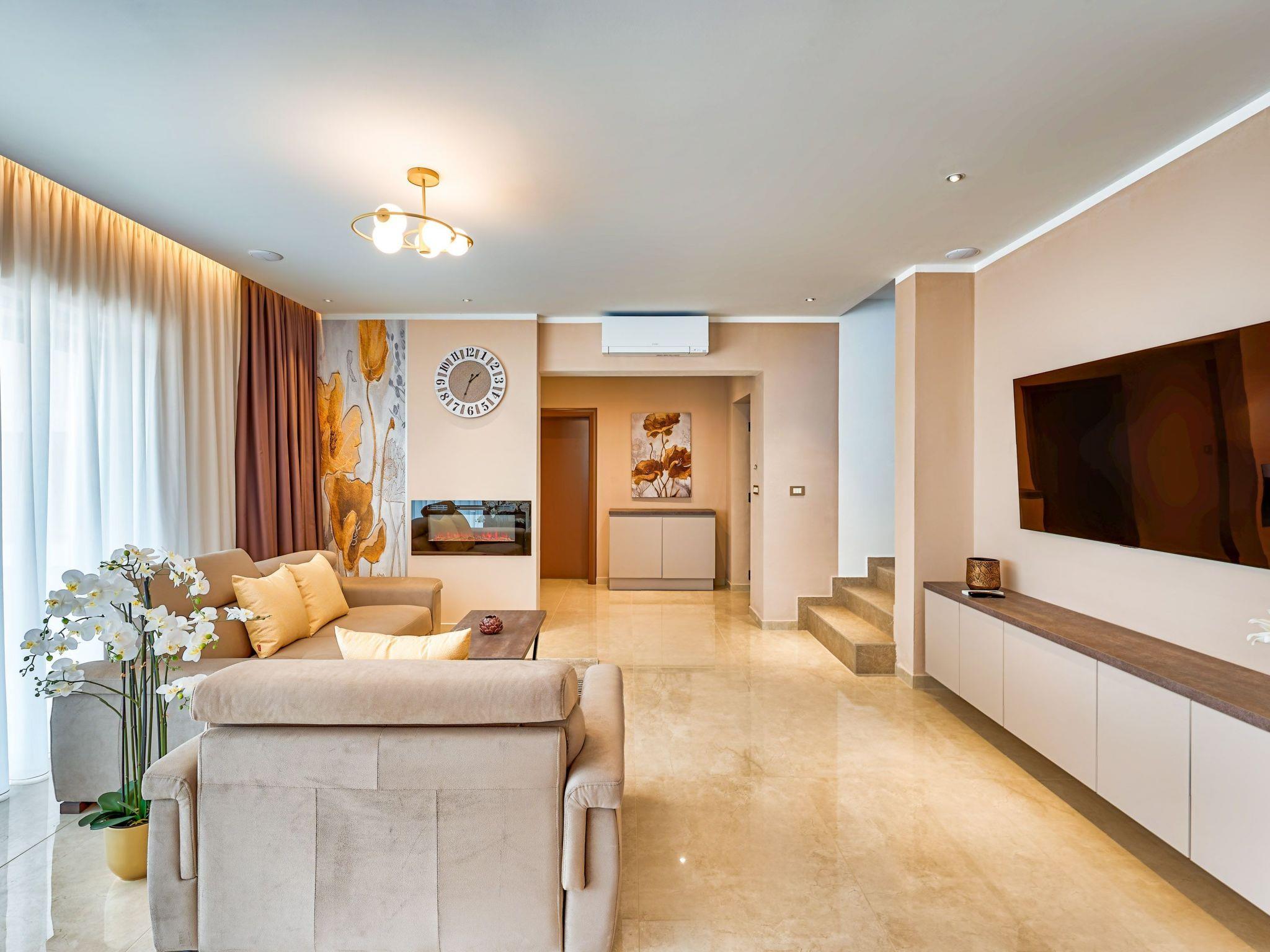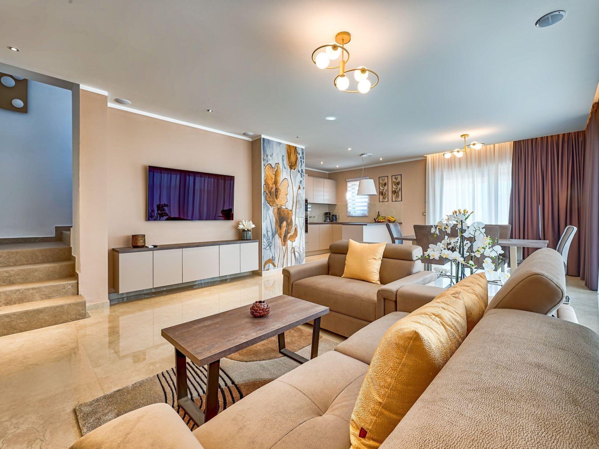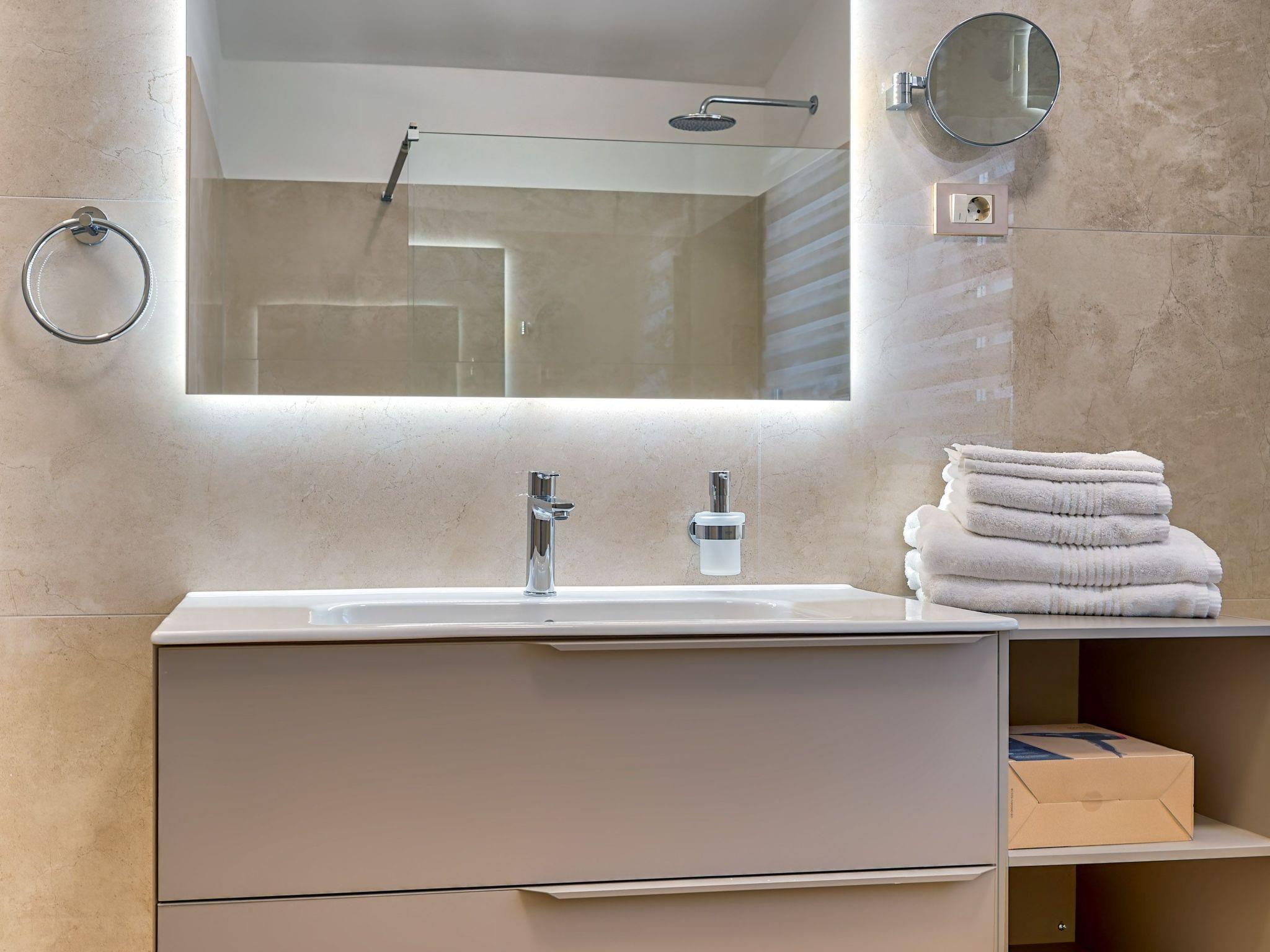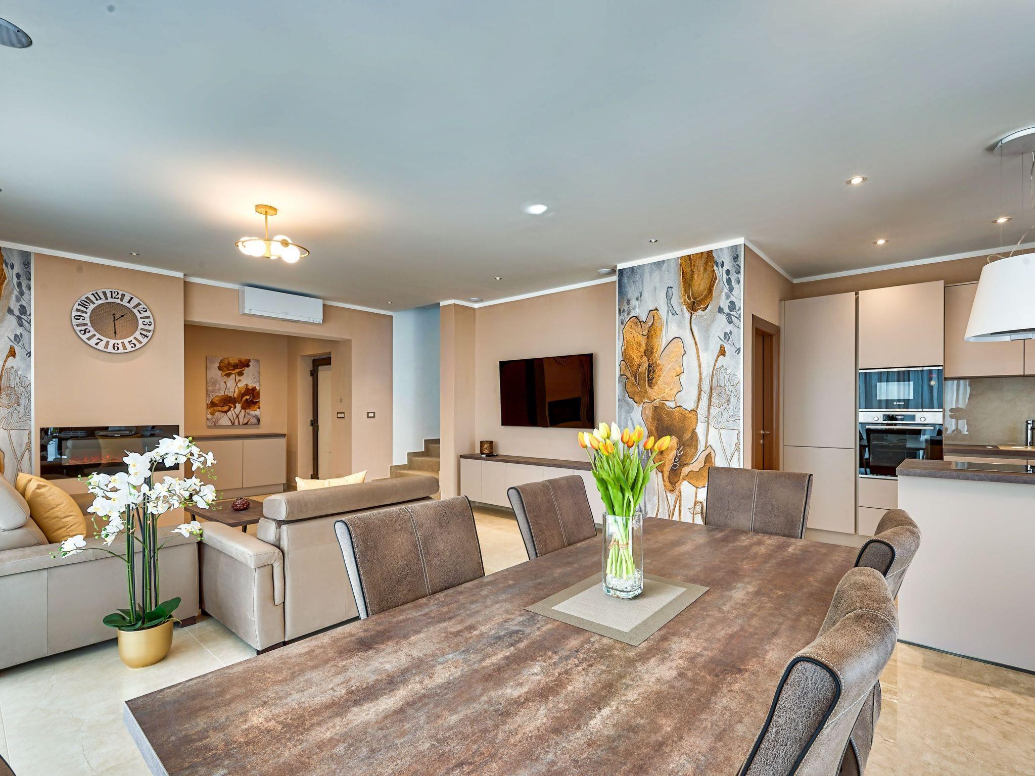 On the ground floor there is a big living room with additional TV, a dining room, a fully equipped kitchen and a guest restroom, all air conditioned.