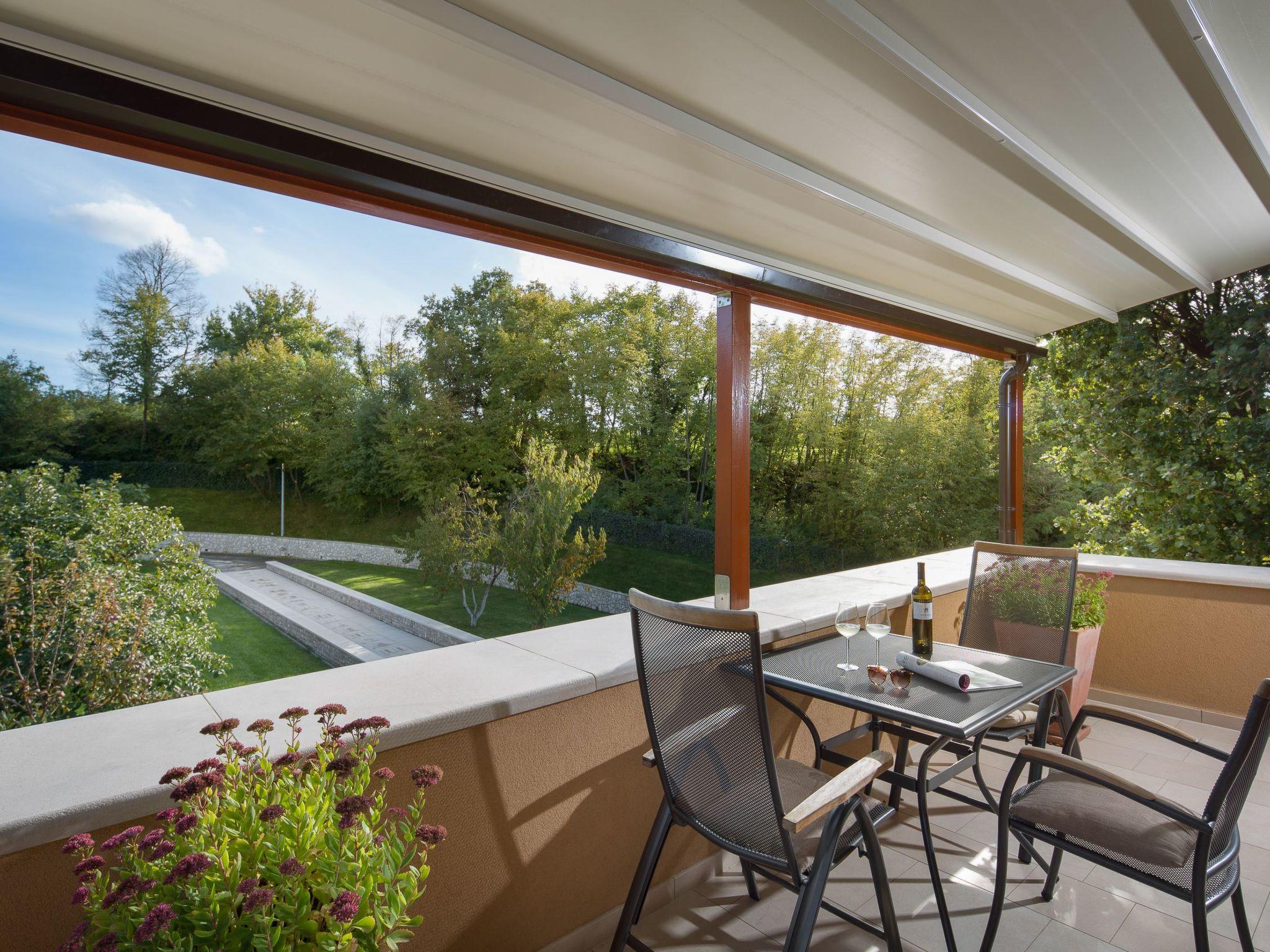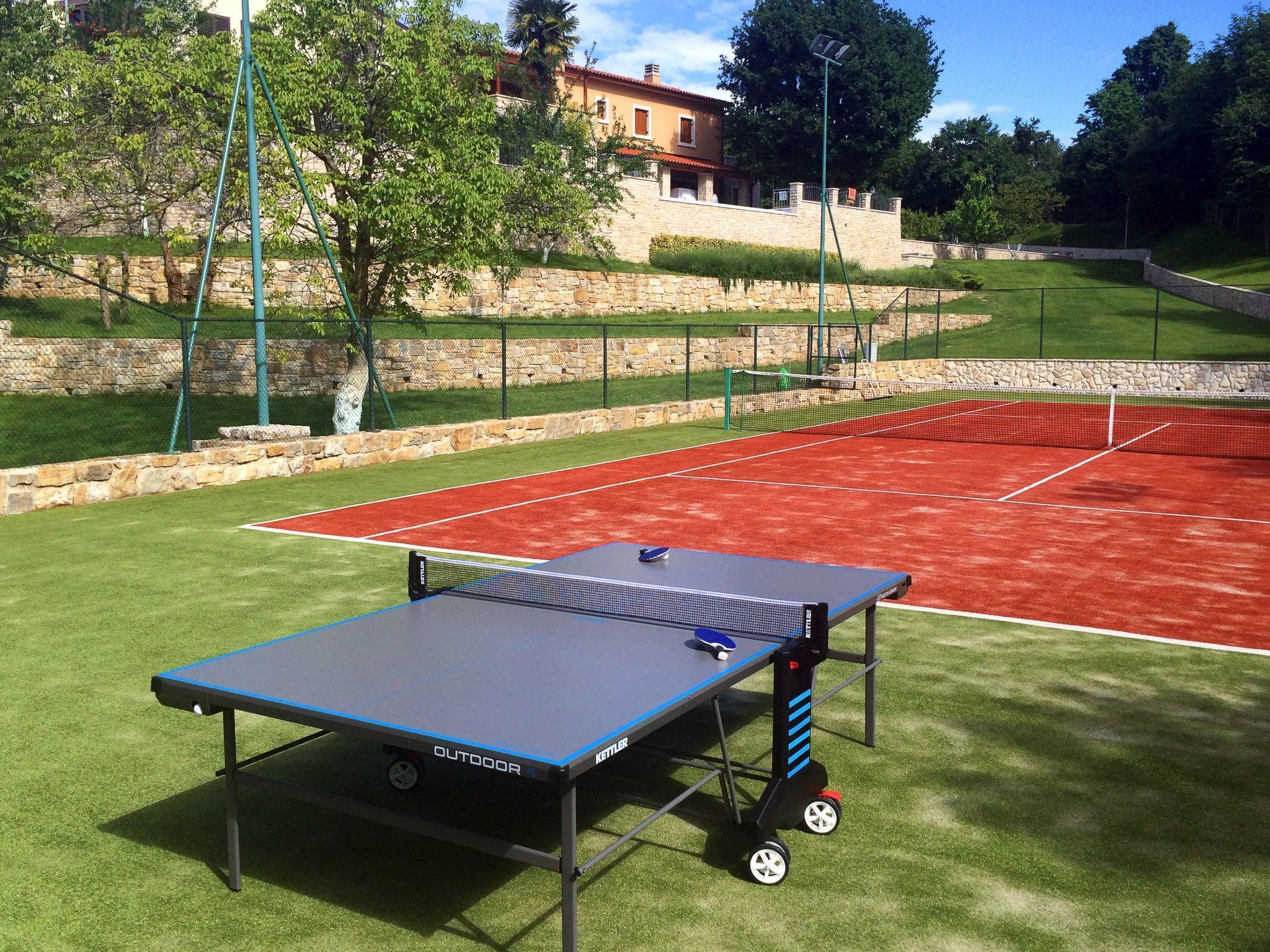 The balconies in front of the bedrooms on the upper floor afford a view over the beautiful hilly landscape. Down in the fenced, private garden a pool awaits you, surrounded by plenty of sun loungers and parasols and with an outdoor shower. The traditional stone grill on the sunny terrace invites you to enjoy leisurely meals outdoors under a blue sky. Occasionally a curious hen might pay you a visit and further towards the rear of the garden there are also sheep and rabbits. You can help yourselves from the charmingly planted vegetable and herb garden during your stay. The pool and your private tennis court and golf course can be illuminated, so you can turn night into day. The table tennis table provides fun not only for children. The roofed area right in front of the villa provides secure parking spaces for four cars.