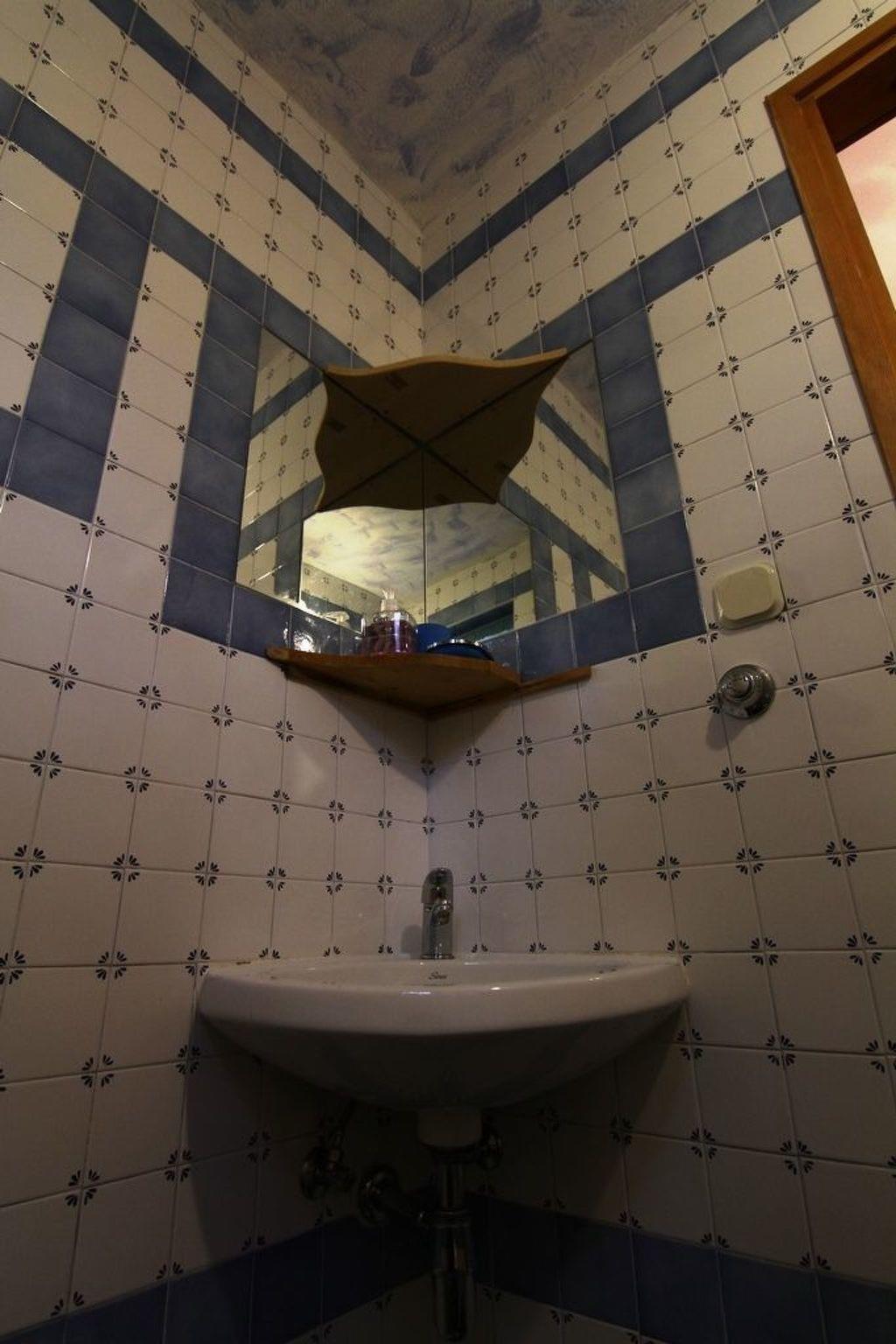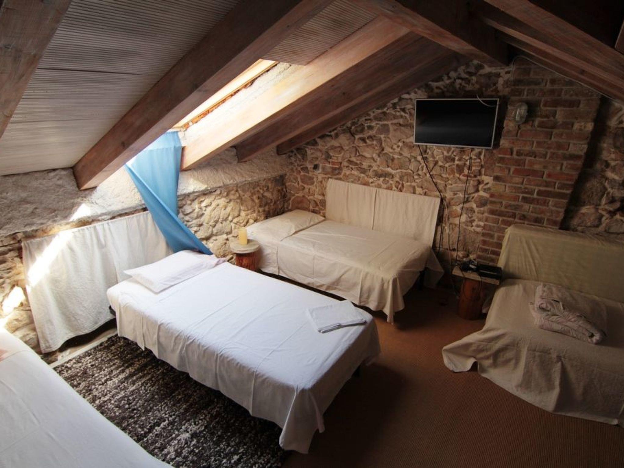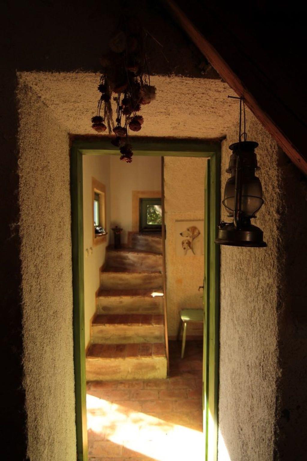 The living space of 80m² is spread over two floors and includes a living and dining space with an integrated open kitchen, two bedrooms, three bathrooms and a storage room with a washing machine. The living room on the ground floor provides a comfortable sofa, a TV and a dining table with four chairs. The large stone fireplace stove built into the wall enhances the rustic country house atmosphere and provides homely warmth on cooler evenings. The kitchen next to it is equipped with a hob, oven, fridge with freezer compartment, kettle, toaster and coffee machine. There is a convenient bathroom on the ground floor with a shower, a washbasin with a wall mirror, a hairdryer and a toilet. Wide, rustic, wooden stairs lead to the upper floor with the two bedrooms and the two further bathrooms. The first bedroom is furnished with a double bed (200 x 200cm), the second with four single beds (90 x 200cm), and this room also benefits from a wall-mounted flatscreen TV. The two bathrooms are fitted the same as the one on the ground floor. Plenty of bed linen and towels are provided and the reliable wireless Internet connection can be used free of charge.