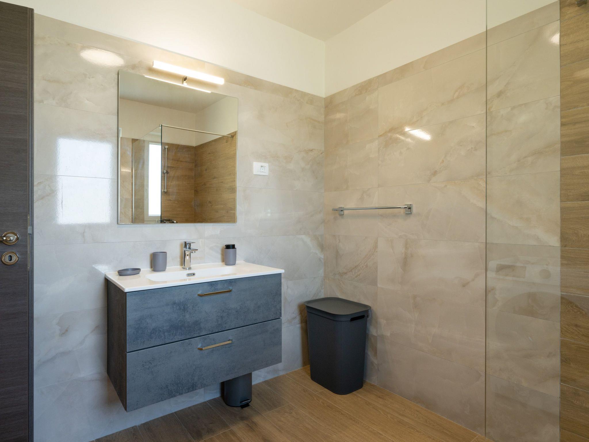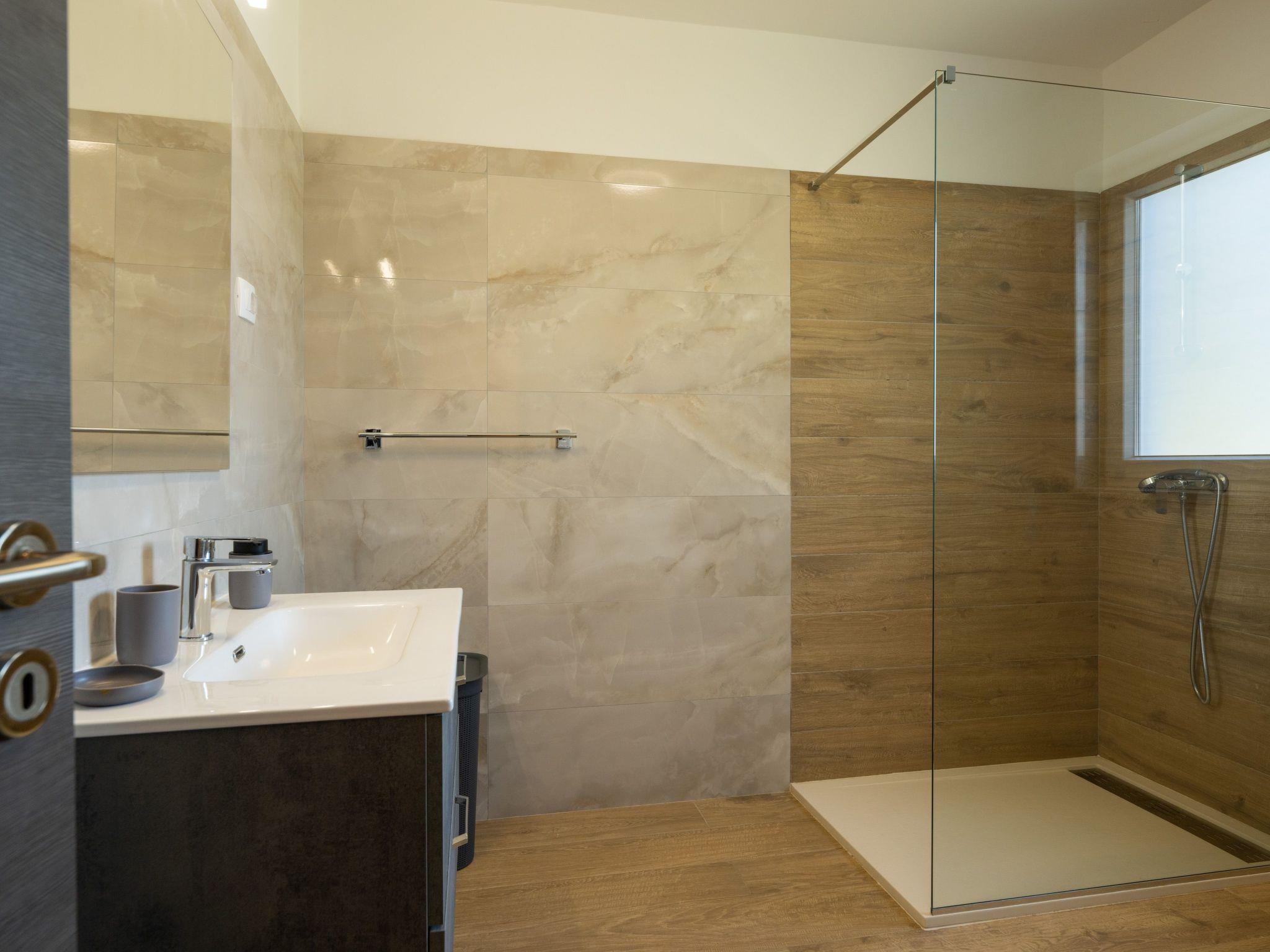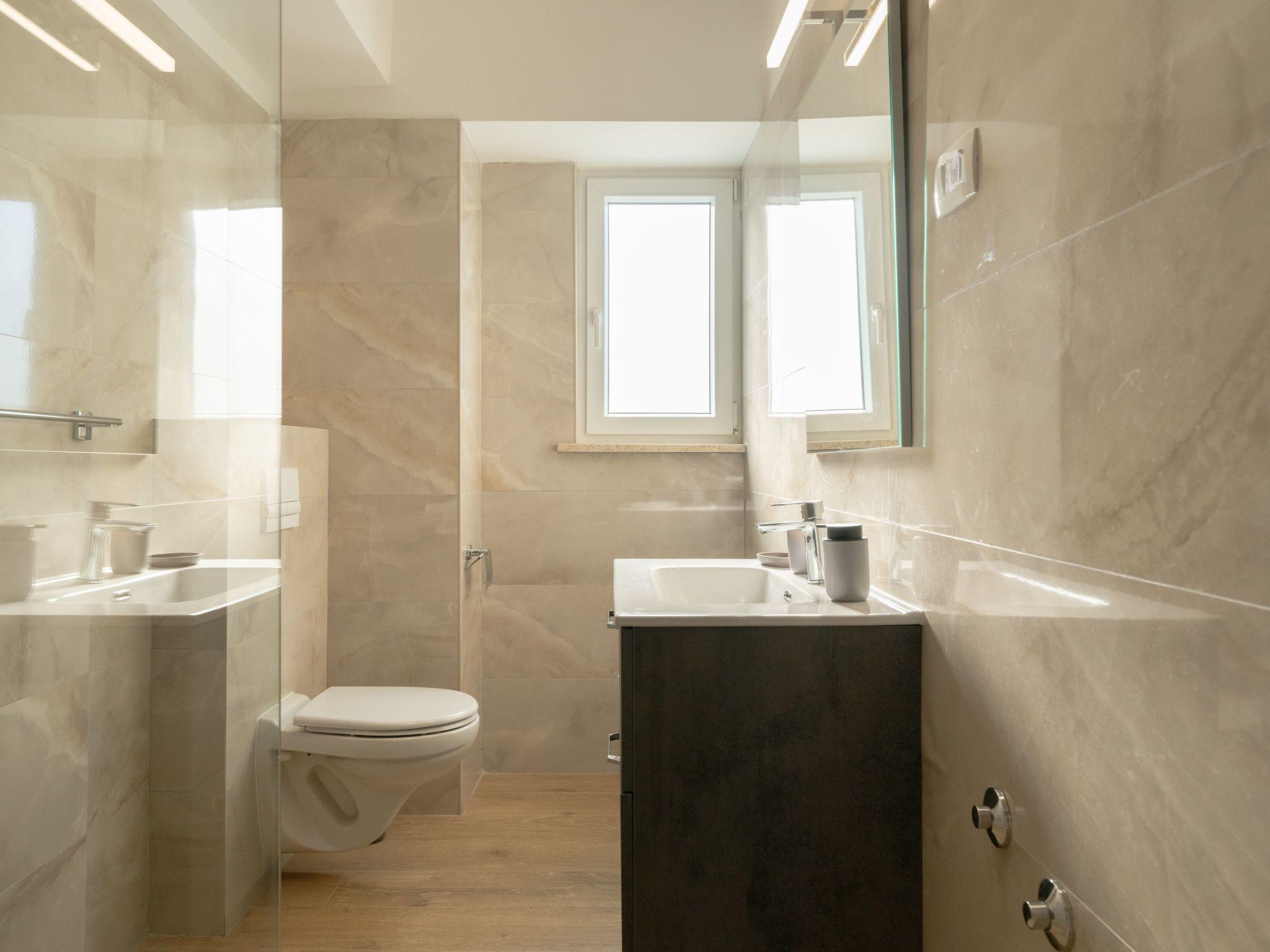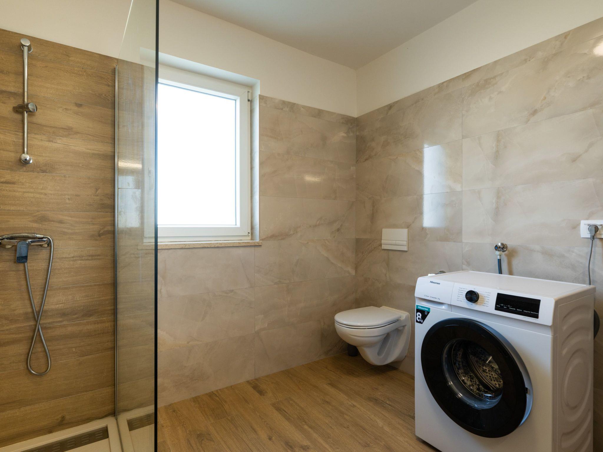 - bathroom with shower, toilette, washbasin, washing machine, hairdryer