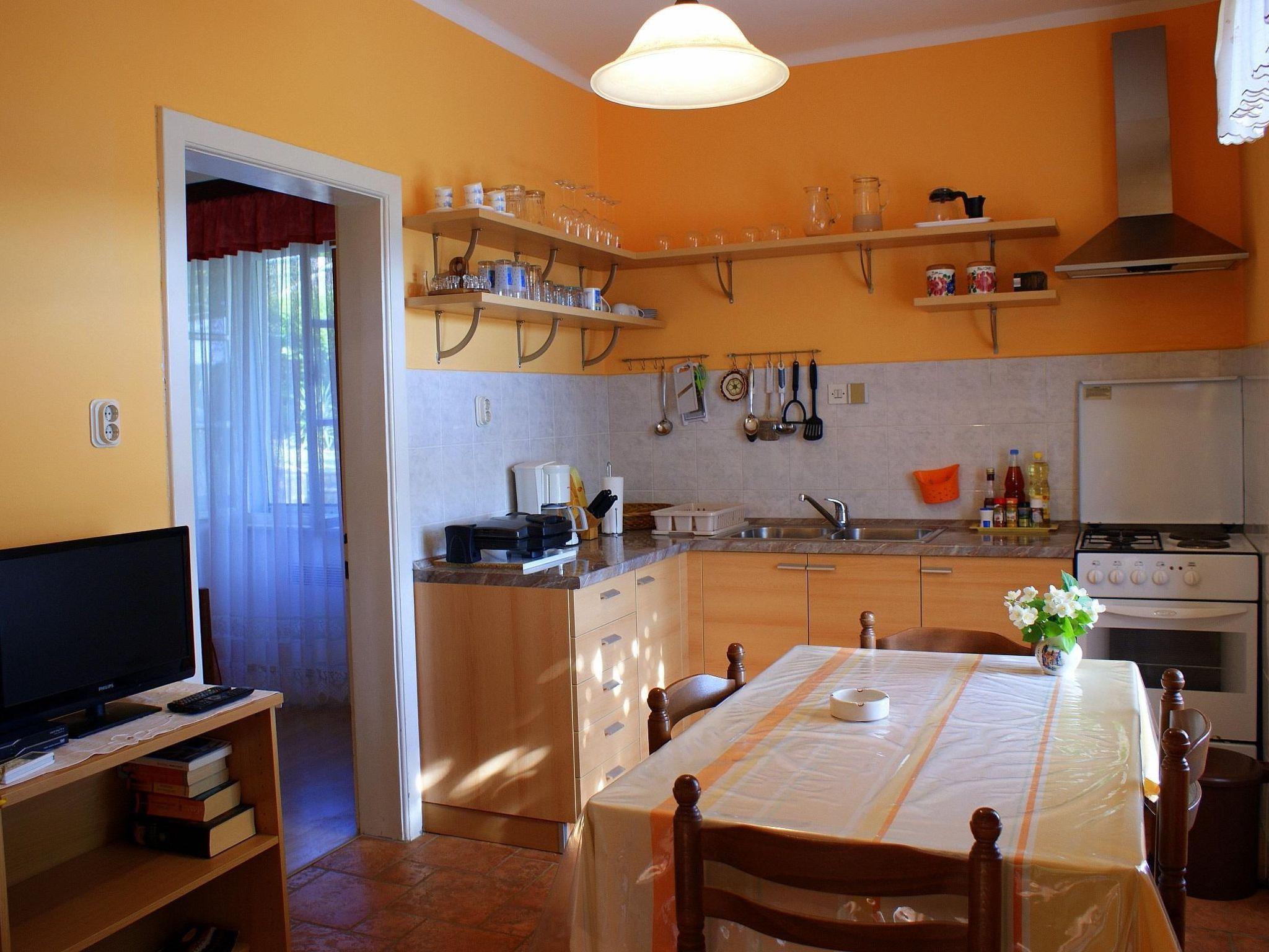 The ground-level holiday house from the year 1951 was completely renovated in the year 2000 and is comfortably furnished and well-equipped for a pleasant stay. It has a living and dining room with an integrated, open kitchen, two bedrooms and a daylight bathroom. The air-conditioned (cool/warm) living room has a modern flatscreen TV with satellite channels and a dining table with four chairs. Right next to it there is the fully-equipped kitchen with a four-zone gas stove with an elegant stainless steel extractor fan, an electric oven, fridge with freezer compartment, toaster, kettle and coffee machine. The two bedrooms each have a double bed (180 x 200cm), bedside tables with reading lamps and cupboards with ample storage space for your clothing and luggage. An additional bed of 70 x 180cm can be provided for a child. The bathroom has a bath with a shower attachment, a washbasin with a wall mirror, a hairdryer, a washing machine and a toilet. Plenty of bed linen and towels are provided.
