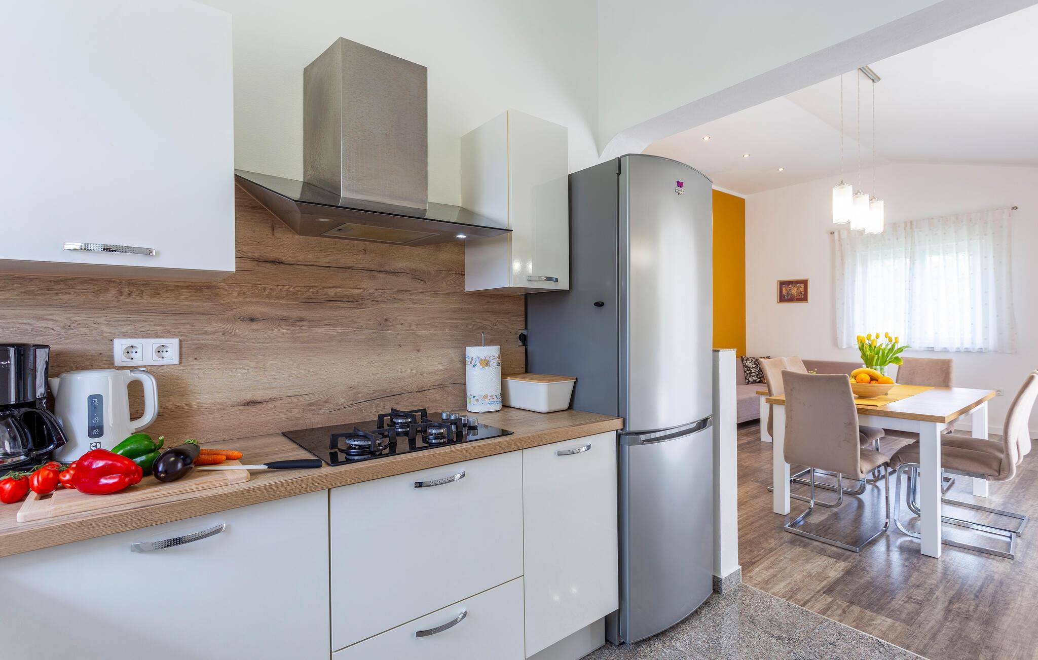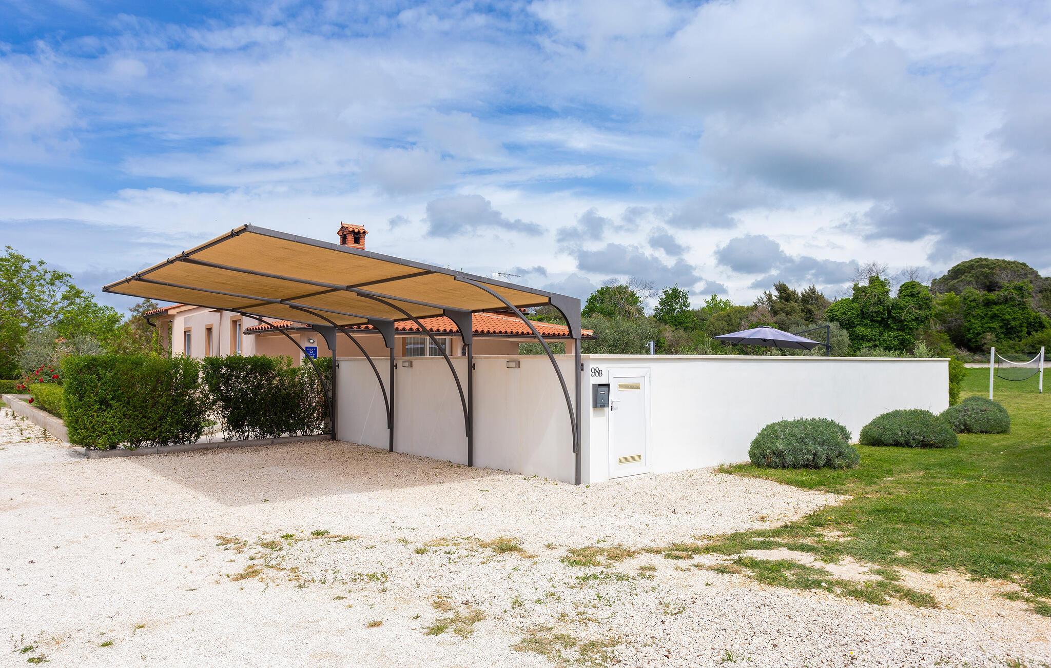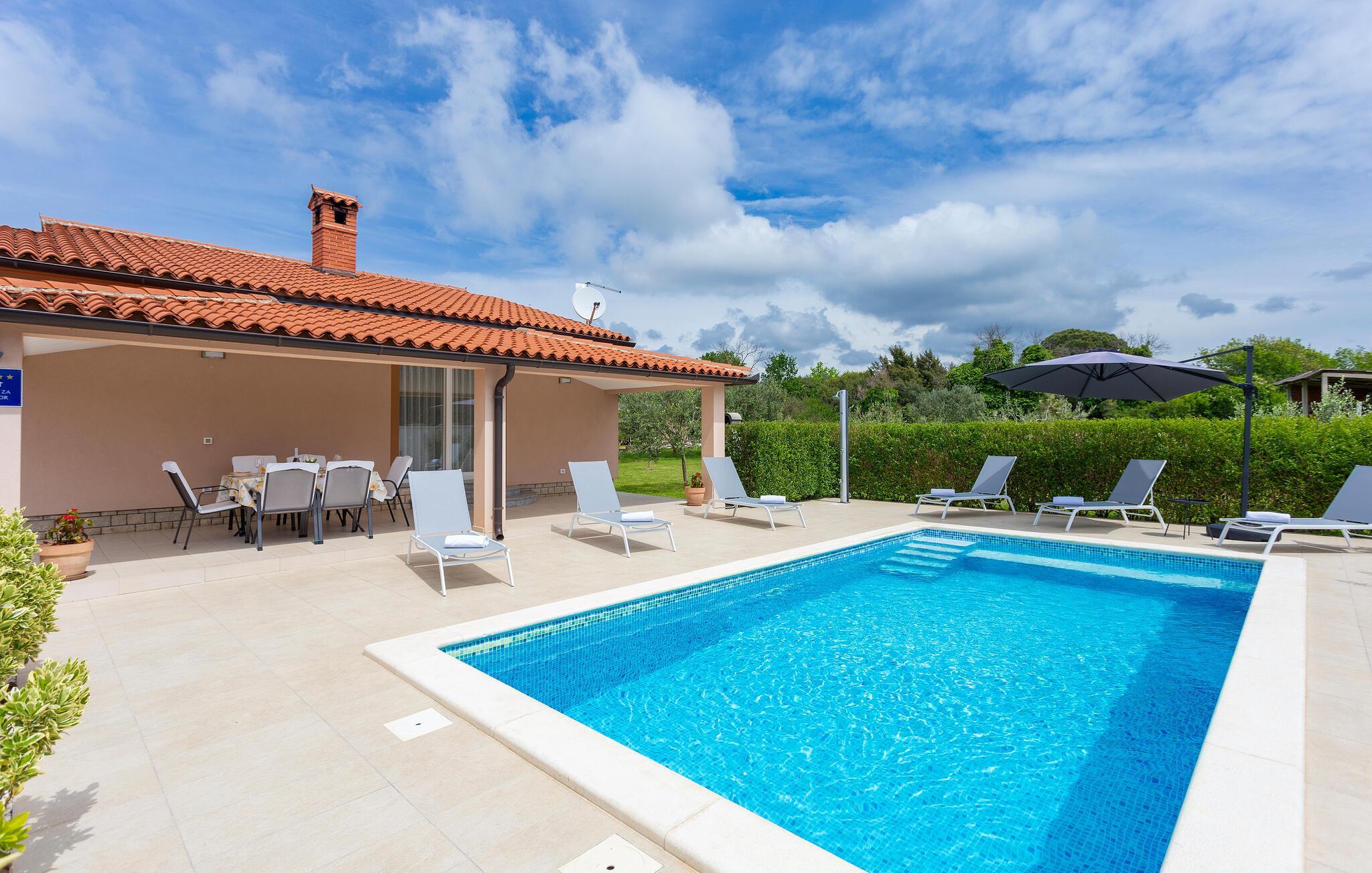 Tilbring ferien i denne vakre feriehusbungalowen omgitt av grøntområder. Det stilfullt møblerte oppholdsrommet har klimaanlegg, kjøkkenet er fullt utstyrt og med tre soverom har det den nødvendige komforten for seks personer. Opplev sommerfølelsen på den store overbygde terrassen med grill og nyt de lune sommerkveldene. Besøk de vakre badestrendene i nærheten med krystallklart hav. Ta båtturer til nasjonalparken på Brijuni-øyene, som vil fortrylle deg med sin rike flora. Tilgang til huset (ca. 100 m) er ikke asfaltert.