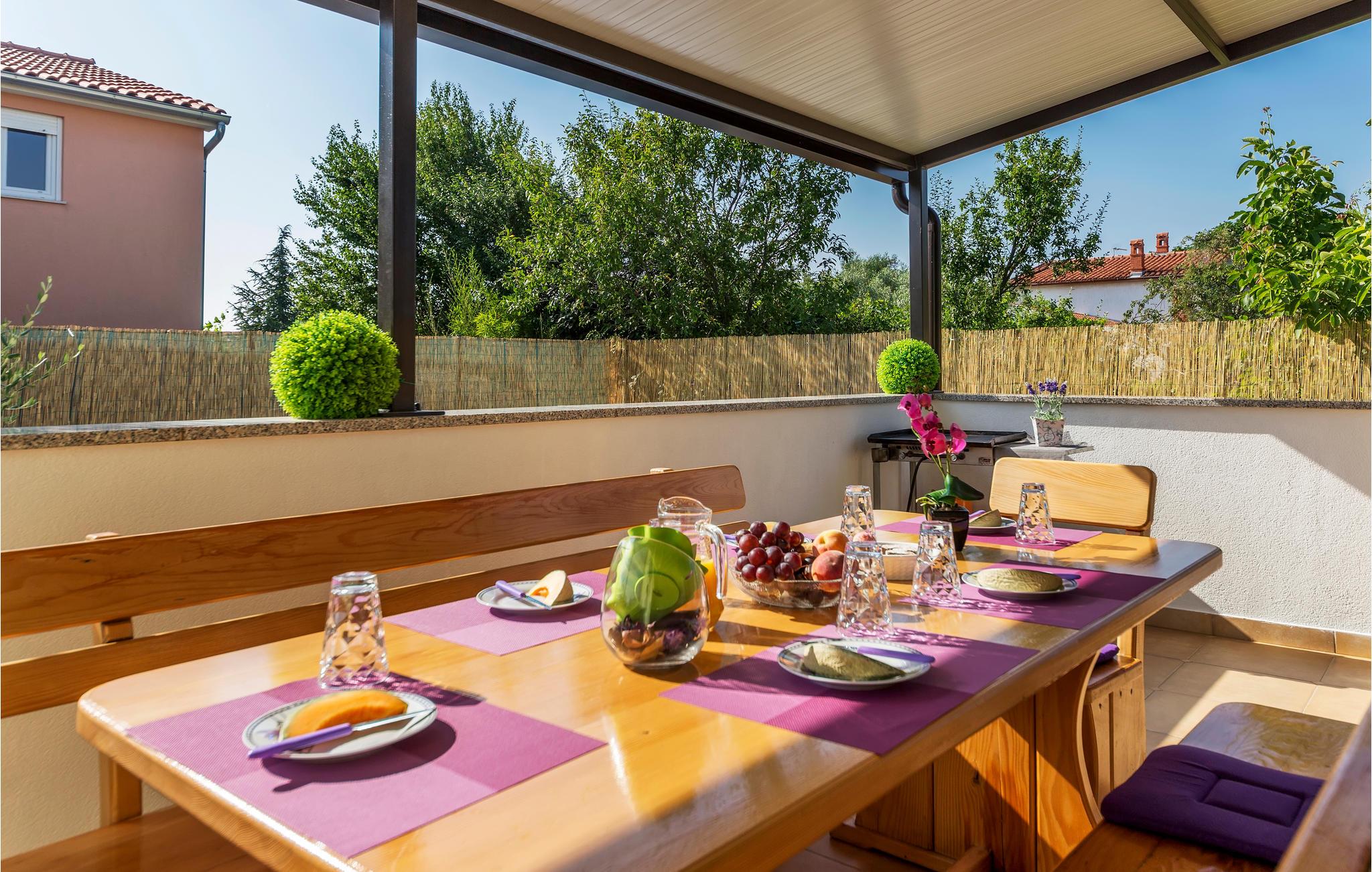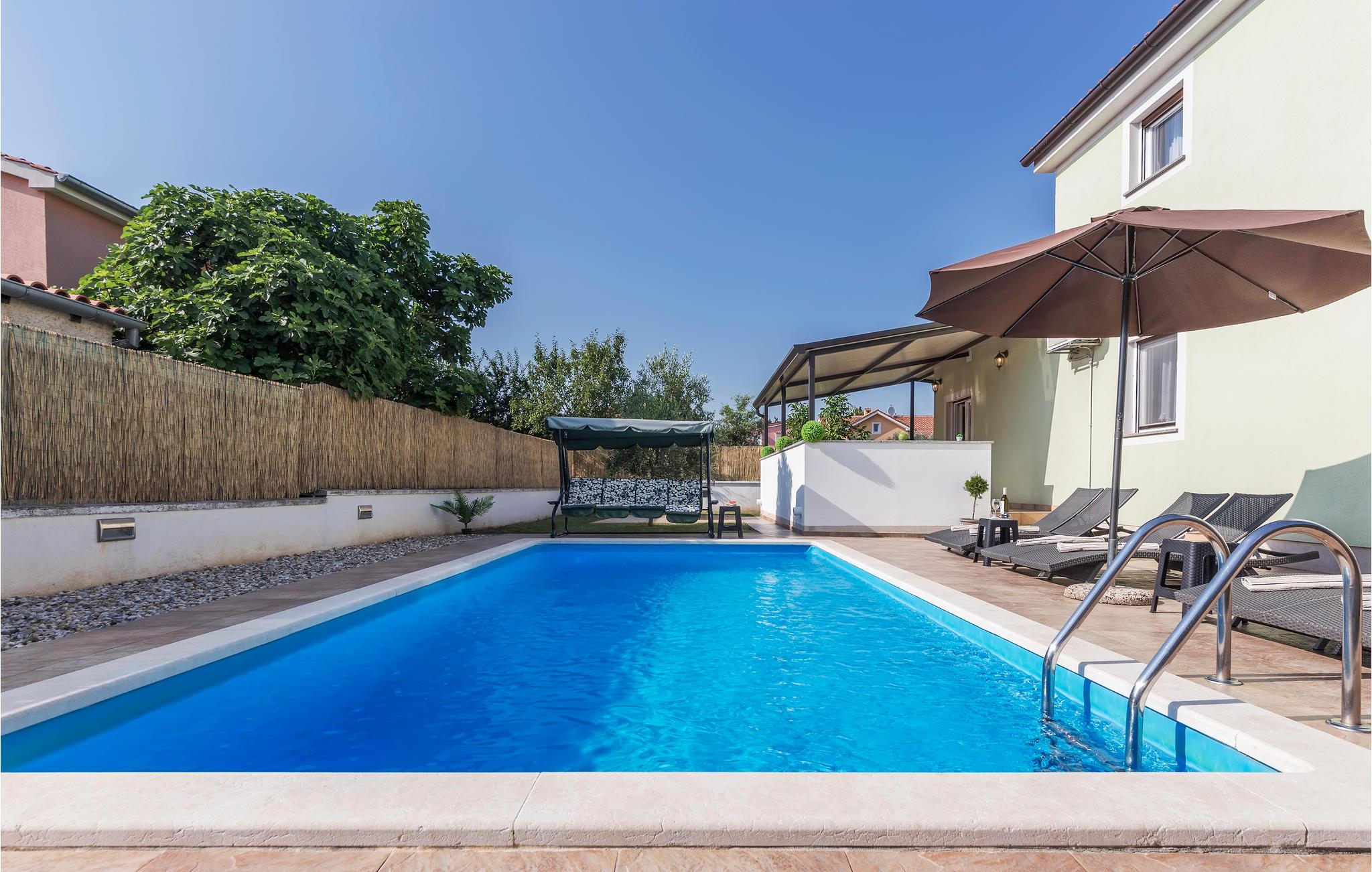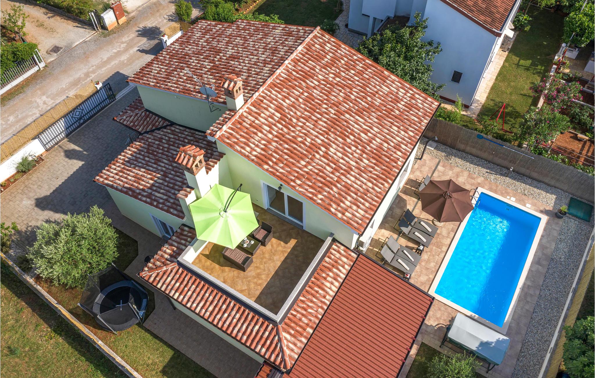 I den lille og fredelige landsbyen Valbandon, omgitt av familiehus, finner du dette feriehuset med basseng. Den består av to boenheter forbundet med innvendige trapper, noe som gjør den ideell for to vennlige familier eller vennegrupper. I første etasje er det kjøkken og spisestue, stue og to soverom. I 1. etasje er det ytterligere to soverom og en liten kjøkken-stue. Eiendommen er helt inngjerdet. Hver etasje har en terrasse eller balkong hvor du kan slappe av med en kopp kaffe om morgenen. På varme sommerdager kan du forfriske deg i bassenget, sole deg og bla gjennom ferielesningen din.