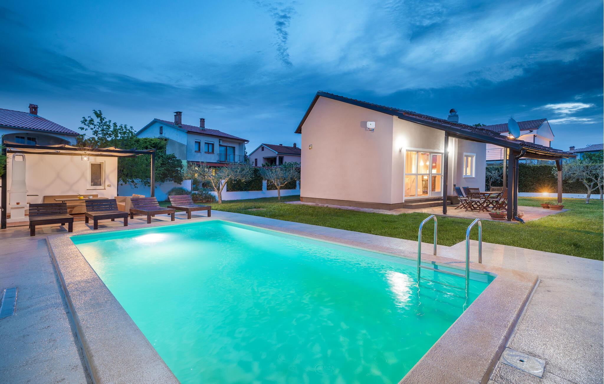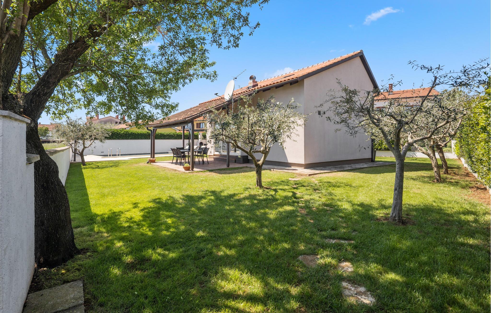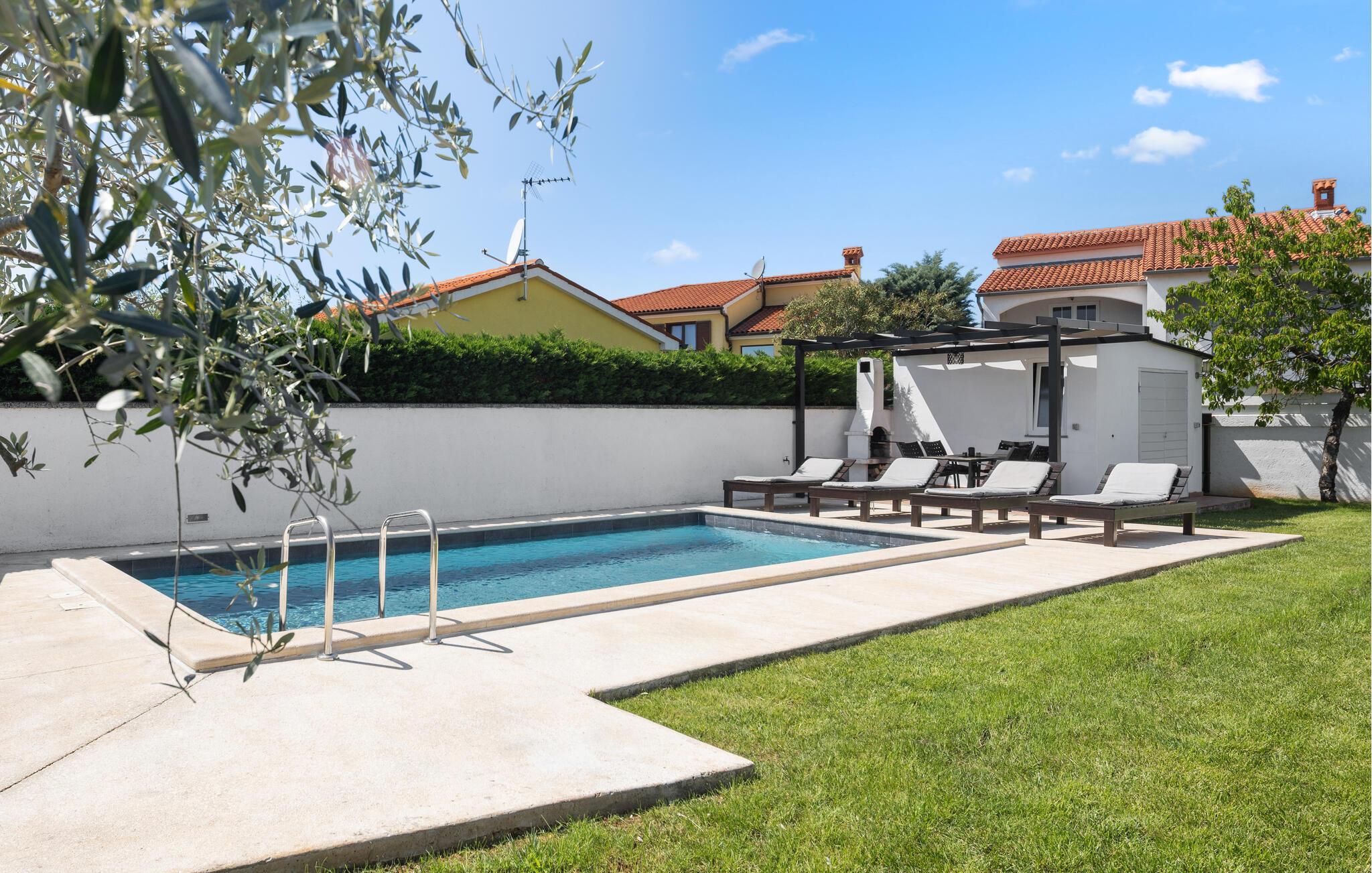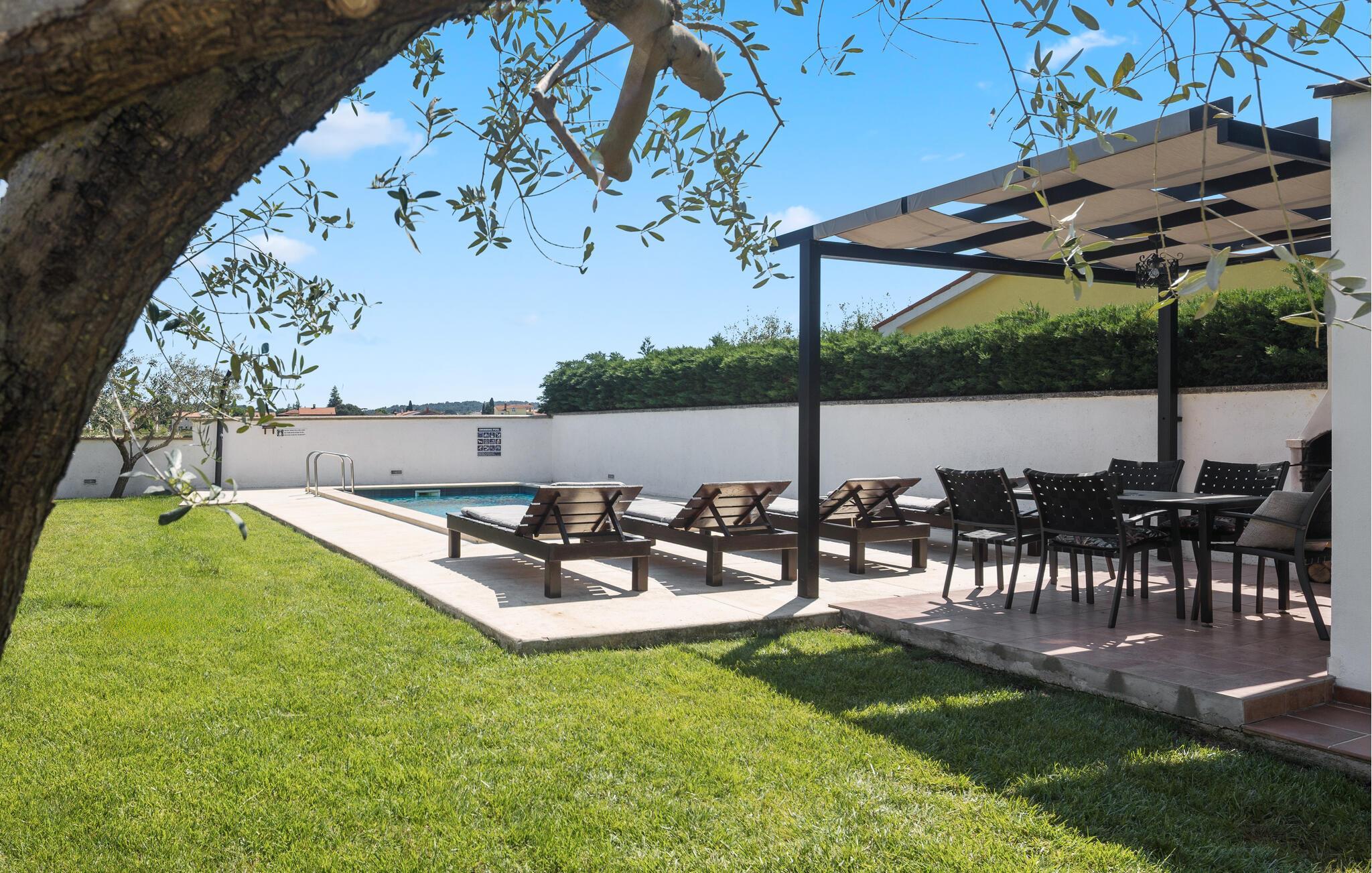Dette feriehuset med basseng ligger i Valbandon, i nærheten av Faana. Det er vakkert og harmonisk innredet og tilbyr deg all den komforten du trenger for en behagelig ferie. I øverste etasje, med en minimum takhøyde på ca. 140 cm, er det to soverom, hvorav det ene er et gjennomgangsrom, mens det i første etasje er en stue med kjøkken og et bad. Fra stuen har du tilgang til en overbygd terrasse hvor du kan spise ute med familien og slappe av med et godt glass vin om kvelden. I mellomtiden kan barna leke uforstyrret i den inngjerdede hagen. Verten tilbyr utflukter med egen båt til de nærliggende øyene mot en ekstra kostnad. Det er to parkeringsplasser på naboeiendommen. Besøk den sjarmerende lille byen Faana, som er kjent for sin vakre strandpromenade med barer og restauranter samt interessante arrangementer som finner sted i sommermånedene.