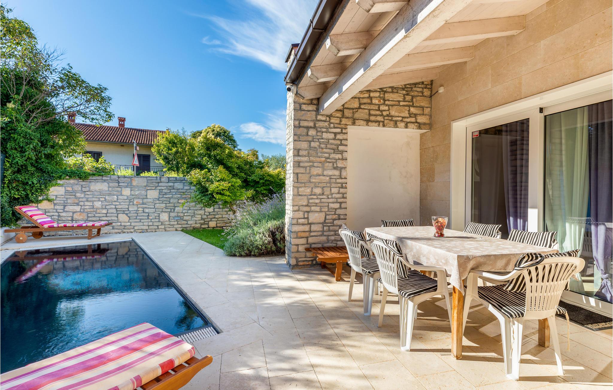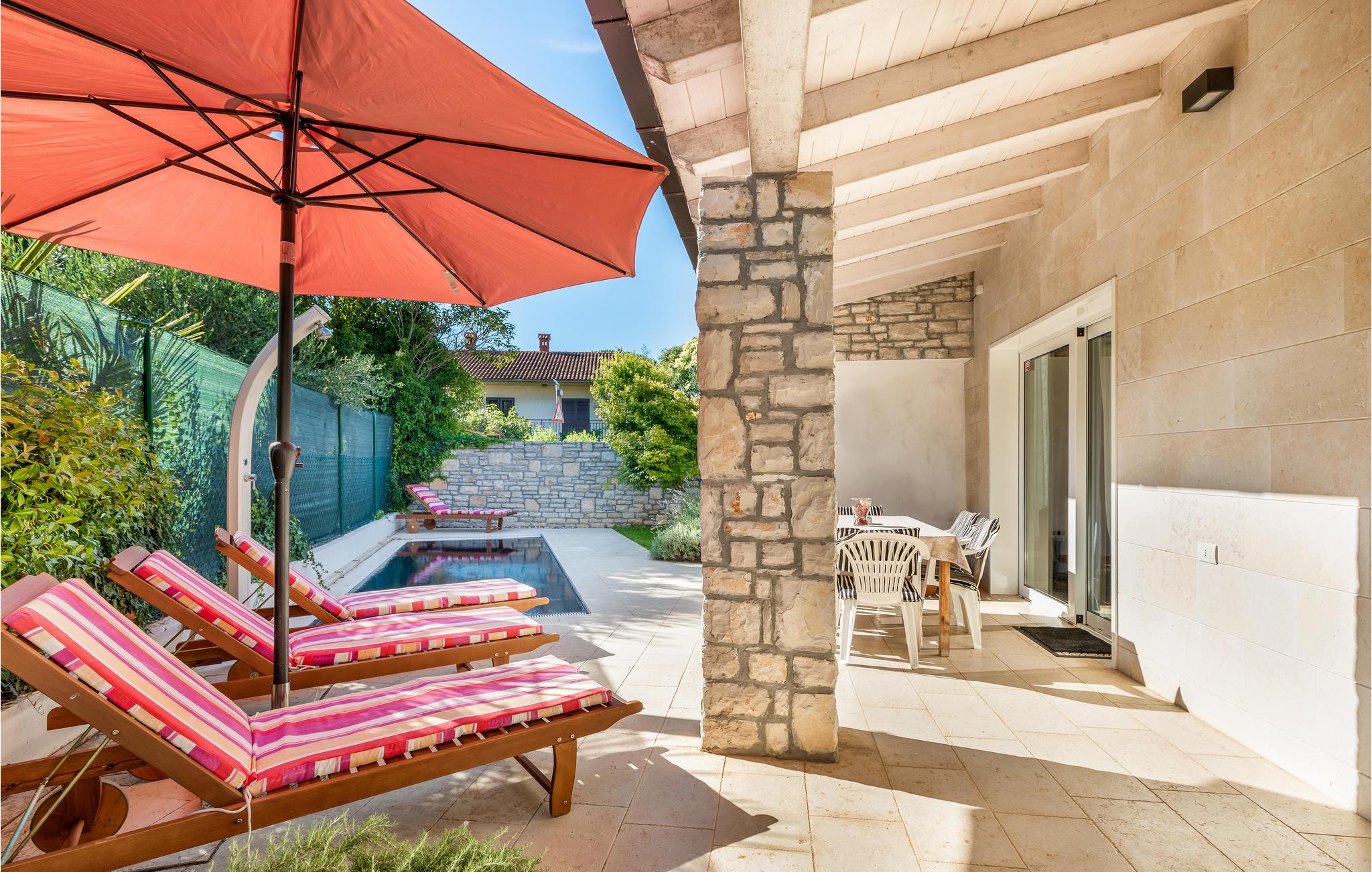 Et vakkert steinhus med basseng og hage venter på deg i det rolige nabolaget Valbandon, i nærheten av den pittoreske byen Faana og nasjonalparken på Brijuni-øyene. Dette er en flott innredet tomannsbolig hvor det er brukt klassiske materialer som stein og tre. Feriehuset er moderne utstyrt og innredet med stor oppmerksomhet på detaljer, og tilbyr gjestene hygge og komfort. Boarealet består av første etasje med stue, kjøkken og spiseplass i åpen planløsning. Fra stuen kommer man opp i andre etasje, hvor det er et soverom og et bad. Det andre soverommet med eget bad ligger i kjelleren. Den overbygde terrassen med grill er ideell for sosialt samvær, mens bassenget sørger for forfriskninger på varme sommerdager.