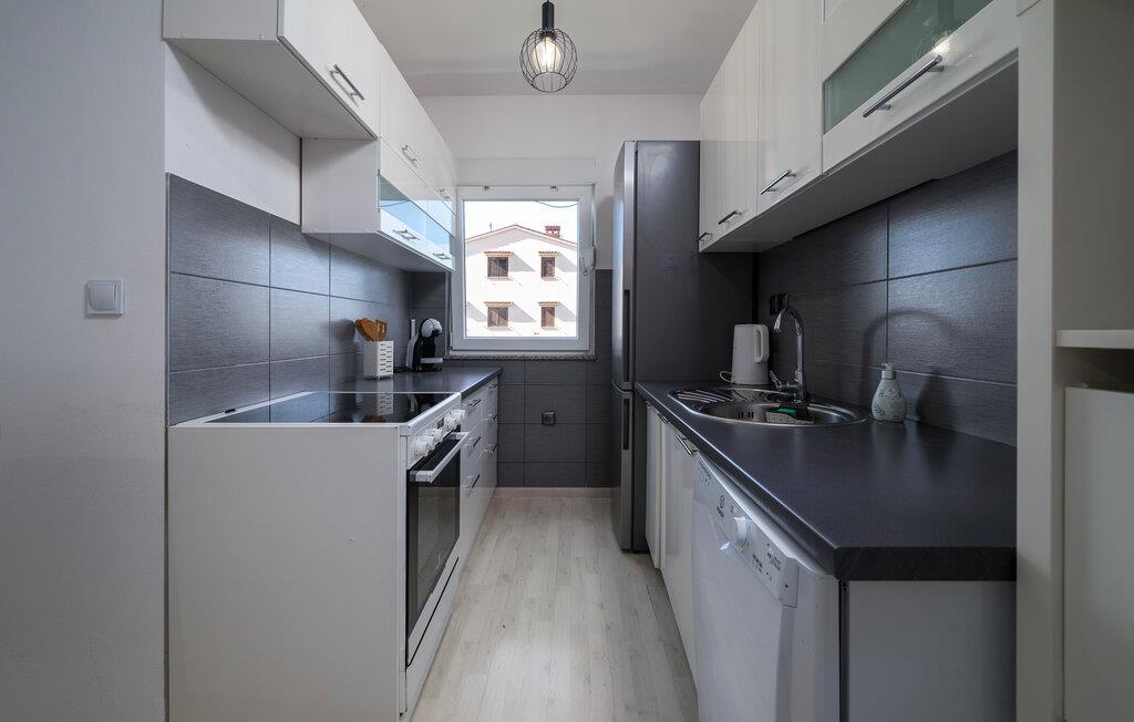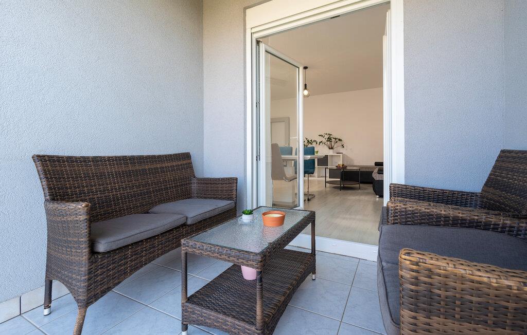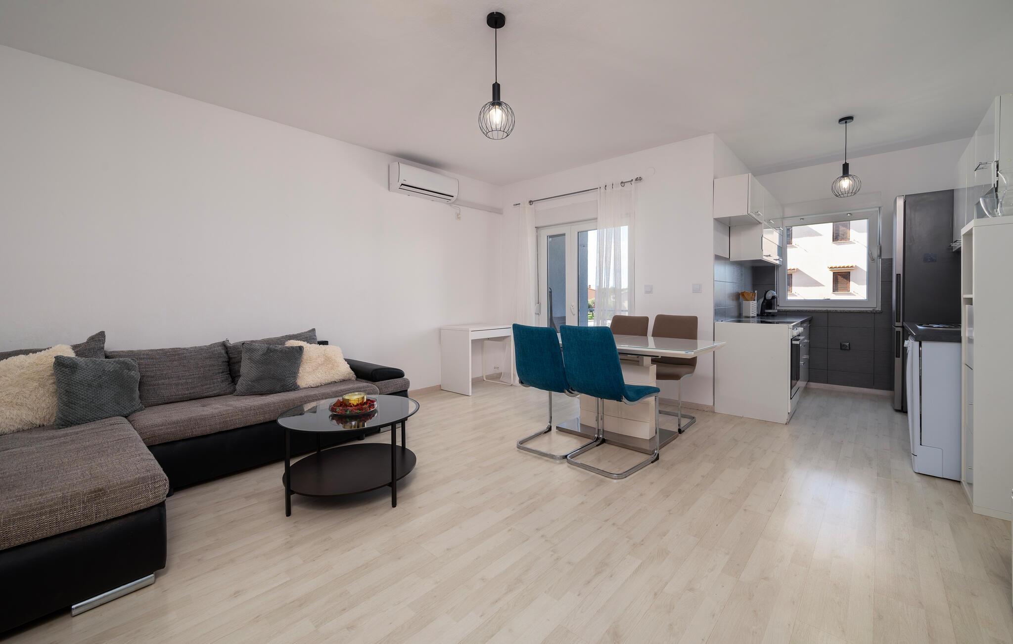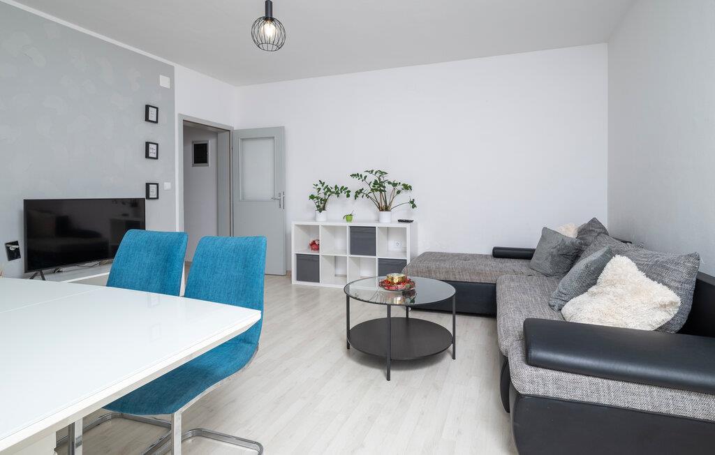Den moderne innredede og lyse leiligheten ligger bare en kort spasertur fra stranden og er ideell for en ferie med herlige timer ved sjøen. Nyt samvær og hyggelige kvelder i den innbydende stuen i den komfortable sofaen, kanskje med en god film.