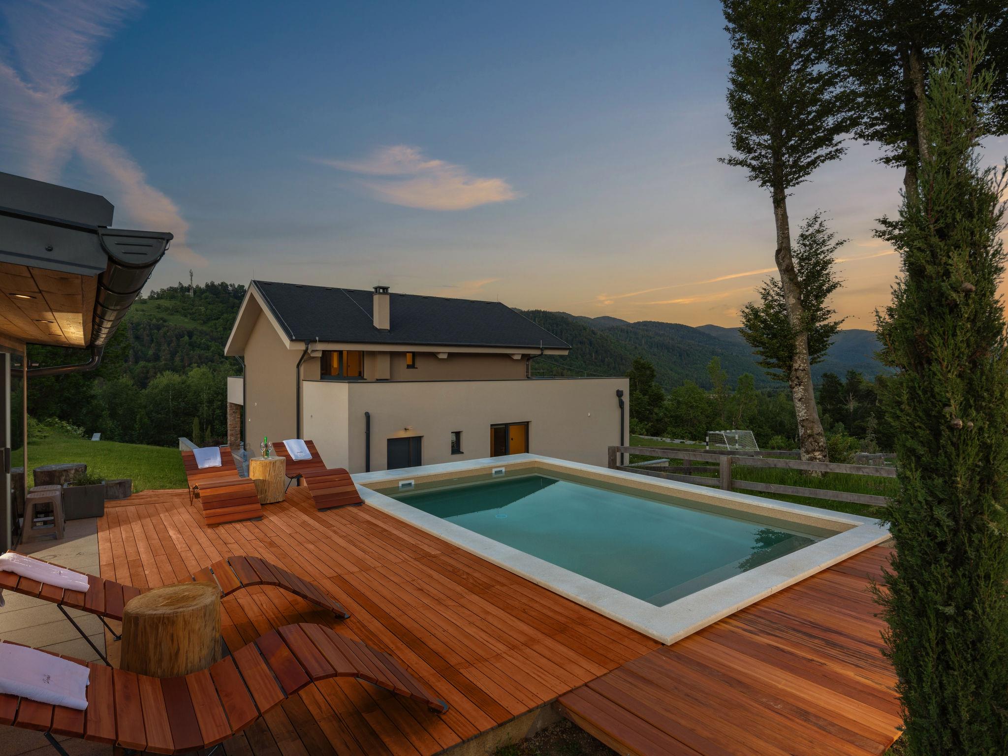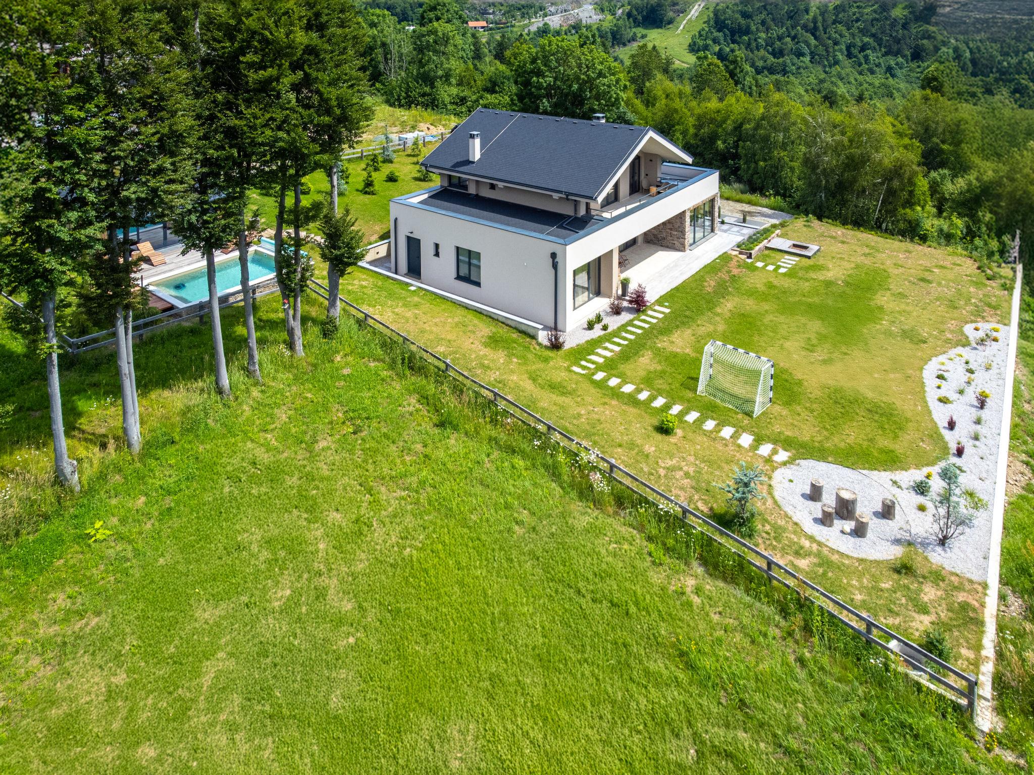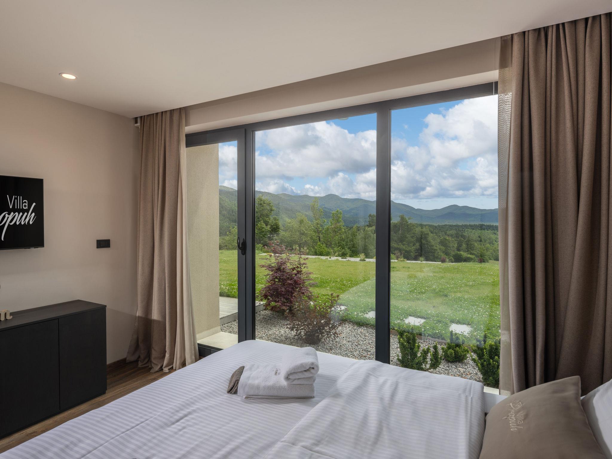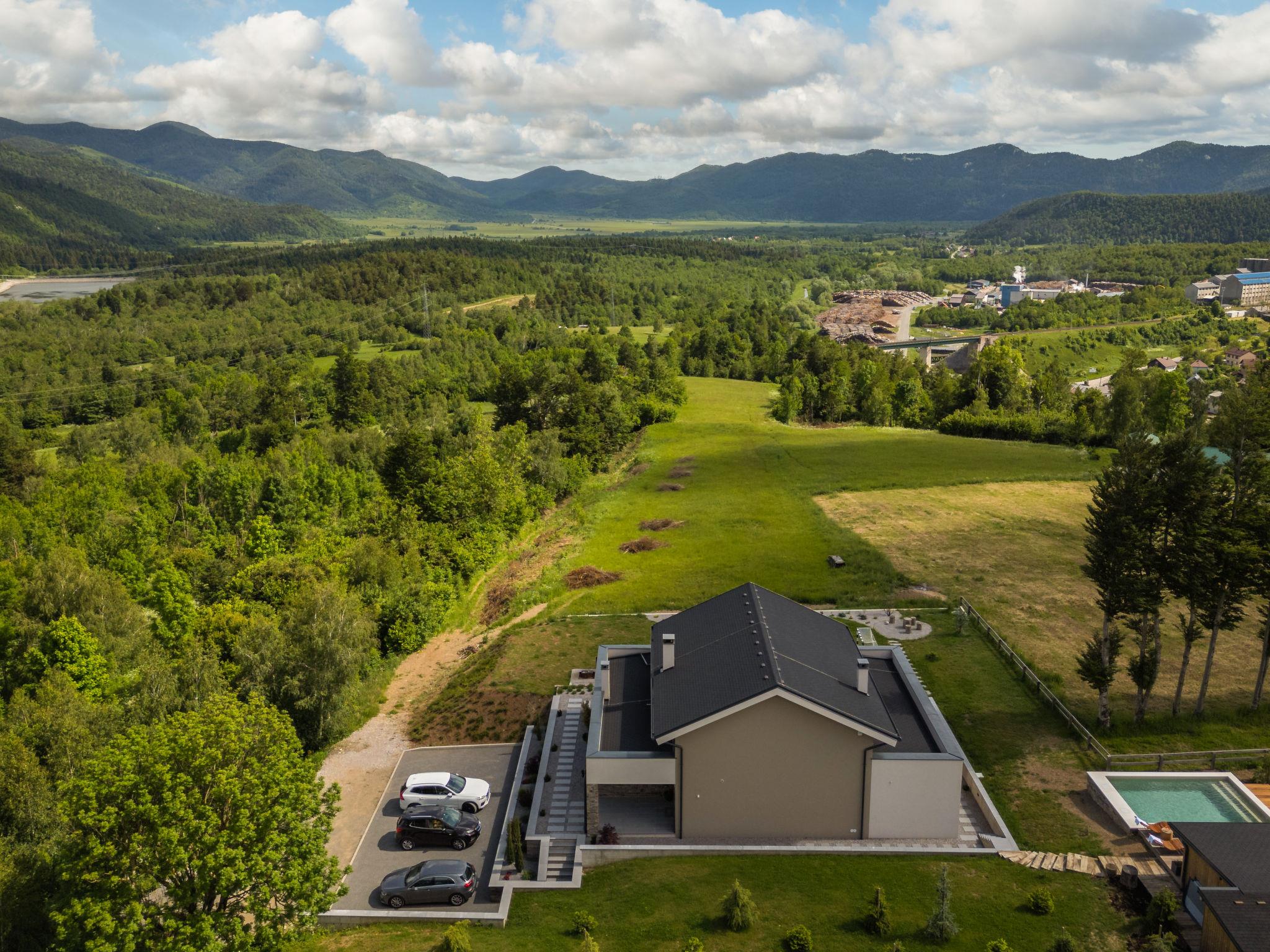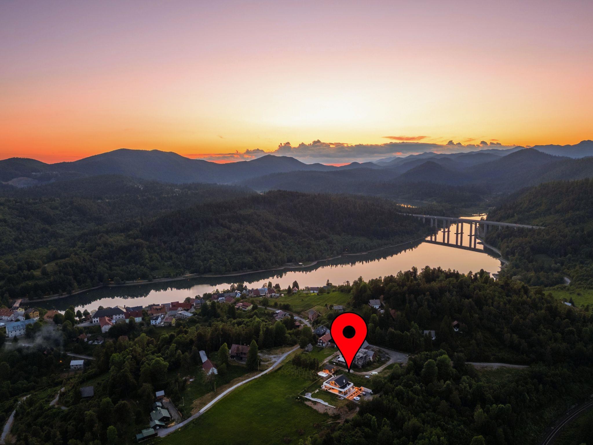 Situated just moments from Lakes Bajer and Lepenica, this villa is an ideal choice for guests seeking an active holiday in nature as well as those looking for complete peace and a break from everyday life. It features four elegant bedrooms, each with its own private bathroom and offers stunning panoramic views of Lic, the Licko Polje valley, Lake Potkoš and the surrounding peaks of Viševica and Kobinjak. Modern, beautiful villa "Propuh", 2 storeys, built in 2024. 800 m from the centre of Fužine, in a quiet, sunny, elevated position, 27 km from the sea, 1 km from the lake, 27 km from the beach. Private: property 1'900 m2, swimming pool angular, heated (6 x 4 m, depth 150 cm, seasonal availability: 01.Jun. - 30.Sep.). Shower/WC in the pool area. In the house: sauna, hot tub (all included), washing machine, tumble dryer. Shop, restaurant, bakery 1 m, bus stop 1.9 km. Walking paths from the house, cycle lane 200 m.