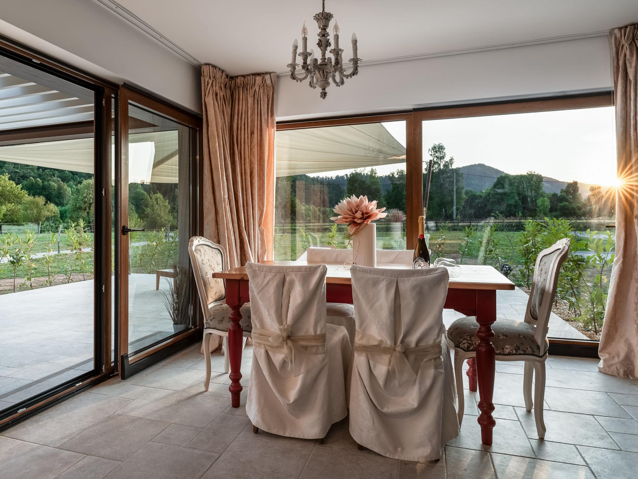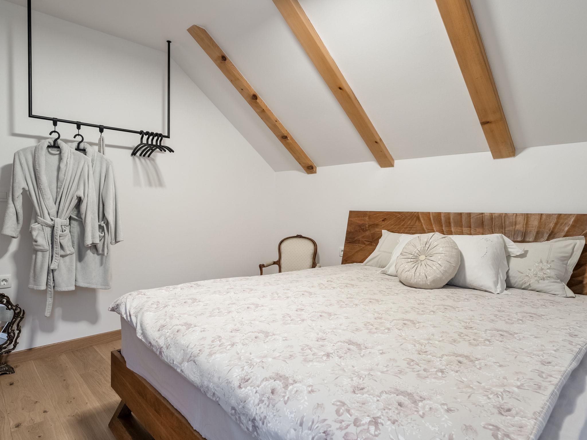 3-room house 120 m2 on 2 levels. Living/dining room with satellite TV and air conditioning. Exit to the terrace. Open kitchen (oven, dishwasher, 4 ceramic glass hob hotplates, toaster, kettle, freezer, electric coffee machine). Shower/WC. Top floor: 1 room with sloping ceilings, ceiling height 140 - 230 cm, without wardrobe with 1 french bed (180 cm, length 200 cm). Exit to the balcony. 1 room with sloping ceilings, ceiling height 140 - 230 cm, without wardrobe with 2 beds (90 cm, length 200 cm). Exit to the balcony. Bath/WC, hydro massage bath with corner bath. Balcony 6 m2, terrace 60 m2 partly roofed. Terrace furniture, balcony furniture, electric barbecue, deck chairs. View of the forest. Facilities: baby cot, hair dryer. Internet (WiFi, free). Please note: non-smoking house. Maximum 1 pet/ dog allowed.